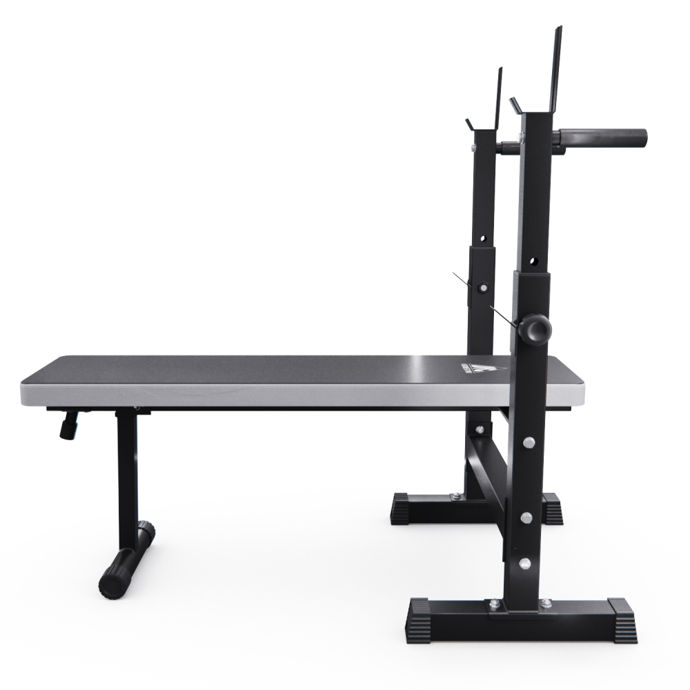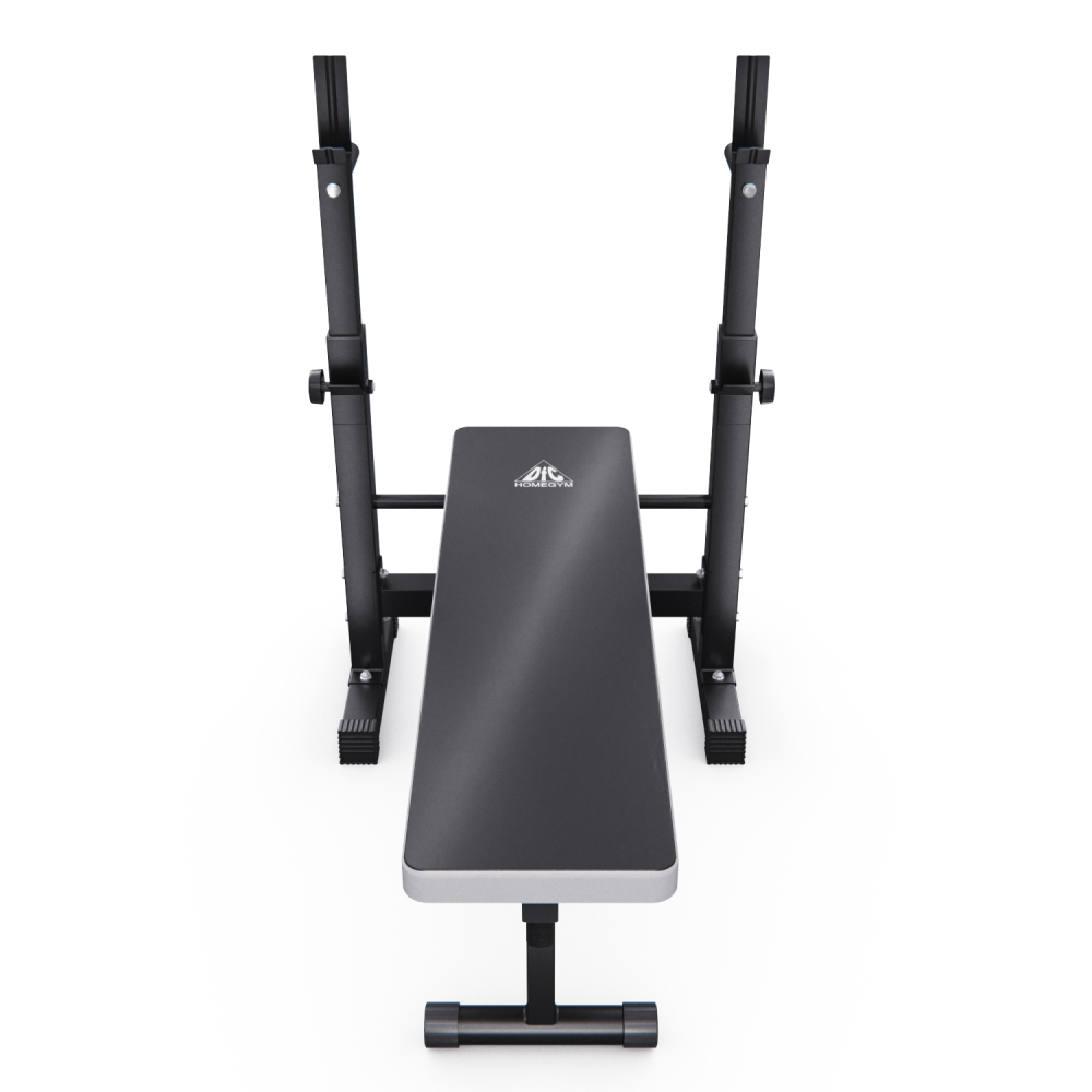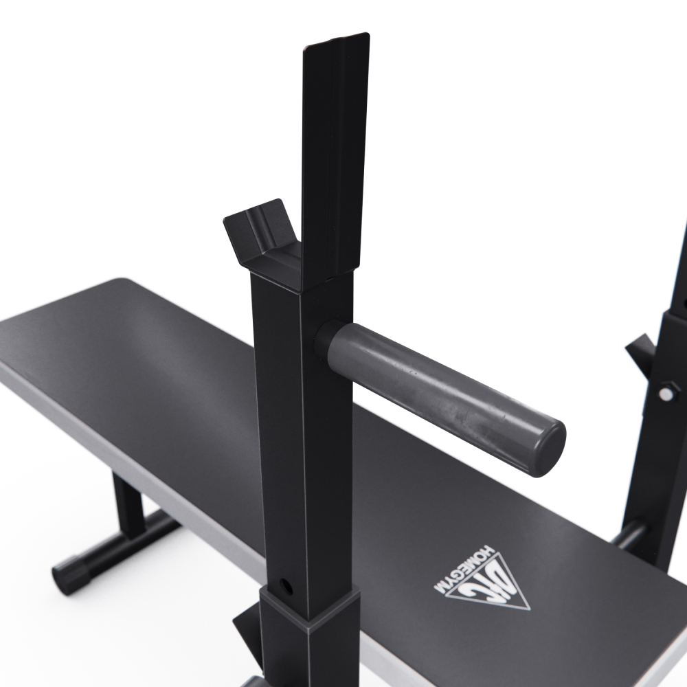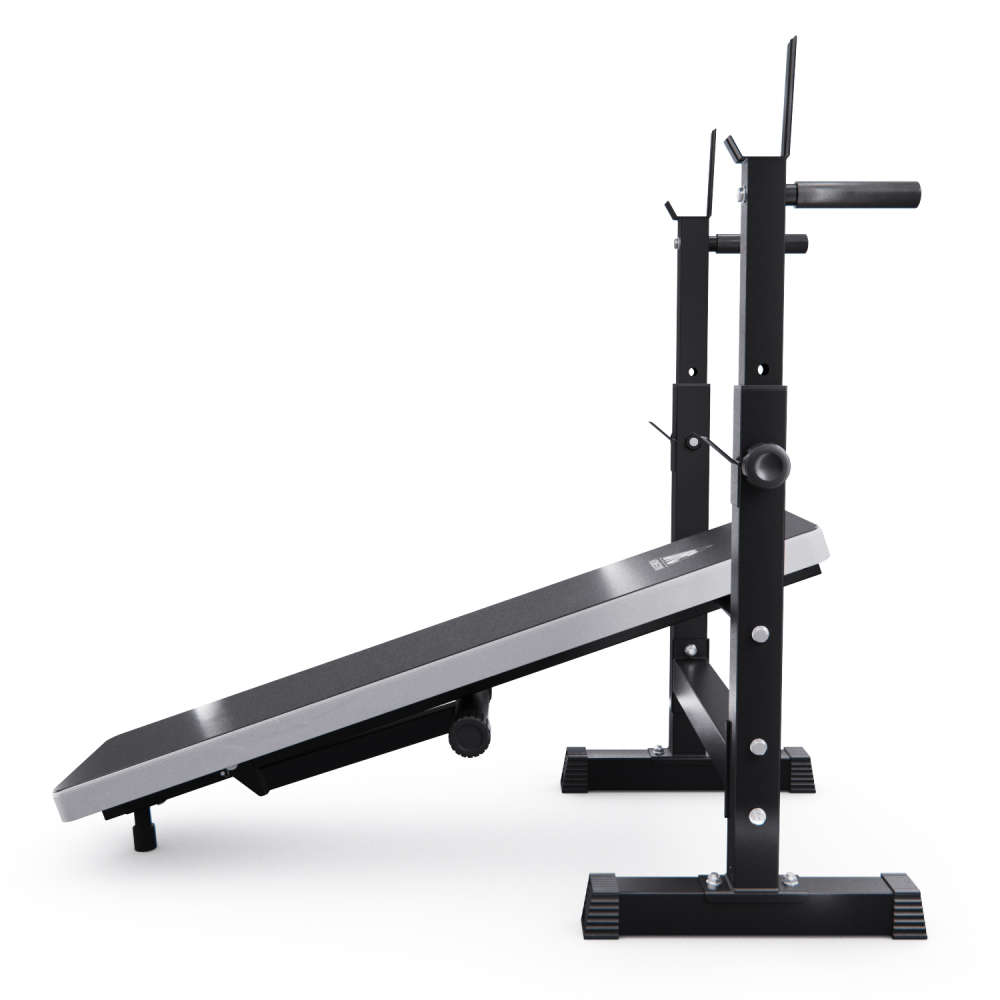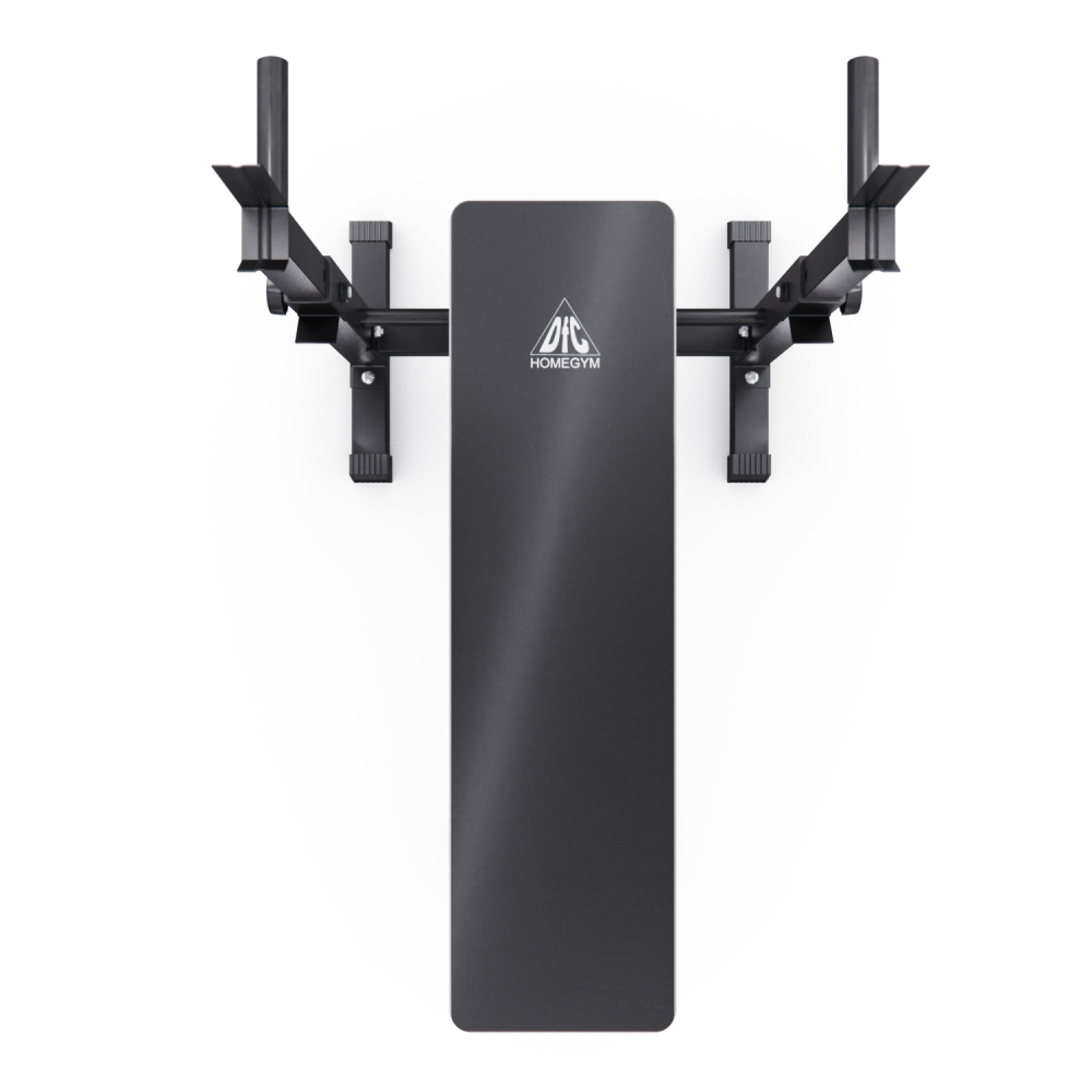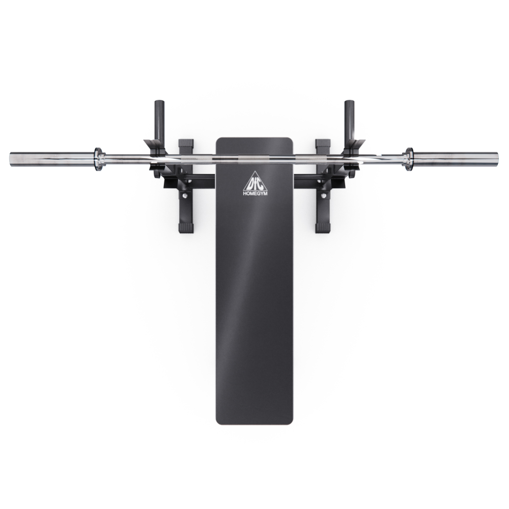Скамья силовая DFC D6453 для домашнего использования имеет складную конструкцию, компактные размеры и выдерживает до 180 килограмм веса. В комплектацию входят стойки для штанги (штанга в комплект не входит). Предназначена в первую очередь для силовых упражнений на грудь (жим лёжа). Также можно использовать для тренировки пресса, мышц рук, ног (в том числе с использованием гантелей). Оснащение скамьи Скамья представляет собой единую складную конструкцию с основанием, обтянутым нескользящей тканью благородного серого цвета. У изголовья расположены две стойки с регулируемой высотой и двумя держателями. Верхний держатель штанги имеет ширину 62,5 см. Максимальная нагрузка на верхний держатель — 120 кг, на нижний — 100 кг. На задней части стоек есть ручки для упражнений на руки. На ножках имеются противоскользящие валики и компенсаторы неровности пола. Регулировка Скамью можно отрегулировать в трёх положениях с разным углом наклона: наклон 30 градусов, горизонтальное, а также вертикальное положение (в сложенном виде). Положение скамьи в наклонном виде поддерживается специальной ножкой. Стойки регулируются по высоте в диапазон от 81 до 99 см. Доступно 6 уровней с шагом в 3 см. Для регулировки на каждой стойке имеется специальная ручка.
