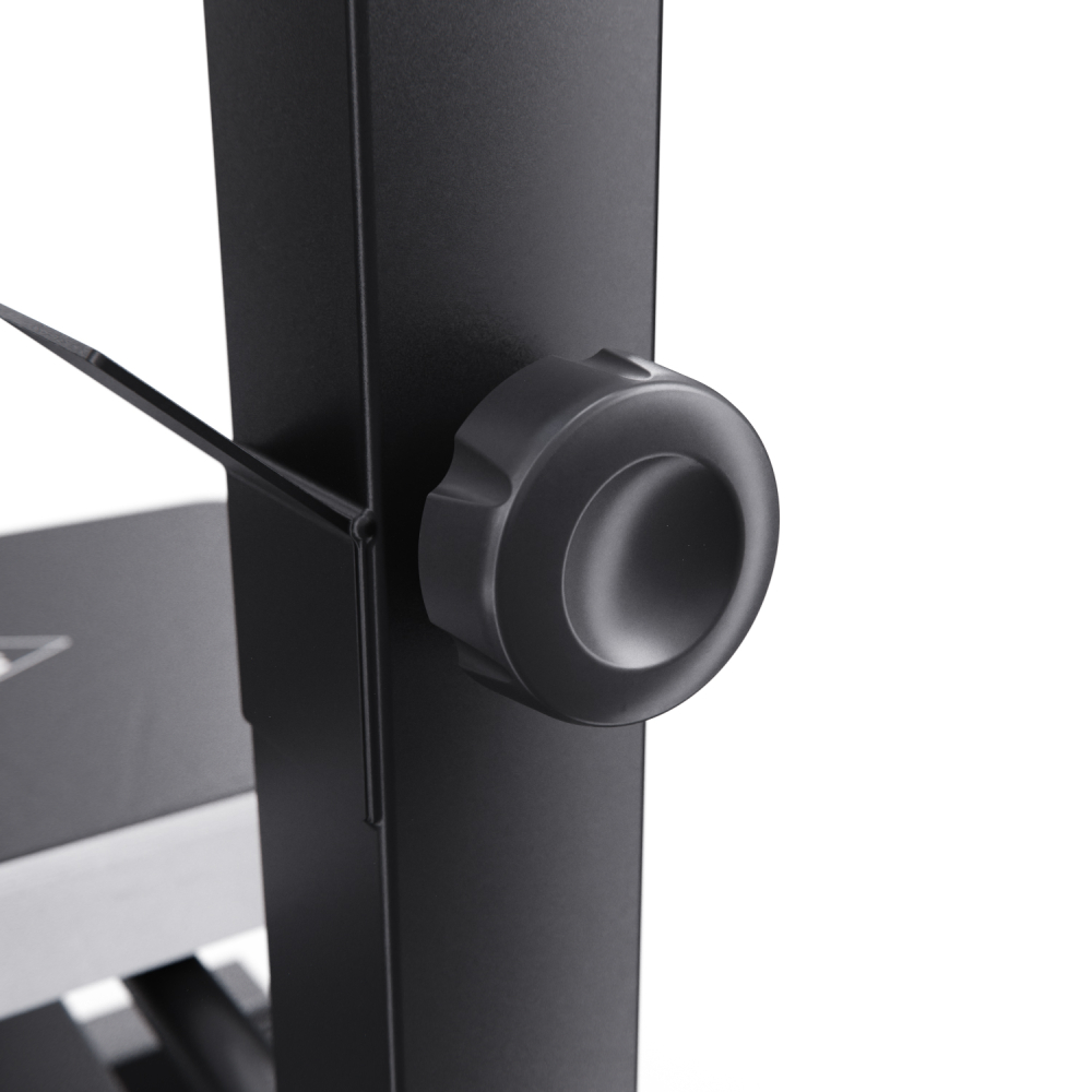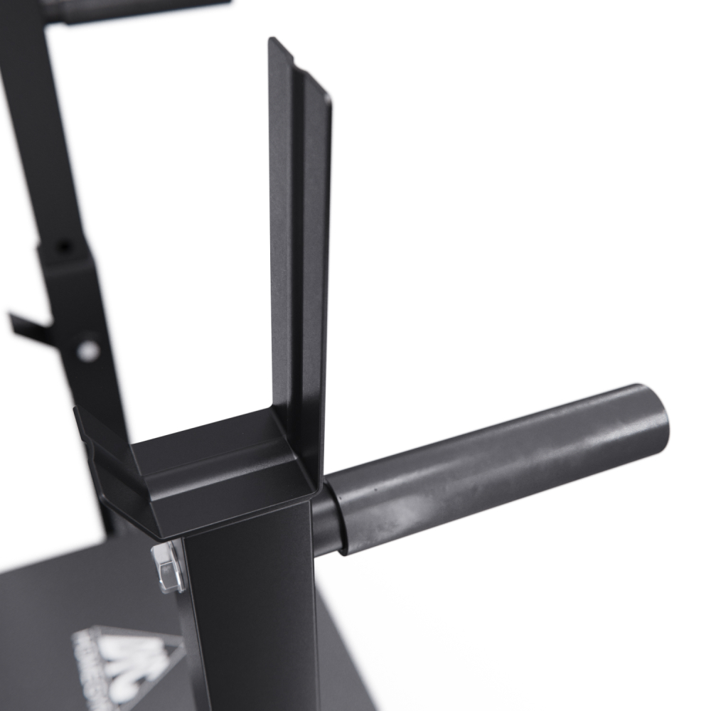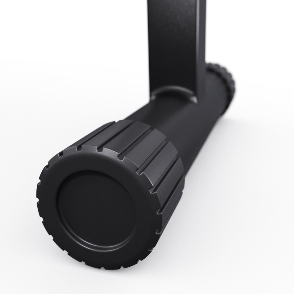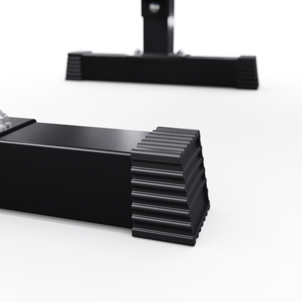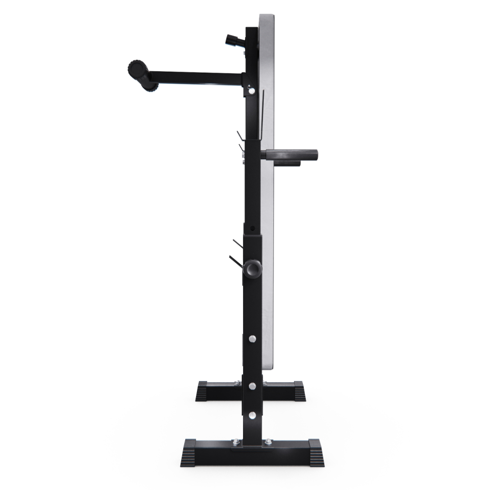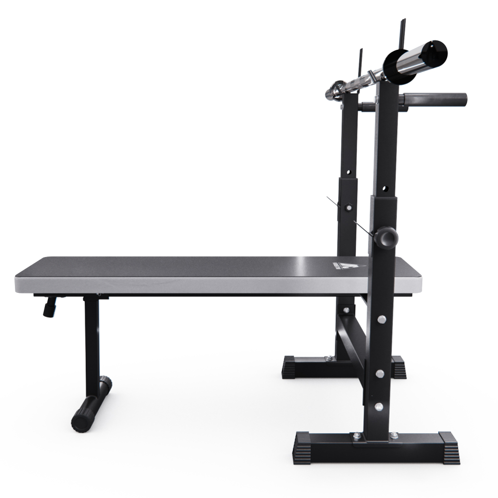 Скамья силовая DFC D6453 для домашнего использования имеет складную конструкцию, компактные размеры и выдерживает до 180 килограмм веса. В комплектацию входят стойки для штанги (штанга в комплект не входит). Предназначена в первую очередь для силовых упражнений на грудь (жим лёжа). Также можно использовать для тренировки пресса, мышц рук, ног (в том числе с использованием гантелей). Оснащение скамьи Скамья представляет собой единую складную конструкцию с основанием, обтянутым нескользящей тканью благородного серого цвета. У изголовья расположены две стойки с регулируемой высотой и двумя держателями. Верхний держатель штанги имеет ширину 62,5 см. Максимальная нагрузка на верхний держатель — 120 кг, на нижний — 100 кг. На задней части стоек есть ручки для упражнений на руки. На ножках имеются противоскользящие валики и компенсаторы неровности пола. Регулировка Скамью можно отрегулировать в трёх положениях с разным углом наклона: наклон 30 градусов, горизонтальное, а также вертикальное положение (в сложенном виде). Положение скамьи в наклонном виде поддерживается специальной ножкой. Стойки регулируются по высоте в диапазон от 81 до 99 см. Доступно 6 уровней с шагом в 3 см. Для регулировки на каждой стойке имеется специальная ручка.