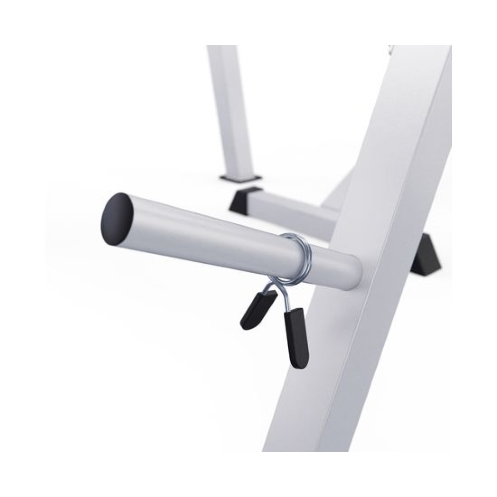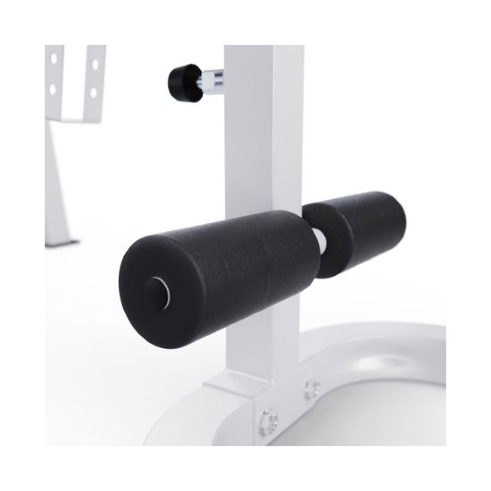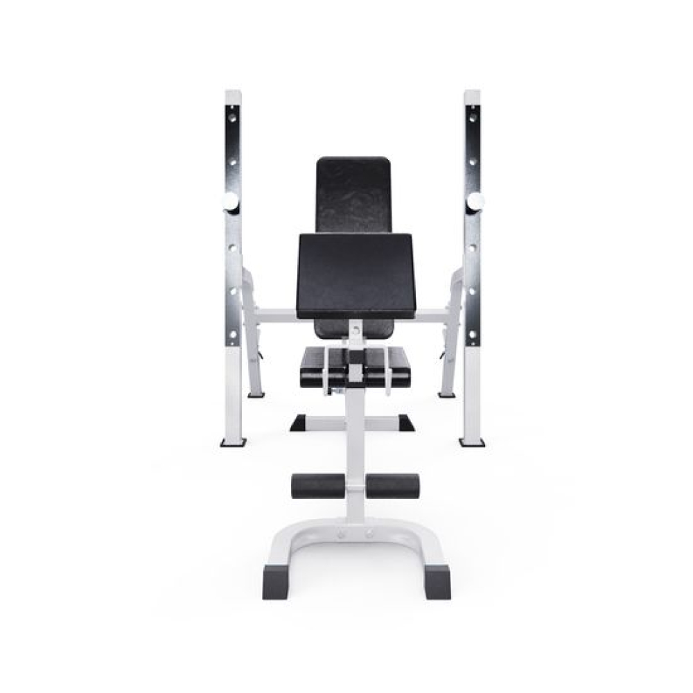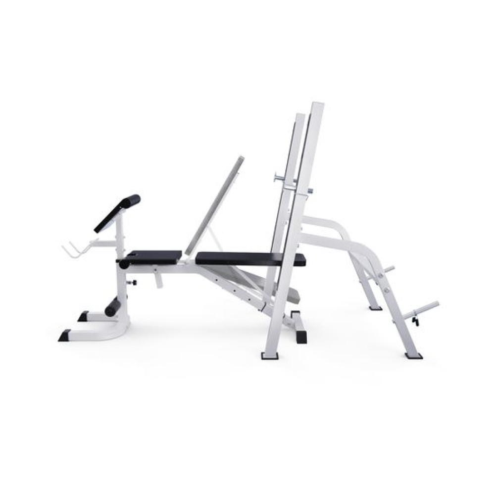 Скамья со стойками под штангу с партой DFC GORILLA белого цвета — это удобный и функциональный тренажёр для домашних тренировок.Максимально допустимая нагрузка на спортивную скамью составляет 250 кг. Нагрузка на парту может достигать 100 кг, а нагрузка на держатели под штангу составляет 100 кг.Высота держателей под штангу регулируется на 6 уровней от 46,5 до 138,5 см, что обеспечивает комфорт во время выполнения упражнений и позволяет настроить тренажер под себя.Размер спинки 74 х 24 см, а сиденья 37 х 32 см. Благодаря возможности регулировки спинки на 7 уровней и сиденья на 4 уровня, этот тренажёр подойдёт для людей с разным ростом и уровнем физической подготовки. Парта размером 44 х 29 см регулируется на 4 уровня по высоте, что помогает сделать ваши тренировки еще более удобными.Скамья для жима имеет посадочное место для хранения дисков 25 мм. Длина посадочного места равна 20 см, а в комплекте идут 2 пружинных замка.Благодаря прорезиненым ножкам скамья спортивная домашняя устойчива, не скользит при выполнении упражнений, а также не царапает пол.