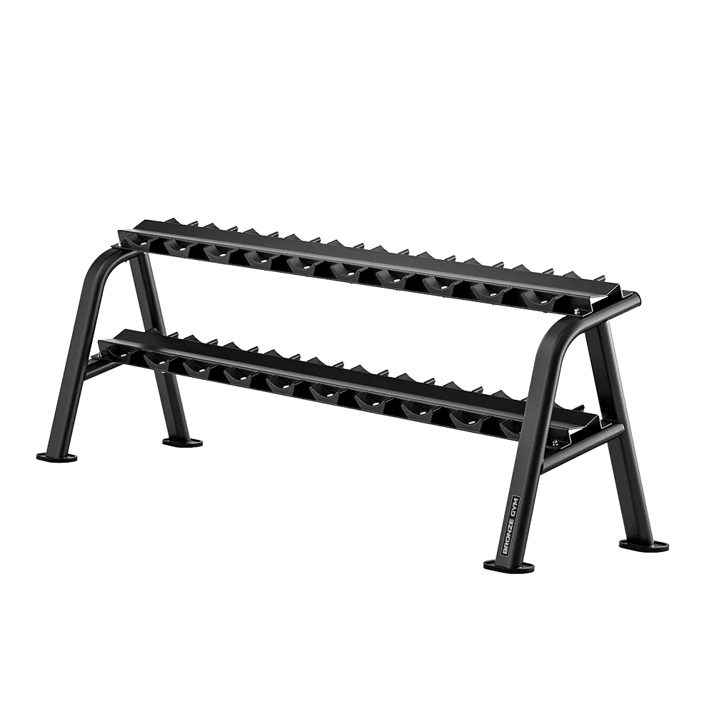 BRONZE GYM RAVE RE58 — профессиональная двухуровневая стойка, рассчитанная на хранение до 10 пар гантелей. Конструкция обеспечивает удобный и безопасный доступ к инвентарю, упрощая организацию тренировочного пространства.