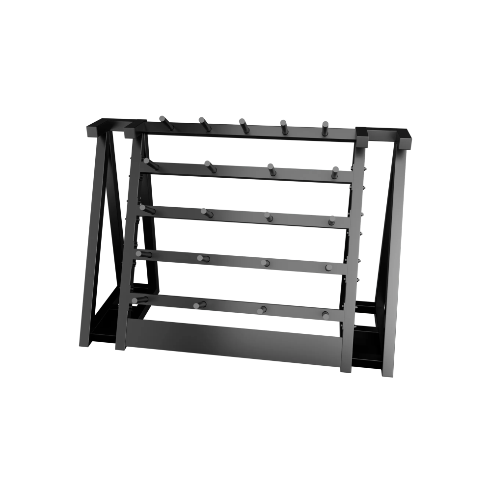 Конструкция выполнена из прочной стали и рассчитана на размещение до 20 штанг, обеспечивая порядок, быстрый доступ к оборудованию и экономию пространства в зале. Продуманная геометрия стойки позволяет равномерно распределять нагрузку, а устойчивое основание гарантирует надёжность даже при активном использовании во время групповых тренировок.