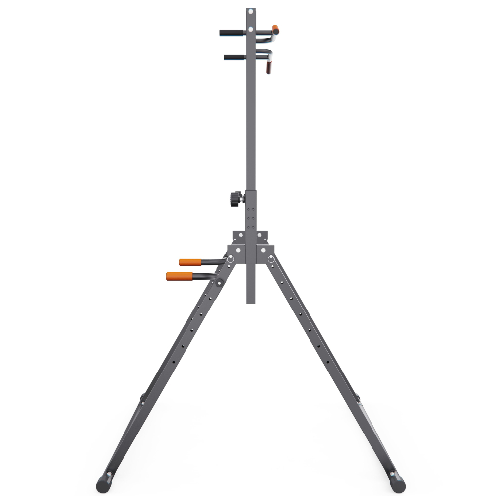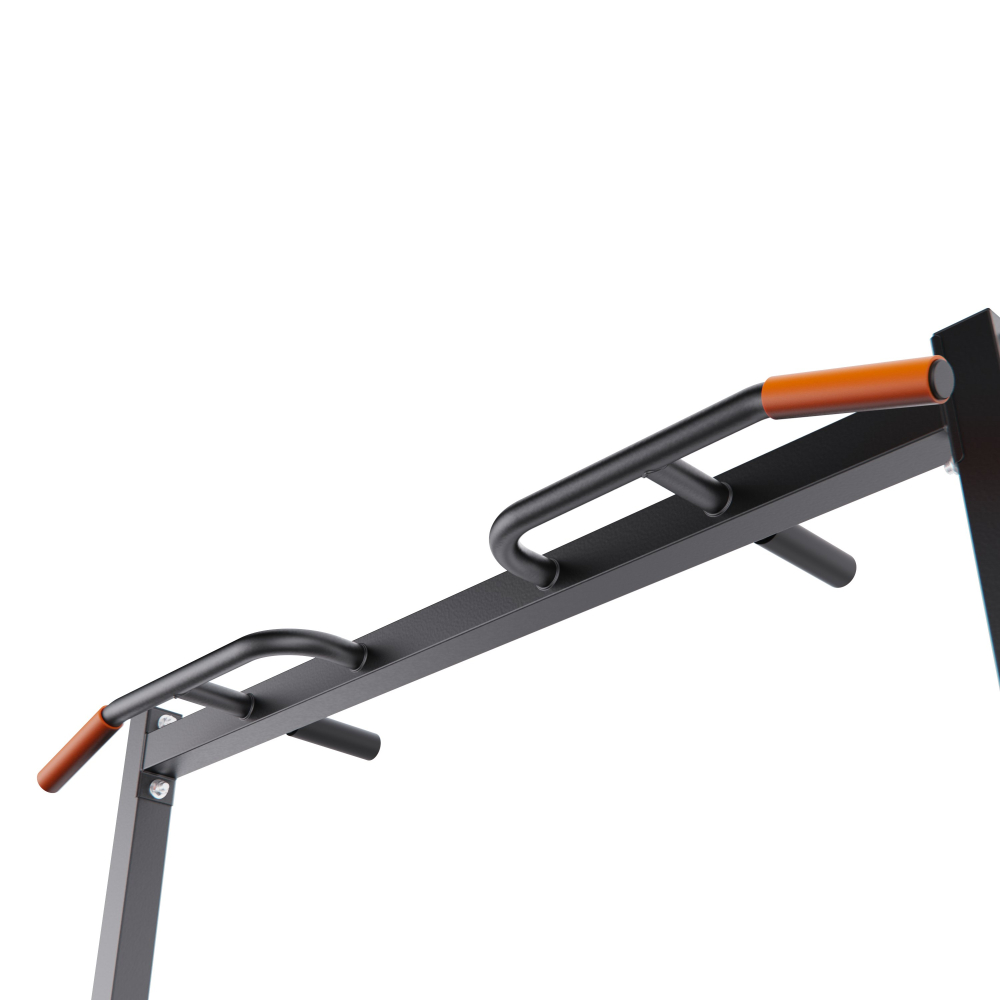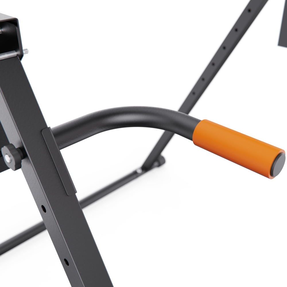 Стойка для подтягиваний и отжиманий DFC D011 эффективно прорабатывает мышцы спины, плечевого пояса, рук, а также грудные мышцы и мышцы кора — пресс и поясницу. Максимальный допустимый вес пользователя — до 150 кг. Прочная рама с профилем 50 х 50 х 1,2 мм обеспечивает устойчивость и надежность конструкции даже при интенсивных нагрузках. Конструкция дополнена многофункциональными рукоятками с правой и левой сторон, что позволяет варьировать хват и расширять возможности тренировок. Положение перекладины для отжиманий настраивается индивидуально, а удобный механизм регулировки обеспечивает быструю и простую смену высоты без лишних усилий. Верхняя перекладина для подтягиваний длиной 100,5 см с диаметром хвата 25 мм обеспечивает удобный и надежный захват. Нижняя поперечная перекладина длиной 63 см и диаметром 32 мм предназначена для выполнения отжиманий и других упражнений. Высота стойки регулируется по 7 уровням с общим диапазоном изменения 49 см. Нижняя часть рамы дополнительно имеет 8 уровней регулировки. Складная конструкция позволяет компактно хранить стойку и экономить пространство. В сложенном виде она занимает минимум места, что удобно для использования в домашних условиях. Гарантия на детали подверженные естественному износу в процессе эксплуатации — до 6 месяцев с момента установки тренажера при условии регулярного планового ТО. Важно: гарантия не распространяется на преждевременный износ из-за чрезмерной эксплуатации тренажера.