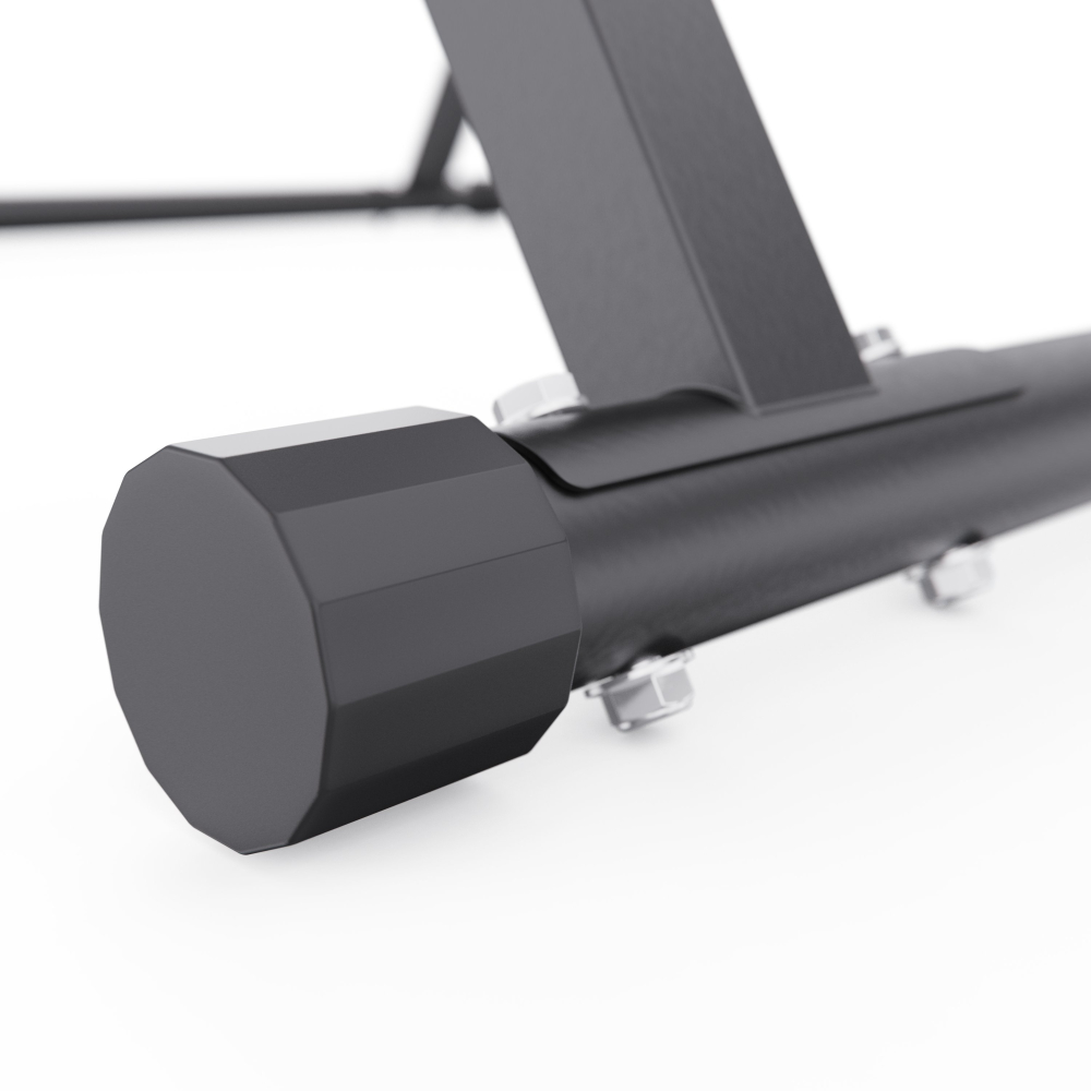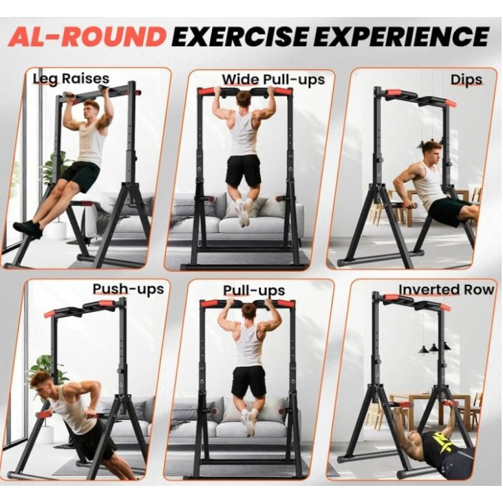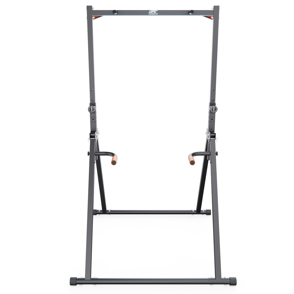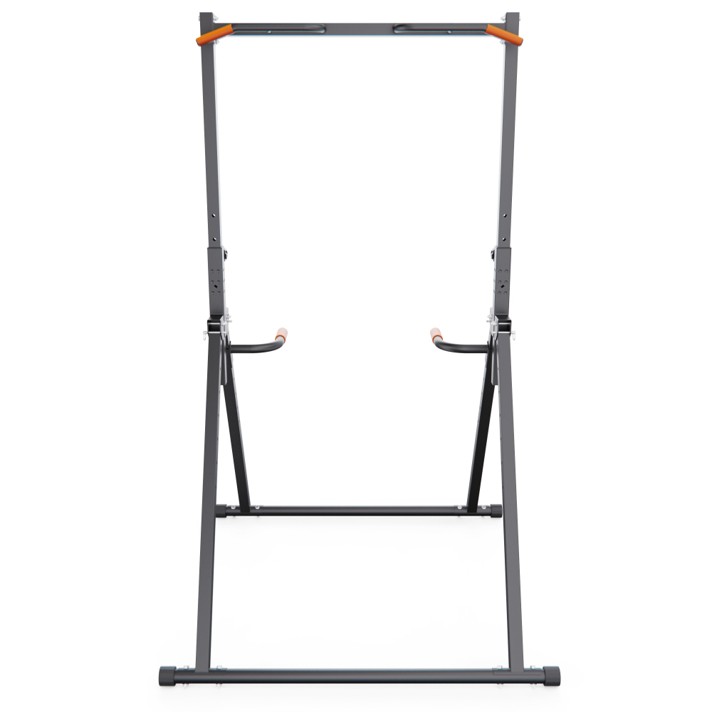 Стойка для подтягиваний и отжиманий DFC D011 эффективно прорабатывает мышцы спины, плечевого пояса, рук, а также грудные мышцы и мышцы кора — пресс и поясницу. Максимальный допустимый вес пользователя — до 150 кг. Прочная рама с профилем 50 х 50 х 1,2 мм обеспечивает устойчивость и надежность конструкции даже при интенсивных нагрузках. Конструкция дополнена многофункциональными рукоятками с правой и левой сторон, что позволяет варьировать хват и расширять возможности тренировок. Положение перекладины для отжиманий настраивается индивидуально, а удобный механизм регулировки обеспечивает быструю и простую смену высоты без лишних усилий. Верхняя перекладина для подтягиваний длиной 100,5 см с диаметром хвата 25 мм обеспечивает удобный и надежный захват. Нижняя поперечная перекладина длиной 63 см и диаметром 32 мм предназначена для выполнения отжиманий и других упражнений. Высота стойки регулируется по 7 уровням с общим диапазоном изменения 49 см. Нижняя часть рамы дополнительно имеет 8 уровней регулировки. Складная конструкция позволяет компактно хранить стойку и экономить пространство. В сложенном виде она занимает минимум места, что удобно для использования в домашних условиях. Гарантия на детали подверженные естественному износу в процессе эксплуатации — до 6 месяцев с момента установки тренажера при условии регулярного планового ТО. Важно: гарантия не распространяется на преждевременный износ из-за чрезмерной эксплуатации тренажера.
