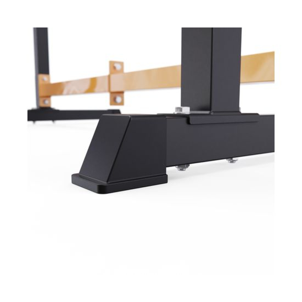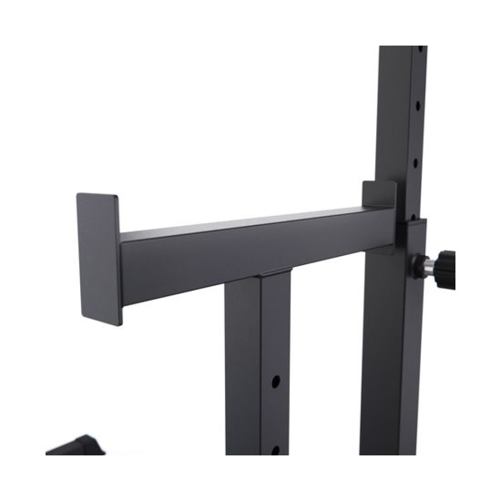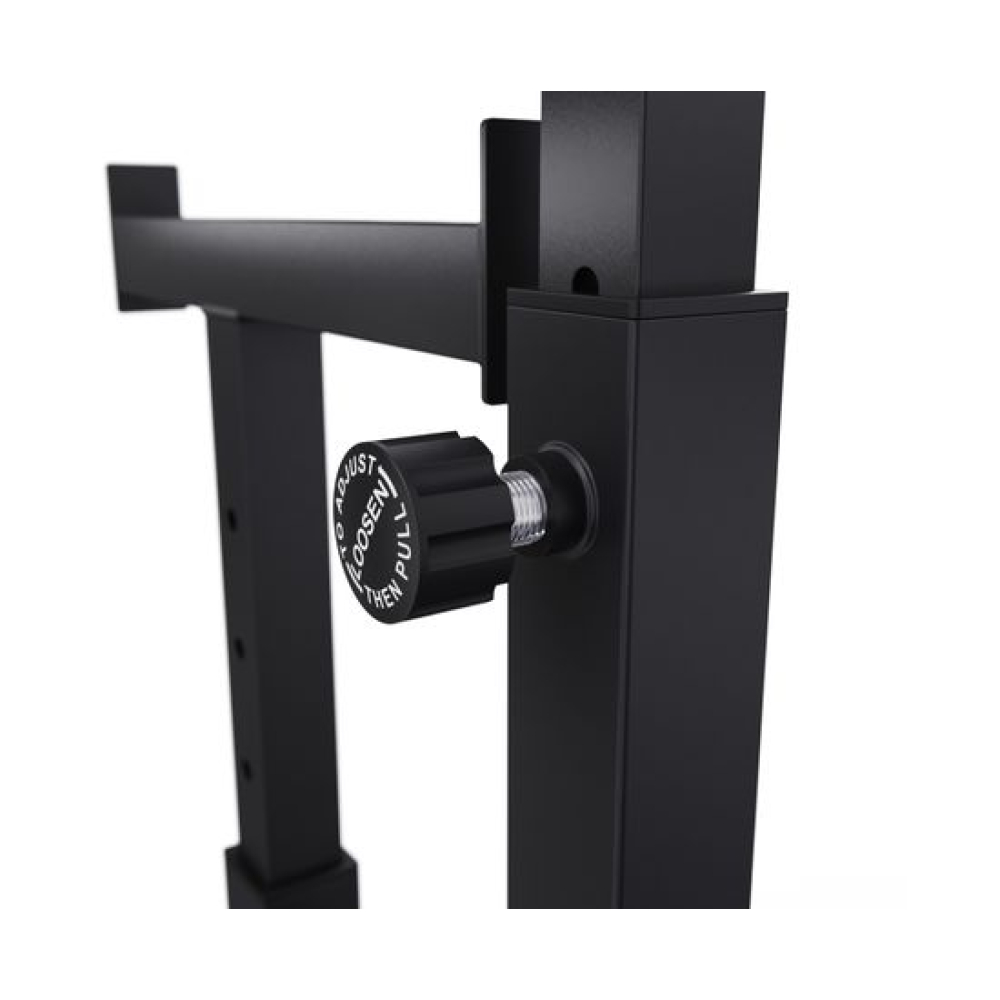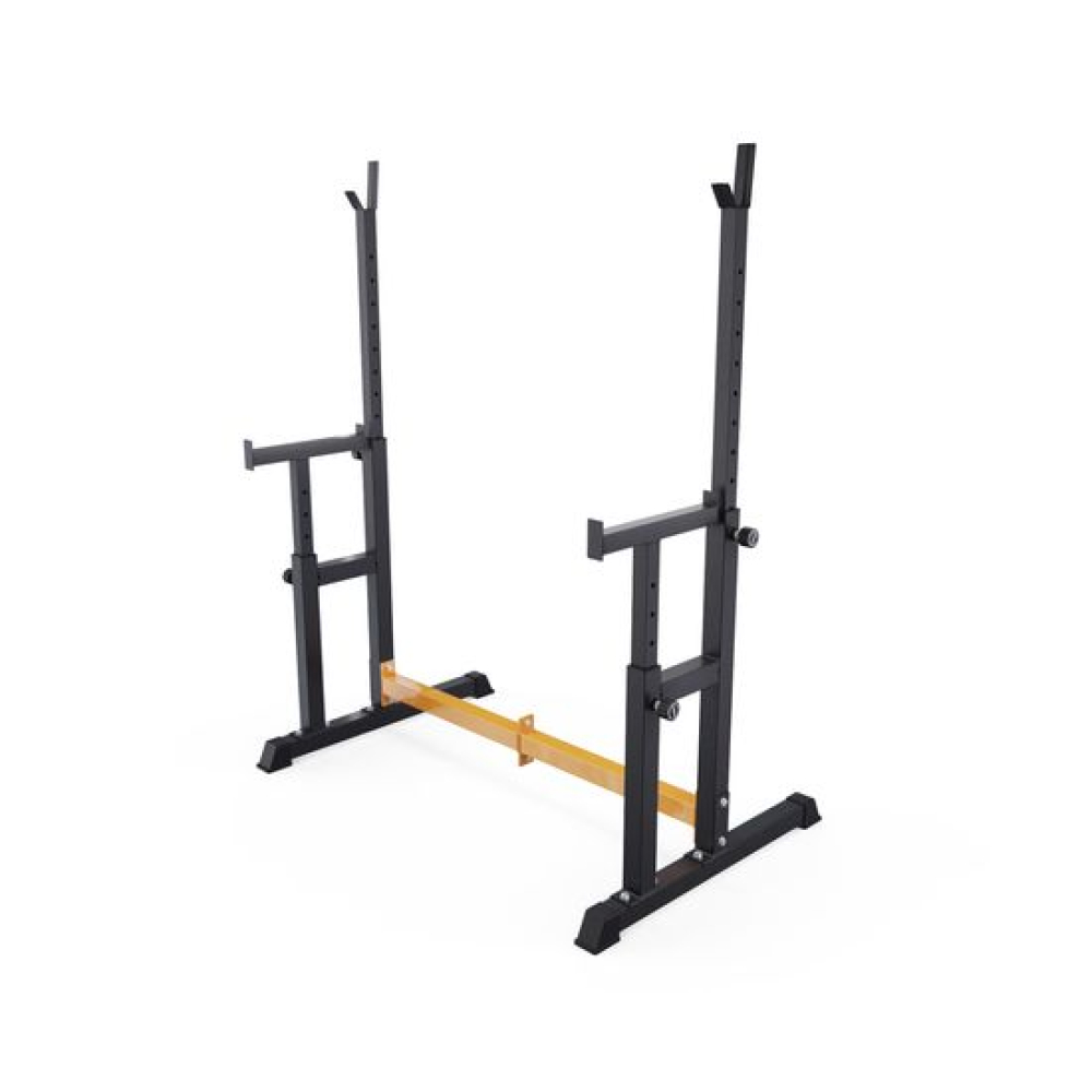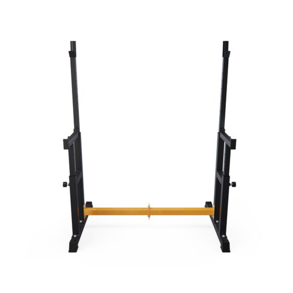 Стойка для штанги с подстраховкой DFC Y-GYM TF-62 - многофункциональная стойка для домашних тренировок. Серия Y-GYM – это тренажеры в современном дизайне, где динамичный желтый цвет гармонично сочетается с элегантным черным. Продуманная геометрия и контрастное цветовое решение позволят тренажеру гармонично вписаться в любую комнату и стать ярким акцентом вашего интерьера. Это идеальное решение для тех, кто ценит функциональность и эстетику в каждой детали своего дома.Устойчивое основание стойки для приседаний из высокопрочной профильной трубы 50 х 38 х 1,5 мм выдерживает динамическую нагрузку до 200 кг (динамическая нагрузка – нагрузка на элементы конструкции в движении). Подходит для выполнения полного спектра упражнений со штангой: от приседаний и становой тяги до жима лежа.Высота держателей под штангу легко регулируется без дополнительных инструментов при помощи ручки. Держатели под штангу регулируются по высоте на 10 уровней большая в диапазоне от 100 до 154 см, и на 5 уровней меньшая.Ширину стойки для жима можно индивидуально настроить на 67 см или 122 см. Нескользящие ножки надежно устанавливаются на полу и не царапают поверхность.