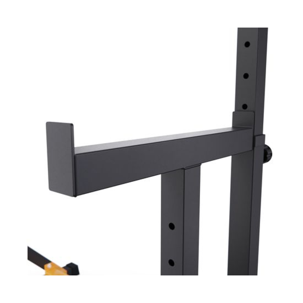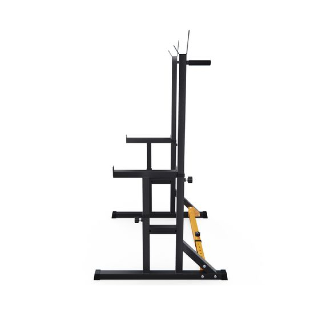 Стойка для штанги с подстраховкой DFC Y-GYM TF-63, с упорами для отжиманий - многофункциональная стойка для домашних тренировок. Серия Y-GYM – это тренажеры в современном дизайне, где динамичный желтый цвет гармонично сочетается с элегантным черным. Продуманная геометрия и контрастное цветовое решение позволят тренажеру гармонично вписаться в любую комнату и стать ярким акцентом вашего интерьера. Это идеальное решение для тех, кто ценит функциональность и эстетику в каждой детали своего дома.Устойчивое основание стойки для приседаний из высокопрочной профильной трубы 50 х 45 х 1,5 мм выдерживает динамическую нагрузку до 200 кг (динамическая нагрузка – нагрузка на элементы конструкции в движении). Подходит для выполнения полного спектра упражнений со штангой: от приседаний и становой тяги до жима лежа. Нескользящие упоры для отжиманий помогут разнообразить ваши тренировки.Высота держателей под штангу легко регулируется без дополнительных инструментов при помощи ручки. Держатели под штангу регулируются по высоте на 11 уровней большая в диапазоне от 102 до 162 см и на 5 уровней меньшая в диапазоне от 64 до 88 см.Ширину стойки для жима можно индивидуально настроить от 80 до 113,5 см. Нескользящие ножки надежно устанавливаются на полу и не царапают поверхность.