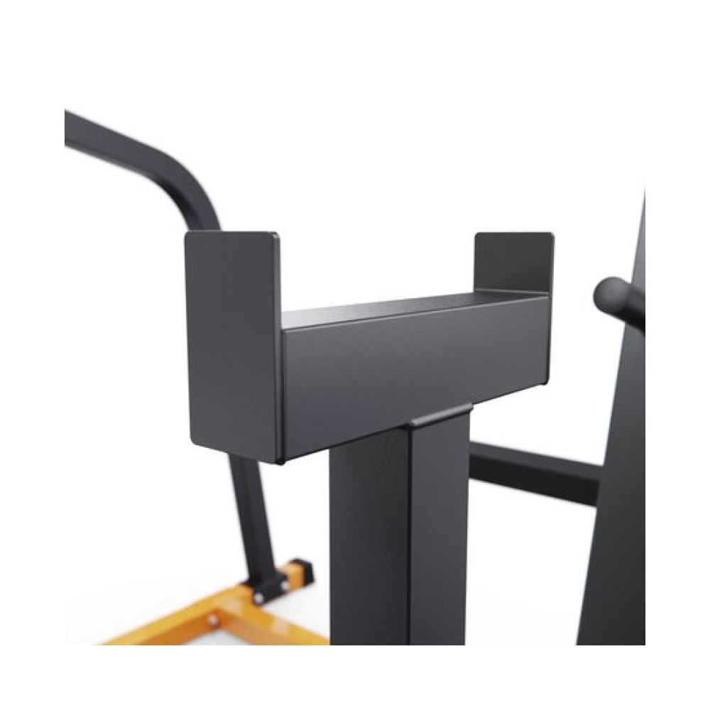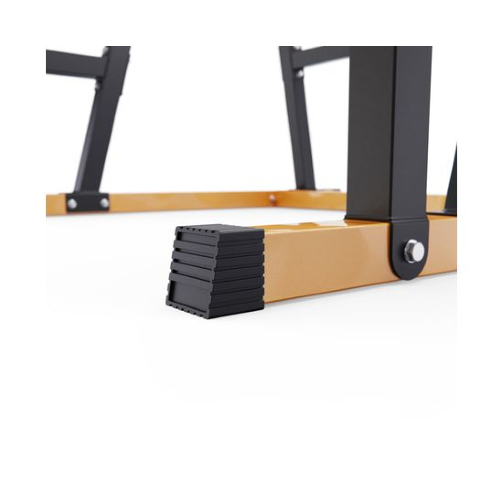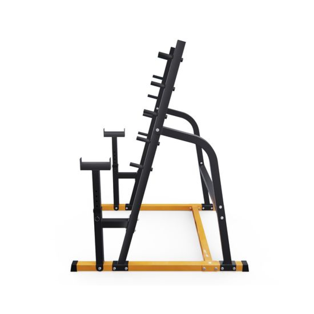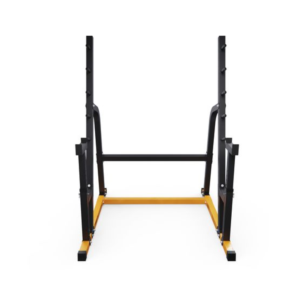 Стойка для штанги с подстраховкой DFC Y-GYM TF-64 - многофункциональная стойка для домашних тренировок. Серия Y-GYM – это тренажеры в современном дизайне, где динамичный желтый цвет гармонично сочетается с элегантным черным. Продуманная геометрия и контрастное цветовое решение позволят тренажеру гармонично вписаться в любую комнату и стать ярким акцентом вашего интерьера. Это идеальное решение для тех, кто ценит функциональность и эстетику в каждой детали своего дома.Устойчивое основание стойки для приседаний из высокопрочной профильной трубы 50 х 45 х 1,5 мм выдерживает динамическую нагрузку до 250 кг (динамическая нагрузка – нагрузка на элементы конструкции в движении). Подходит для выполнения полного спектра упражнений со штангой: от приседаний и становой тяги до жима лежа.Высота держателей под штангу легко регулируется без дополнительных инструментов при помощи ручки. Держатели под штангу регулируются по высоте на 6 уровней. Держатели у стойки для жима установлены под углом для безопасного подъема и возврата штанги на место. Нескользящие ножки надежно устанавливаются на полу и не царапают поверхность.