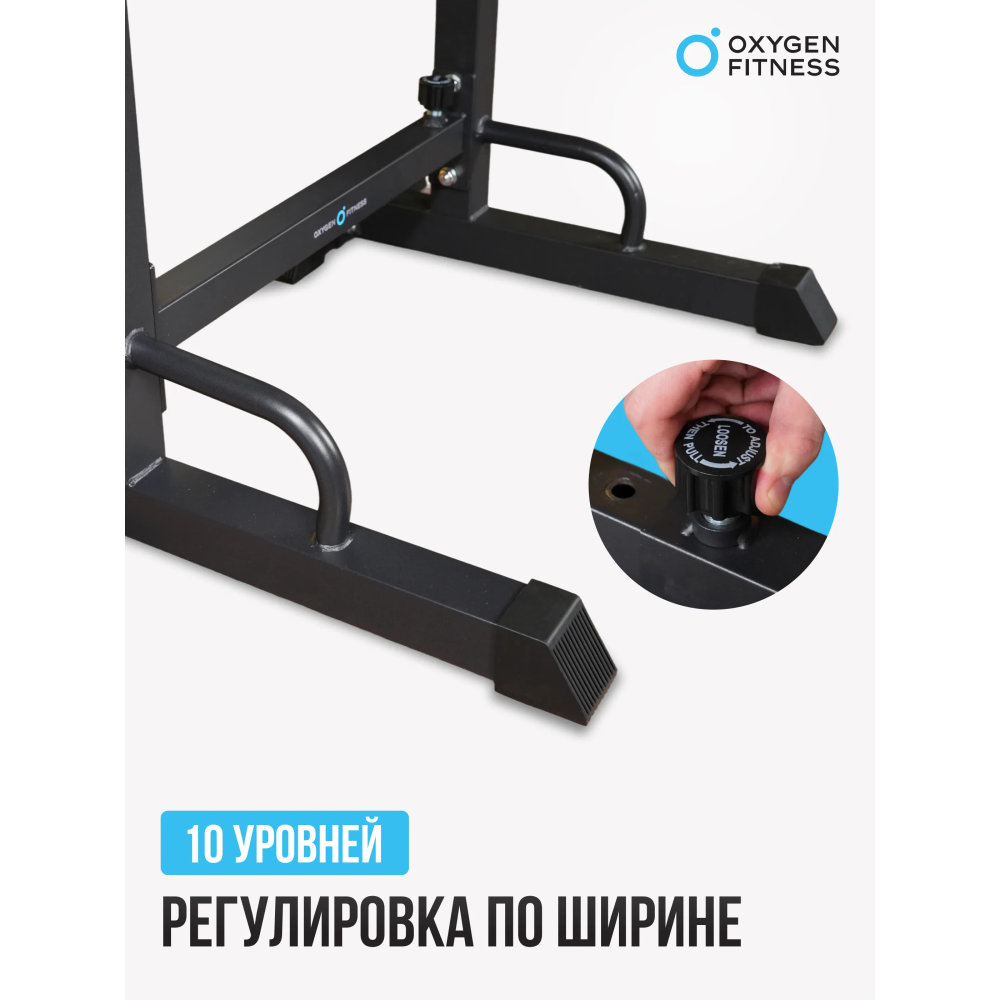 Стойка OXYGEN FITNESS RACK предлагает 12 уровней регулировки по высоте и 10 уровней по ширине, что позволяет легко адаптировать ее под ваши индивидуальные размеры и предпочтения. Это делает тренировки более удобными и эффективными. Также стойка оснащена рукоятками для отжимания и брусьями, что расширяет возможности для выполнения различных упражнений и добавляет разнообразия в ваши тренировки.