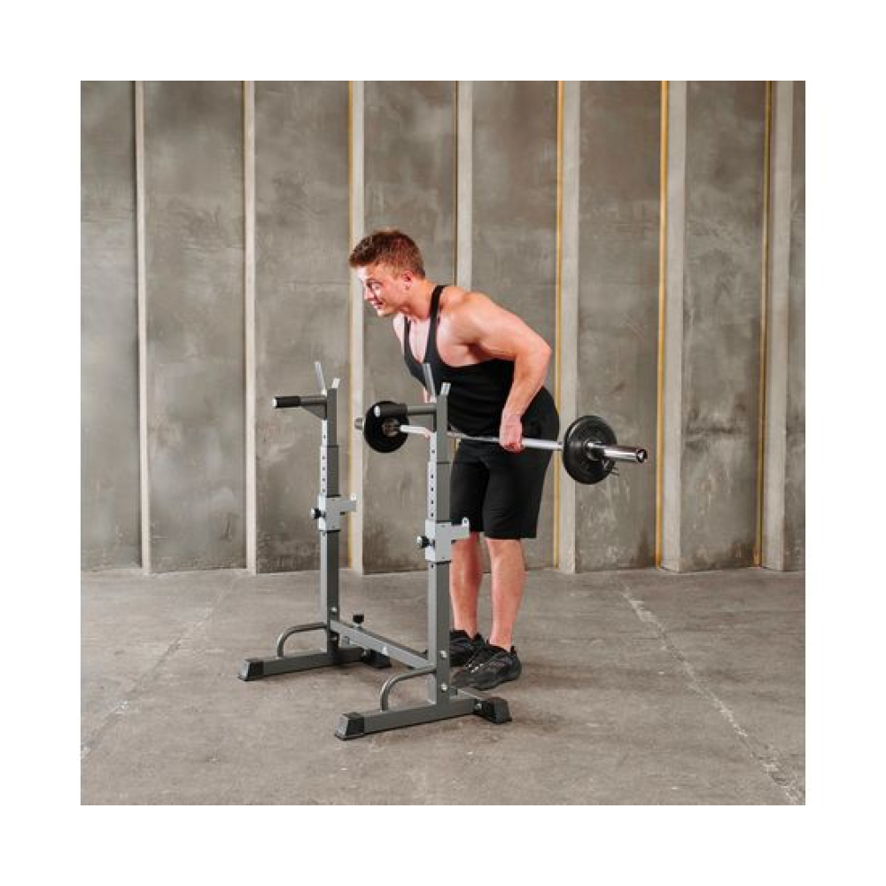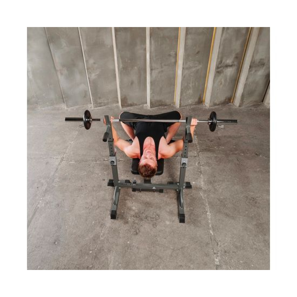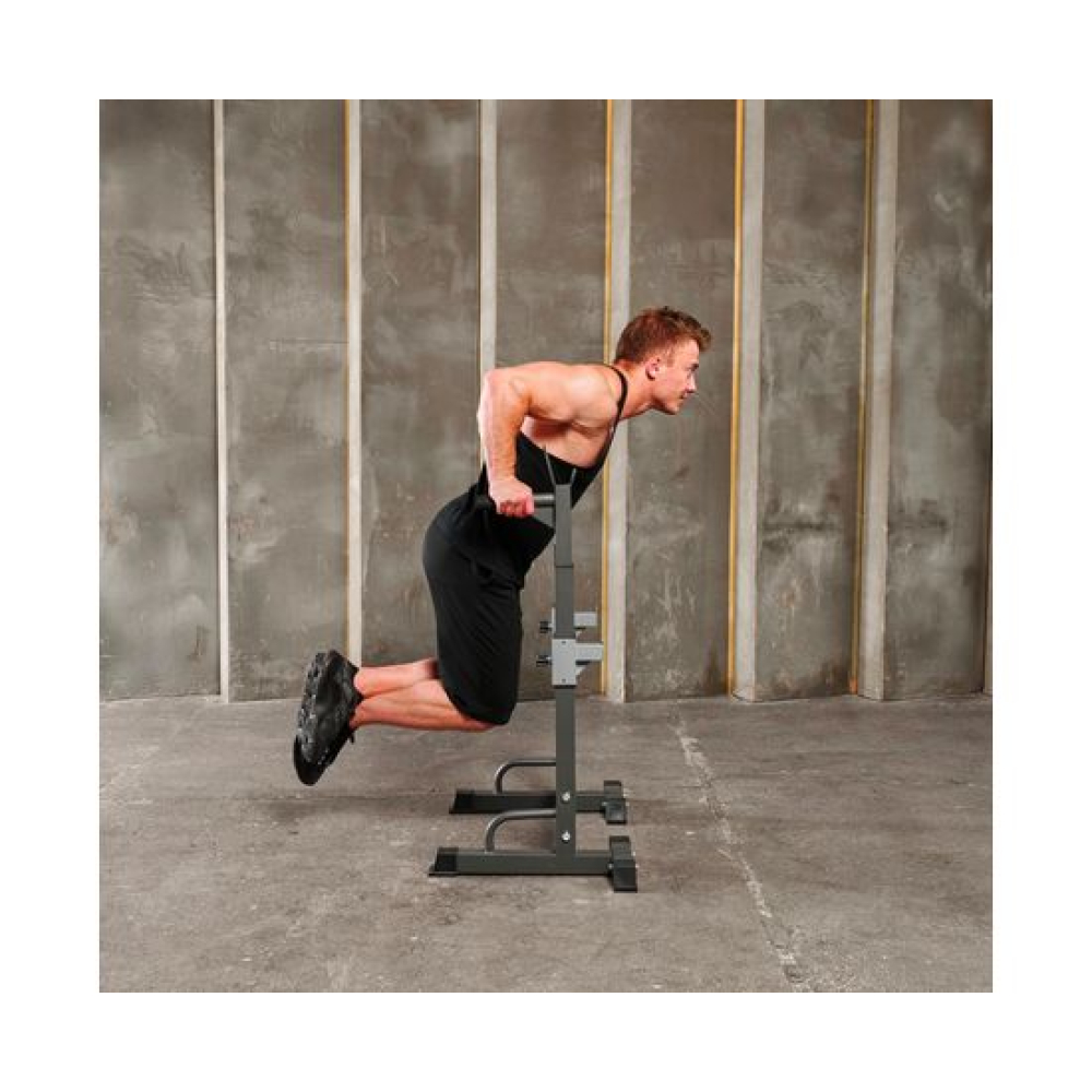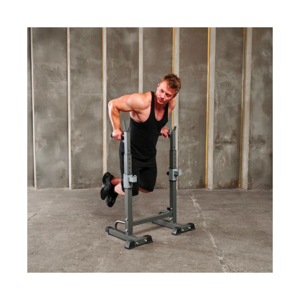 Многофункциональная стойка для домашнего спортзала. Подходит для выполнения полного спектра упражнений со штангой: от приседания и становой тяги до жима лежа. Приятное дополнение – стойки для отжиманий от пола.Устойчивое основание из высокопрочной профильной трубы выдерживает нагрузку до 100 кг. Подвижный держатель подойдет для весов до 50 кг.Высота брусьев и ширина стойки легко регулируется без дополнительных инструментов. 12 уровней на верхних ручках и 8 уровней - на нижних. Внутренняя ширина регулируется в диапазоне от 54 до 99 см.