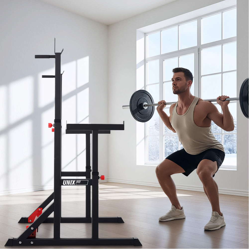 Силовые стойки UNIX Fit Frame 220 предназначены для выполнения различных упражнений со штангой весом до 220 кг: приседания, жим и другие. Плюсы силовых стоек UNIX Fit Frame 220: Регулировка уровня стойки по высоте от 106 см до 151 см (7 уровней); Регулировка стоек под штангу по ширине от 76 до 116 см; Регулировка страховочных крюков под штангу по высоте от 64 до 94 см (5 уровней); Снаряд надежно зафиксирован. Прорезиненные ложементы под штангу уменьшают шум и не оставляют механические повреждения на рукоятках; Интуитивно понятная, быстрая сборка; Надежность. Высококачественная сталь и усиленные сварные швы обеспечат безопасность; Противоскользящие накладки на ножках защитя напольное покрытие от механических повреждений и не дадут скользить тренажеру; Легко разместить в пространстве квартиры. Компактные размеры (ДхШхВ) 106х76х106 см. Для проведения эффективной тренировки рекомендуем приобрести дополнительно: Грифы и диски UNIX Fit; Скамья силовая UNIX Fit. Товар поставляется в разобранном виде. Мы с удовольствием предоставим услугу по сборке тренажера за дополнительную плату. Организуем доставку по РФ и странам СНГ. Регулярные тренировки помогут вам обрести хорошую физическую форму, получить заряд энергии и позитивное настроение! С UNIX Fit жизнь ярче!