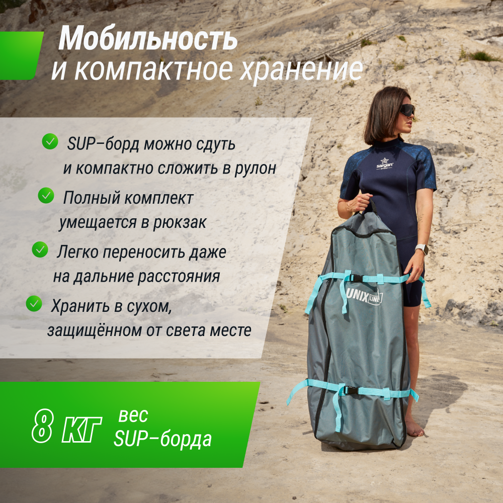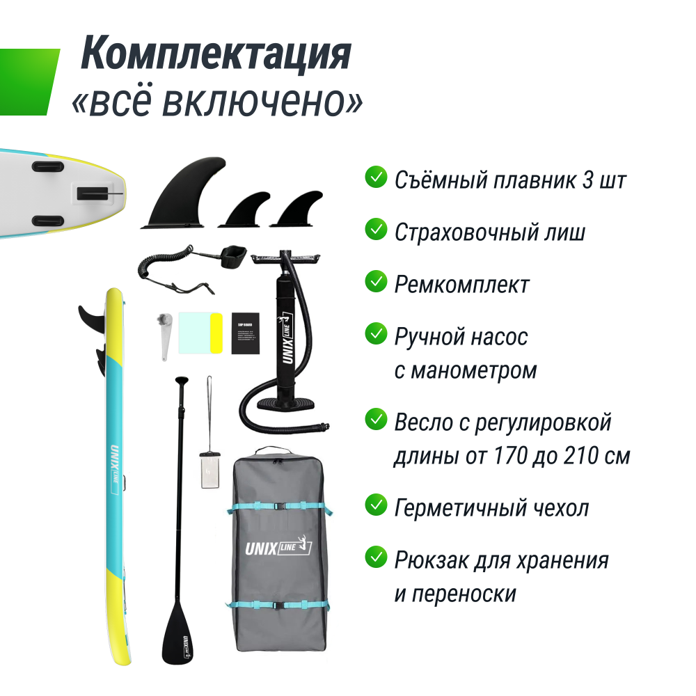 Сап-борды UNIX для профессионального и любительского сапсерфинга. Сапборд UNIX Line - идеальное сочетание активного отдыха и спокойного времяпрепровождения на воде! Надувной двухслойный SUP-борд станет вашим верным спутником в любых приключениях на воде! Прогулочная САП-доска предназначена для катания как на высокой волне, так и на спокойной глади. Высокие стандарты качества обеспечивают устойчивость, жесткость, долговечность и портативность. Идеально подойдет не только для опытных райдеров, но и для новичков. SUP-борд доска обладает исключительной прочностью и легкостью, благодаря использованию высококачественных материалов. Уникальная конструкция доски обеспечивает стабильность и управляемость даже в самых непредсказуемых условиях.Сочетание эргономичного дизайна и передовых технологий делает SUP-доску идеальным выбором как для начинающих любителей SUP-серфинга, так и для опытных профессионалов. Легко надувается и быстро собирается, что позволяет вам быстро выйти на воду и наслаждаться каждым мгновением.Большое количество ярких дизайнов позволит выбрать надувную доску, которая подчеркнет вашу индивидуальность и будет мотивировать вас к новым свершениям!Почувствуйте себя свободным с безопасным и стильным SUP-бордом от UNIX Line, наслаждаясь кристально чистой водой и живописными пейзажами! Преимущества надувных сап-бордов Семейное сап-путешествиеСап-доска подходит для водных путешествий всей семьей. Подходит для передвижения с детьми и домашними животными. В комплектацию входит страховочный лиш – это гарантия безопасности и комфорта во время сапсерфинга, кайтинга или виндсерфинга. Он обеспечивает надежное соединение между ногой спортсмена и доской. Благодаря этому серфер может сосредоточиться на безмятежной прогулке, выполнении трюков или повышении своей техники на доске, ни о чем не беспокоясь. Для профессионаловSUP-борд устойчив на воде благодаря гидродинамическим свойствам. Надувная, широкая конструкция с заостренным носом способствует быстрому, легкому ходу по прямой траектории. Модель с повышенной грузоподъемностью рассчитана на максимальный вес в 200 килограммов и подойдет для всей семьи. САП-доски UNIX оснащены антискользящим покрытием и обладают повышенными износостойкими и водоотталкивающим свойствами. Это покрытие не боится воздействия агрессивных сред, обладает прекрасным сцеплением даже при попадании большого количества влаги и служит дополнительной защитой поверхности. БезопасностьДоска сап-борд изготавливается из прочного двухслойного армированного ПВХ с плотностью 1000 den методом промышленного сваривания. По периметру доска усилена двойным слоем ПВХ. Надежна и ударопрочная конструкция с устойчивостью к проколам и механическим повреждениям. Качество SUP досок соответствует международным стандартам. Мы используем только лучшие сертифицированные материалы, это гарантирует безопасность и долговечность. На все SUP доски распространяется фирменная гарантия 2 года. ДизайнСап-борды разнообразной цветовой гаммы в ярких тонах для девушек и брутальной расцветки для мужчин. Каждая доска — это отражение вашего настроения и стиля: от нежных пастельных оттенков для спокойных прогулок до динамичных и насыщенных цветов для смелых и активных. Наши сап-борды — это не просто спортивный инвентарь, а яркий ак