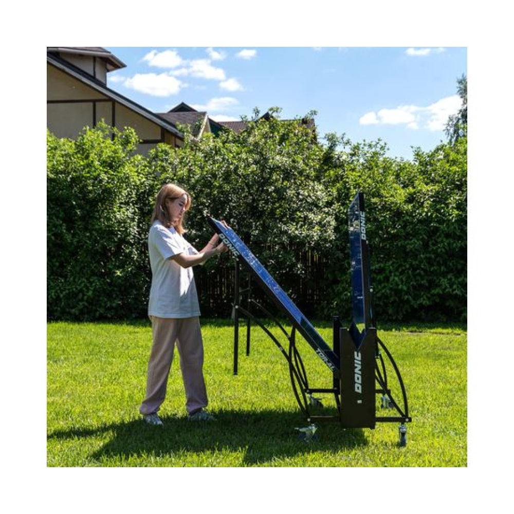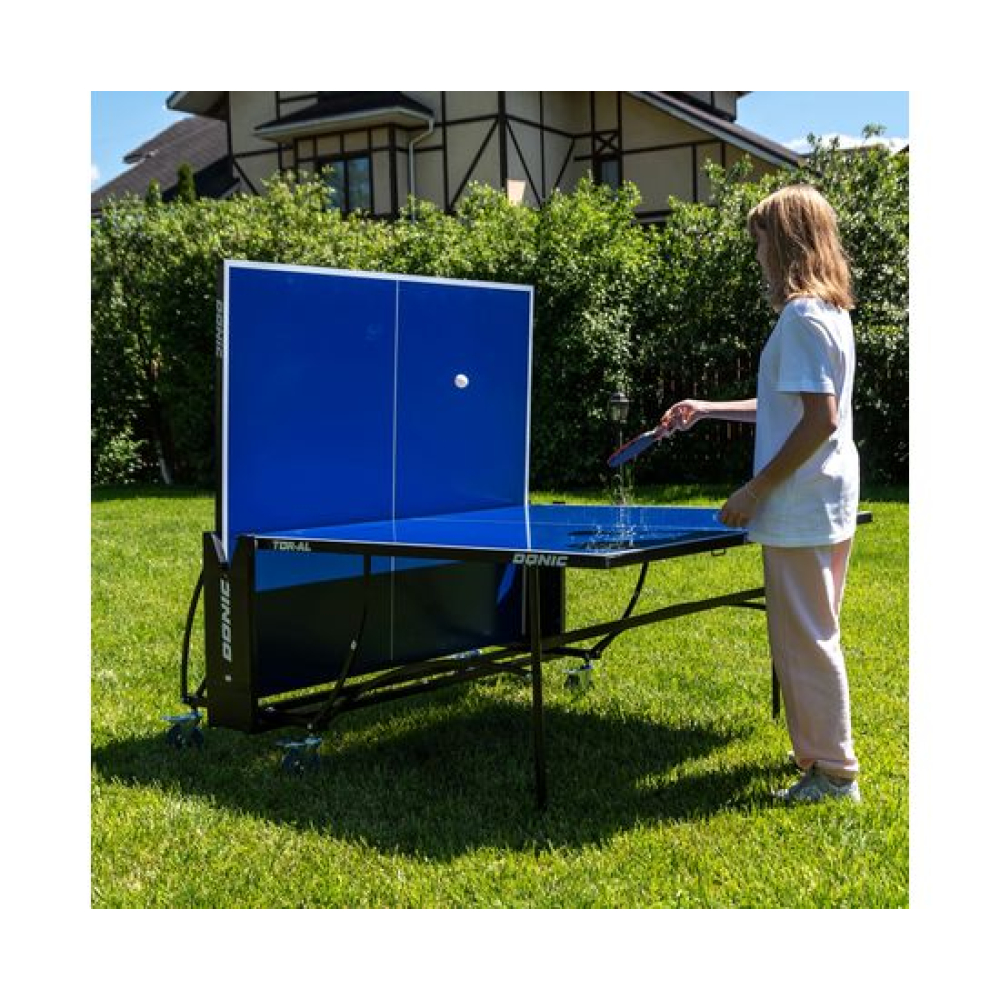 Всепогодный теннисный стол DONIC TORNADO - AL- OUTDOORИгровая плита стола из композитного материала защищена алюминиевым кантом по краю. Столешница окрашена в 5 слоёв, что обеспечивает отличную защиту от влаги и осадков. Компактная система складывания. Сетка в комплекте. Стол имеет компенсаторы высоты. Наличие блокиратора в механизме складывания.Конструкция стола позволяет сложить половину и играть одному. Транспортировочные ролики в количестве 4 штук с фиксаторами.