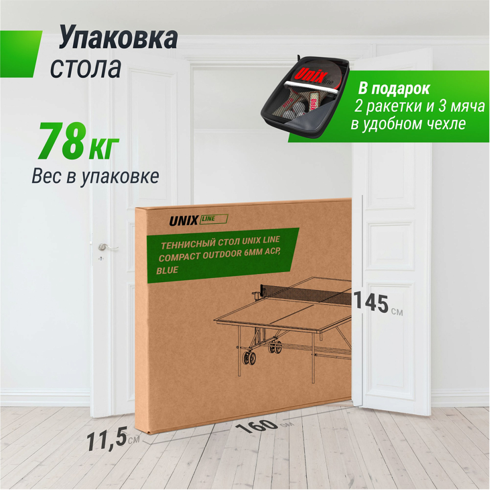 Всепогодный теннисный стол UNIX Line Compact Outdoor 6mm ACP станет вашим надежным партнером для игр на улице, позволяя насладиться активным отдыхом. Высококачественный игровой стол идеально подойдет для любителей настольного тенниса, которые хотят провести время с друзьями и семьей, а также для организации дружеских матчей на свежем воздухе. Игра в пинг-понг является отличной кардионагрузкой, которая помогает улучшить работу сердечно-сосудистой системы, повысить выносливость и эффективно сжигать калории. . Игра требует высокой координации движений, благодаря чему улучшается моторика и реакция спортсмена . Размер универсального теннисного стола UNIX Line Compact Outdoor соответствует стандарту ITTF 274 х 152.5 х 76 см. Стол для пинг-понга изготовлен из высококачественного АКП и имеет столешницу толщиной 6 мм, что обеспечивает отличный отскок мяча до 23 см, делая игру более комфортной и предсказуемой. Стол не подвержен коррозии и воздействию влаги, что делает его устойчивым к различным погодным условиям. Данный материал обладает высокой стойкостью к ударам и царапинам, позволяя сохранять внешний вид стола и уберегая его от механических повреждений даже при интенсивном использовании. Матовое антибликовое покрытие теннисного стола снижает отражение света, что помогает игрокам лучше видеть мяч и его траекторию, делая игру более комфортной. Поверхность стола для пинг-понга легко очищается от загрязнений, позволяя поддерживать его в отличном состоянии. . . Стол построен на стальном каркасе 30x30 мм с толщиной 1,2 мм с антикоррозионным покрытием, что обеспечивает его жесткость и устойчивость на различных поверхностях. Опоры теннисного стола оборудованы компенсаторами неровности пола. Отличительной особенностью компактного стола для дома и улицы является возможность поднять одну сторону столешницы, позволяя играть в одиночку, что идеально подходит для оттачивания тренировки техники удара и улучшения навыков без необходимости искать партнера. Стол занимает меньше места, когда используется в режиме одиночной игры, делая его отличным выбором для небольших помещений. Предусмотрены отделения для хранения до 4-х мячей с каждой стороны . В универсальном спортивном столе используется система складывания Compact, которая обеспечивает быструю трансформацию стола, экономию пространства и надежное хранение. Система настолько проста, что с ней справится даже юный пользователь. Для транспортировки предусмотрены 4 сдвоенных маневренных колеса D155 мм с обрезиненным покрытием , поэтому стол легко передвигается в любое место без вреда для напольного покрытия. Для удобства и безопасности игровой стол оборудован надежным механизмом фиксации, который предотвращает скольжение стола во время игры. . Компактный стол для пинг-понга UNIX Line Compact Outdoor станет прекрасным дополнением для игровых зон на улицах, в парках и общественных местах, а также для дач, загородных домов, школ и спортивных клубов. Он прекрасно подходит как для взрослых, так и для юных пользователей. В комплекте со столом идут 2 ракетки и 3 мяча, упакованные в удобный чехол и съемная сетка. . Всепогодный теннисный стол UNIX Line Compact Outdoor 6mm ACP для дома и улицы станет для вас инвестицией в здоровье, хорошее настроение и незабываемые моменты с близкими людьми . Играйте вместе с UNIX Line! .