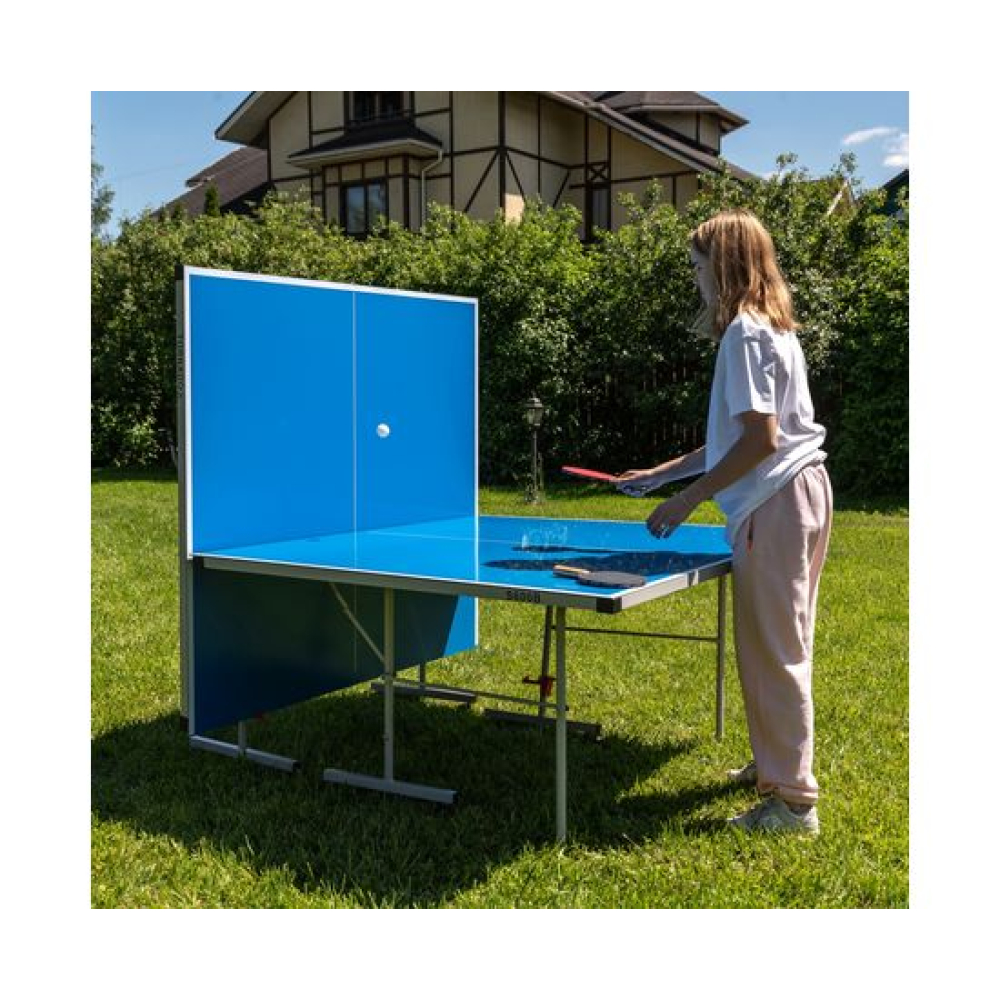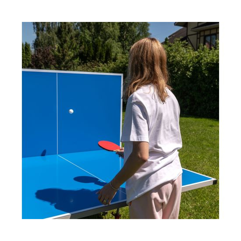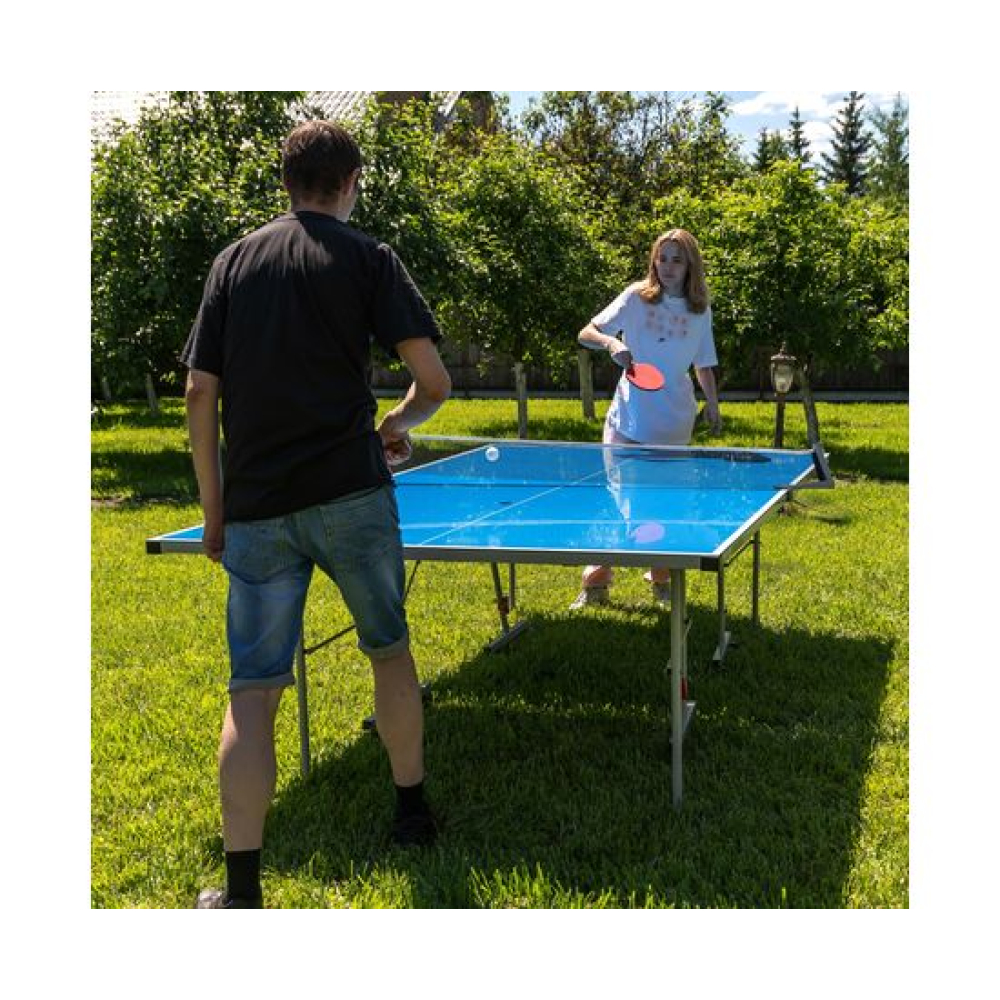 Всепогодный теннисный стол Tornado с композитной столешницей, толщиной 4 мм синего цвета.Каждая столешница на отдельной базе. Игровая плита с пластиковым наполнителем, окрашенным в 5 слоёв и защищена алюминиевым кантом. Сетка поставляется в комплекте со столом.Компактная система складывания. Конструкция стола позволяет сложить половину и играть одному. Профиль конструкции 20х30 мм. У каждой столешницы 1 опора вращается на 360 гр, с фиксацией в двух положениях. Стол имеет транспортировочные ролики - 8 шт, 4 штуки - с фиксаторами, диаметр 50 мм.