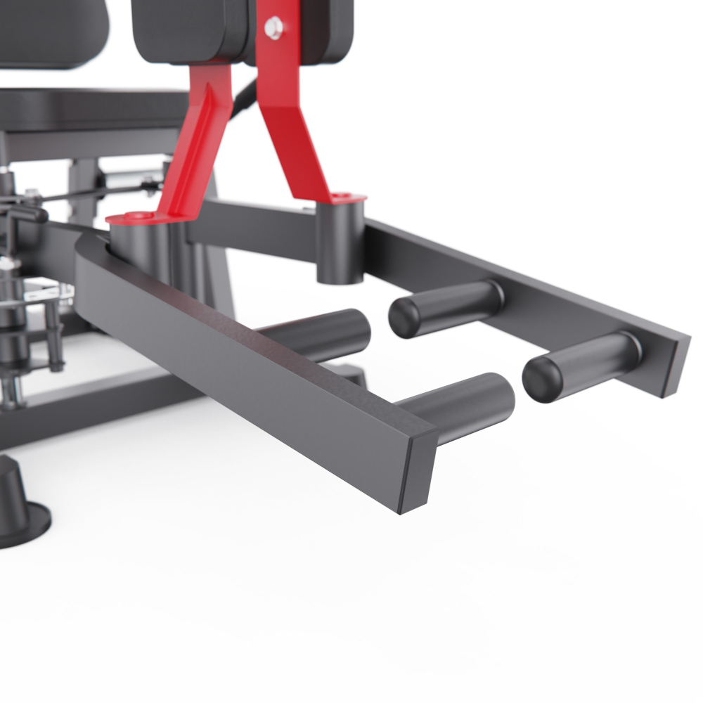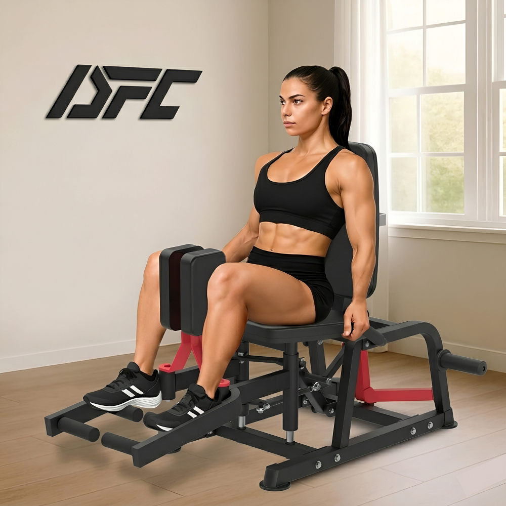 Тренажёр для сведения и разведения ног DFC HVO JRHA301-3501R — удобное и эффективное решение для домашних тренировок. Он предназначен для проработки мышц ног и ягодиц, способствует развитию силы и повышению выносливости. Благодаря перемещению подушек тренажер превращается из просто разгибательного еще и в сгибательный. Конструкция рассчитана на пользователя весом до 130 кг. Общая допустимая нагрузка на тренажёр составляет до 200 кг с учётом веса пользователя и установленных дисков. Держатели для дисков выдерживают до 70 кг на каждую сторону. Прочная рама из профиля 50 х 50 х 1,5 мм обеспечивает надёжность и долговечность конструкции, в том числе при выполнении упражнения на сведение бедер. Тренажёр оснащён системой регулировок для точной настройки под пользователя. Положение фиксируется с помощью штифта с 6 уровнями. Дополнительно предусмотрена регулировка амплитуды движения с четырьмя уровнями. Спинка регулируется в 4 положениях, что позволяет адаптировать посадку под рост и комплекцию. Расстояние между педалями составляет 30,8 см, между ручками — 67 см, длина каждой ручки — 23 см, расстояние между роликами для ног — 12,5 см. Сиденье мягкое, толщиной 4,5 см, обеспечивает комфорт во время занятий. Посадочные диаметры 25 и 50 мм совместимы со стандартными дисками. Модель выполнена в стильном чёрно-красном цвете и оптимально подходит для домашнего использования. Продуманная конструкция и широкий диапазон регулировок позволяют точно настроить тренажёр под индивидуальные параметры и уровень нагрузки. Дополнительно компенсаторы неровностей пола обеспечивают устойчивость тренажёра во время занятий. Гарантия на детали подверженные естественному износу в процессе эксплуатации — до 6 месяцев с момента установки тренажера при условии регулярного планового ТО. Важно: гарантия не распространяется на преждевременный износ из-за чрезмерной эксплуатации тренажера.