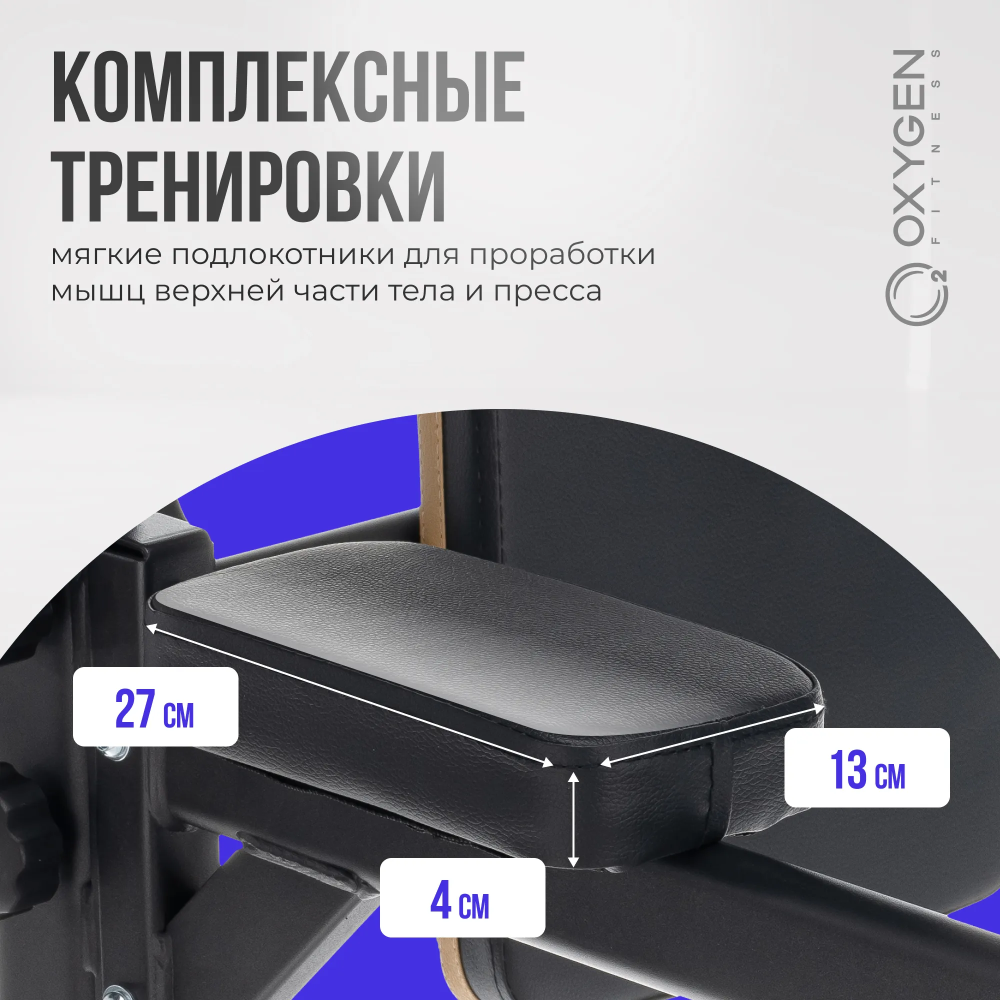 | Дополнительно | Спинка комфортабельная эргономичная с обвивкой из кожи, толщина 40 мм, регулировка высоты турника |