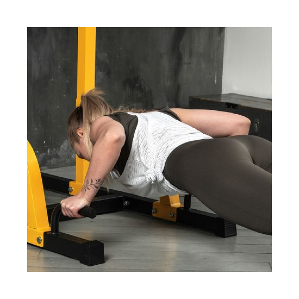 Турник-брусья Power Tower DFC это эффективный тренажер для выполнения силовых упражнений под собственным весом.Верхние рукояти турника предназначены для выполнения подтягиваний различным хватом. Регулировка по высоте в пределах от 2 до 2,3 метра и возможность установить турник в нужном направлении позволит создать комфотрные условия для тренировки.Брусья отлично подойдут для отжиманий, а мягкие локтевые упоры создадут комфортные условия для прокачки пресса и спины.Пара нижних рукояток в передней части тренажера позволяет выполнять отжимания из положения лежа.Брусья с подлокотниками можно отрегулировать по высоте в трех положениях. Или снять их полностью, и в этом случае они не мешают выполнять подтягивания.Прочная рама тренажера изготовлена из высоко качественного стального профиля. Размер профиля: 50*50*1,7 мм.
