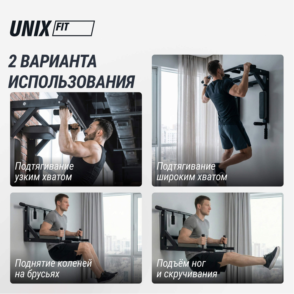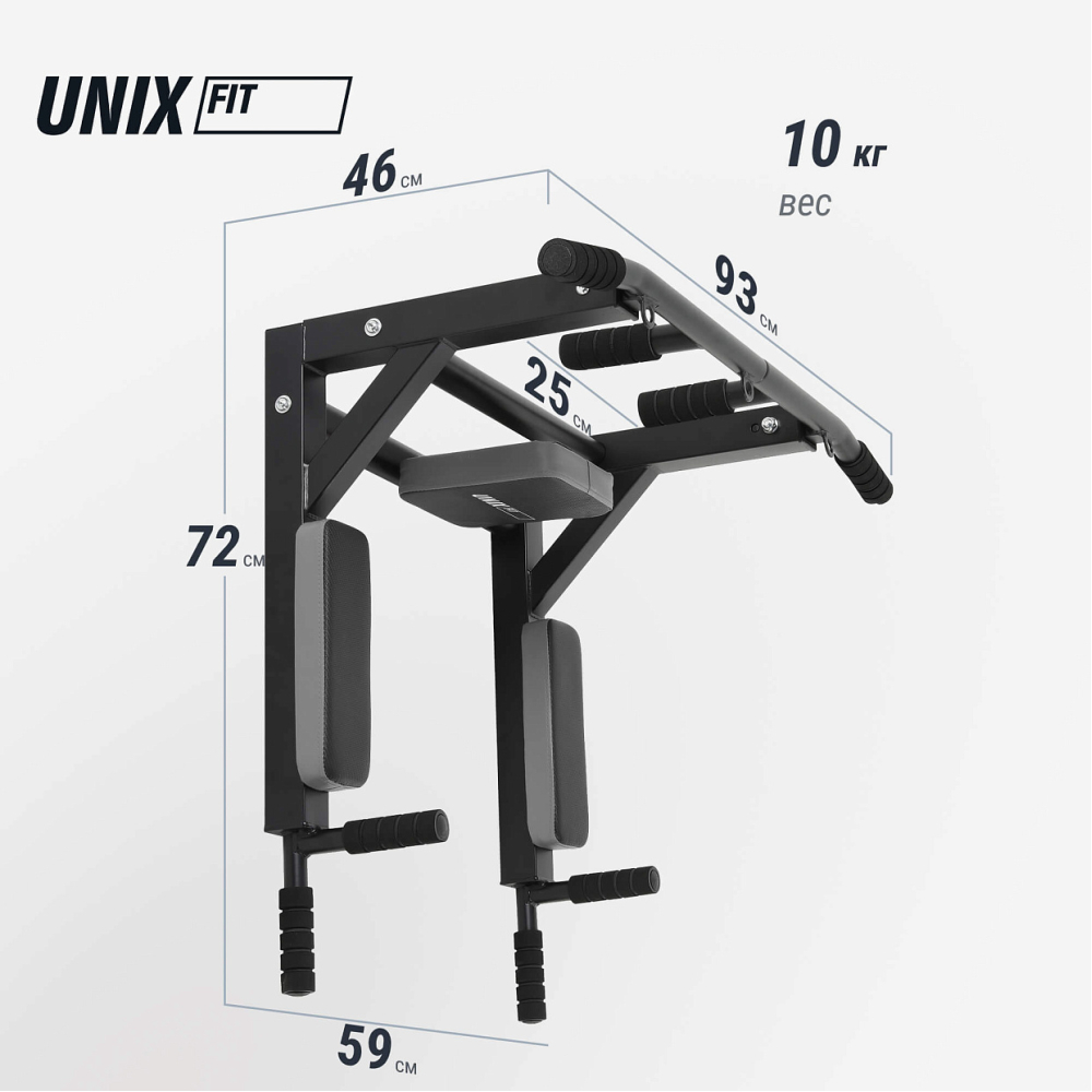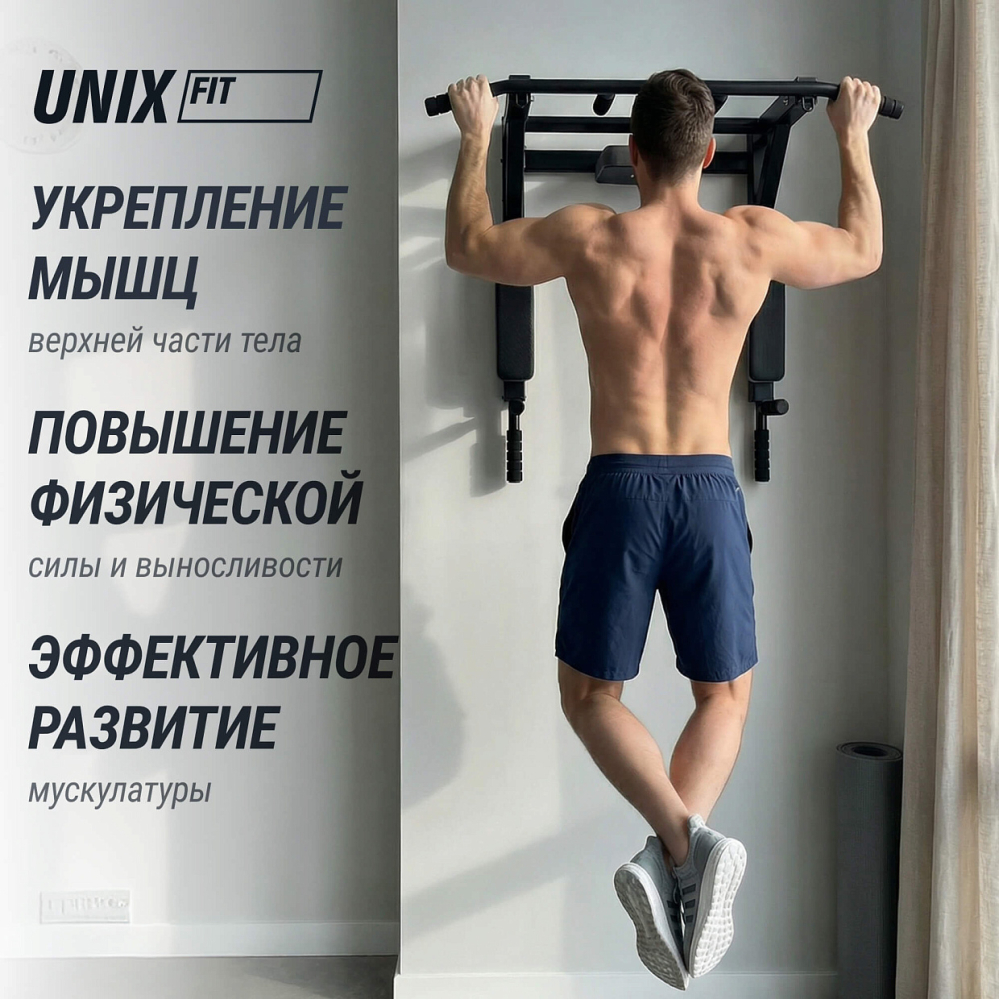 Турник настенный «3 в 1» UNIX Fit – тренажер, специально предназначенный для домашних тренировок. Конструкция имеет компактные размеры и легко вписывается в любой интерьер! Данная модель подходит как начинающему, так и опытному спортсмену для ежедневных тренировок. Турник позволяет выполнять базовые упражнения с собственным весом и развивать мышцы: грудного отдела; плечевого пояса и рук; кора; бедра; спины. Конструкция имеет 2 кольца для крепления, подходящие как для петель для многофункционального тренинга, так и для крепления боксерской груши (приобретаются отдельно). Для выполнения дополнительных упражнений необходимо поменять положение турника на обратное. Максимальный вес, который способен выдержать турник, составляет 200 кг. Среди преимуществ данной модели можно отметить: Компактность конструкции, размеры тренажера (Д*Ш*В): 93х72х46 см; Профиль 50 х 50 х 1 мм; Спинка и упоры для рук комфортабельные из ЭКО-кожи с плетеной структурой (Carbon TX); Прямоугольный профиль для повышения жесткости конструкции; Профиль Стойка изготовлена из качественной стали, сварные соединения имеют усиление - это обеспечит вам полную безопасность; Торцы ручек турника надежно закрыты заглушками; Двуслойная порошковая окраска рамы позволяет сохранить внешний вид тренажера от внешнего воздействия; Турник имеет эргономичные обрезиненные ручки, защищающие пользователя от скольжения ладоней; Долгую службу и прекрасный внешний вид обеспечит обивка, устойчивая к истиранию, выполненная из ЭКО-кожи под карбон. Мягкая спинка и подлокотники дают возможность комфортно провести занятие; Прочный материал обивки устойчив к истиранию и механическим повреждениям. Кольца для крепления TRX-петель или мешка для бокса С удовольствием организуем доставку по РФ и странам СНГ. Регулярные тренировки помогут вам обрести хорошую физическую форму, получить заряд энергии и позитивное настроение! С UNIX Fit жизнь ярче! .