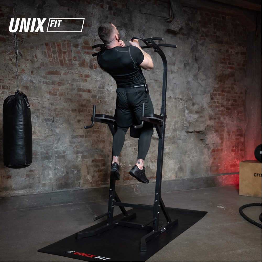 Тренажёр турник – пресс - брусья UNIX Fit POWER TOWER 150 представляет собой многофункциональное решение для эффективных домашних тренировок. Этот тренажер 3 в 1 позволяет гармонично развивать мускулатуру всего тела посредством выполнения комплексных упражнений с использованием собственного веса. . Преимущества конструкции Конструкция турника 3 в 1 выполнена из прочной качественной стали, сварные швы дополнительно усилены для повышения долговечности изделия. Двухслойное покрытие краской обеспечивает устойчивость спортивного инвентаря к царапинам и повреждениям внешнего вида. Максимальная нагрузка составляет 150 кг. Удобная складная конструкция занимает минимальное пространство в помещении, обеспечивая удобство хранения даже в небольших квартирах. Высота регулируется в диапазоне от 204 до 240 см, позволяя подобрать оптимальный вариант для каждого пользователя независимо от роста. Предусмотрено несколько вариантов захвата на перекладине: широкий, узкий и параллельный, что дает возможность проработать разные группы мышц. . Функциональные возможности Напольный турник для дома предназначен для выполнения комплекса упражнений с собственной массой тела, направленных на развитие всех основных мышечных групп: - Грудной отдел; - Плечевой пояс и руки; - Спина; - Квадрицепсы; - Мышцы кора. Благодаря различным вариантам хватов достигается равномерное распределение нагрузок и улучшение общей физической формы. . Комфорт и безопасность Ручки покрыты мягким прорезиненным материалом, предотвращающим скольжение ладоней и обеспечивающим дополнительный комфорт при выполнении силовых упражнений. Турник напольный оснащен мягкими спинкой и подлокотниками, изготовленными из экокожи с плетеной структурой Carbon TX, устойчивой к внешним воздействиям и длительным нагрузкам. Все торцевые части перекладин защищены специальными пластиковыми заглушками, исключающими травмы и повреждение покрытия пола. . Универсальность применения Спортивный тренажер подходит как для новичков, начинающих знакомство со спортом, так и для опытных спортсменов, стремящихся поддерживать свою физическую форму и повышать уровень выносливости. Простота сборки позволяют быстро интегрировать домашний турник в любой интерьер. Домашний напольный турник брусья пресс POWER TOWER 150 является идеальным решением для тех, кто стремится укрепить своё здоровье и повысить эффективность физических занятий дома. Тренируйтесь с удовольствием вместе с UNIX Fit! .