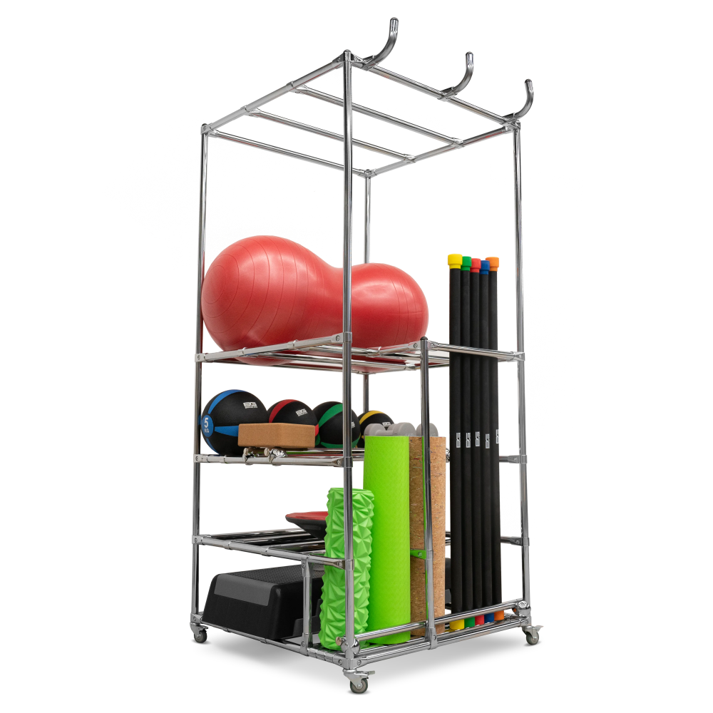 Достаточно компактная (всего 80х85 см) комбинированная стойка для компактного размещения большого количества инвентаря - гимнастических мячей (до 5 штук), медицинболов (до 4 шт), балансировочных платформ (2 шт), гимнастических ковриков (до 4 шт), гантелей (4 пары), бодибаров (до 6 шт), эспандеров и прочего. Сделана из хромированной стали. Колесики с тормозом позволяют легко перемещать стойку в необходимое место и фиксировать в нужном положении. Очень удобна для небольших залов, когда требуется на минимальной площади разместить все необходимое. Высота 1,85 м, чтобы можно было занести в стандартный дверной проем. В комплекте 3 крюка, при необходимости остальные можно приобрести отдельно.