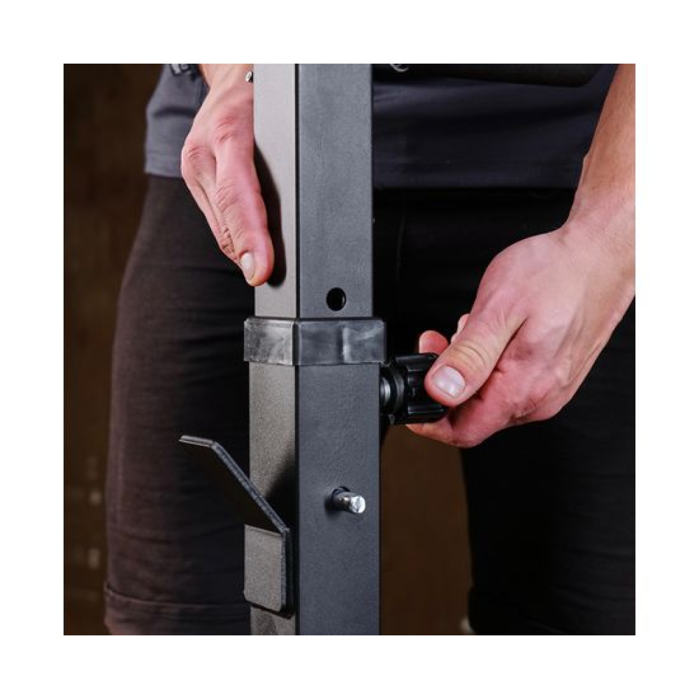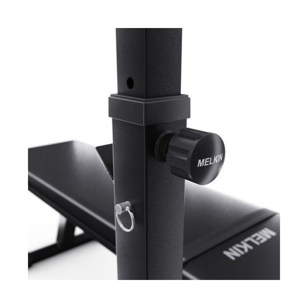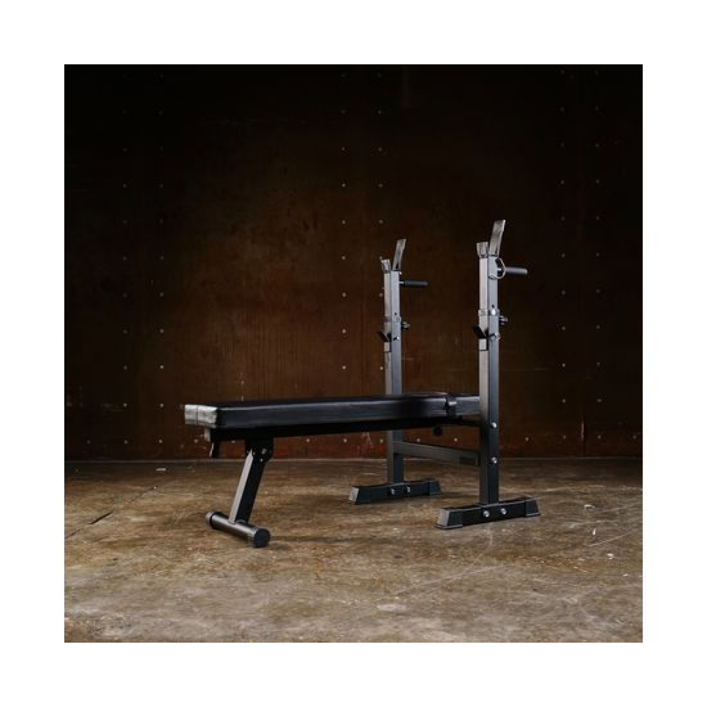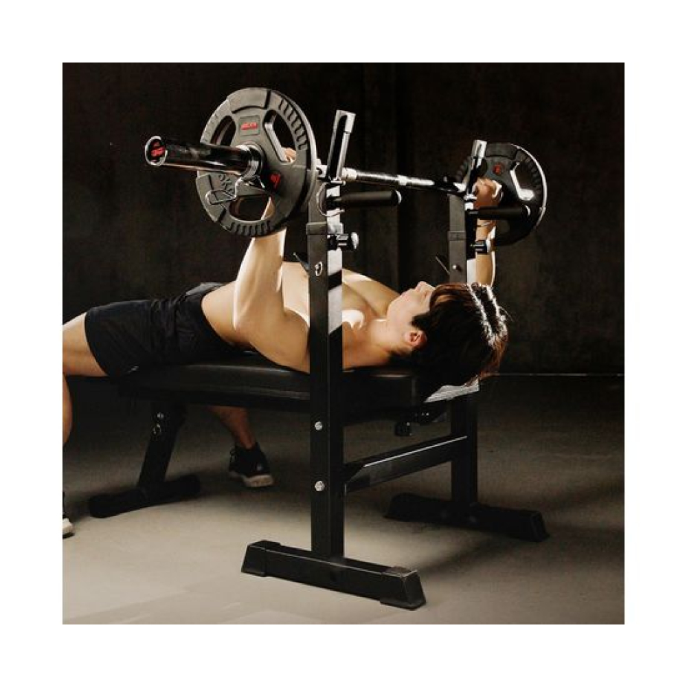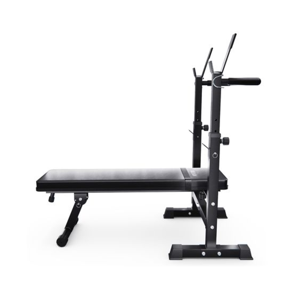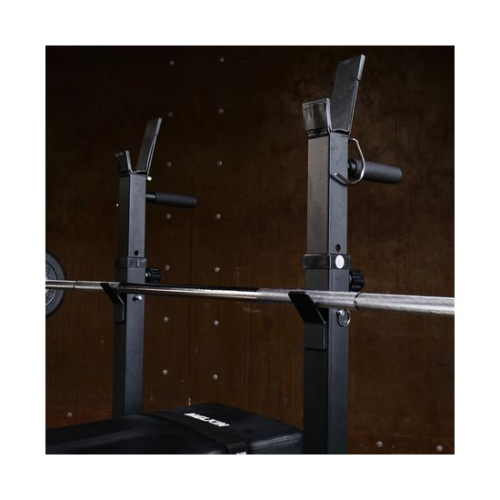 Скамья со стойками под штангу DFC MELKIN — идеальное решение для домашних тренировок! Благодаря складной конструкции и максимальной нагрузке до 200 кг, вы сможете выполнять разнообразные упражнения: на пресс, отжимания на брусьях и подъём штанги. Нагрузка на брусья — 100 кг, а на стойки — 150 кг. Профиль рамы выполнен из высококачественного металла размером 50 x 50 x 1,5 мм.Угол наклона скамьи регулируется на 3 уровня, а в комплекте идёт ремень для фиксации стоп. Благодаря этому ремешку вам будет гораздо комфортнее делать упражнения на пресс такие, как: скручивания и подъём корпуса – ноги будут надёжно зафиксированы ремнём.Регулировка стоек по высоте возможна на 5 уровней с диапазоном от 98 до 118 см от пола до верха стоек. Внутреннее расстояние между стойками составляет 52,5 см, а внешнее – 62,5 см, между брусьями — 54 см, а с внешней стороны – 59,5 см.В конце тренировки скамья компактно складывается, занимая по длине менее 50 см – её можно убрать к стене, либо в шкаф.
