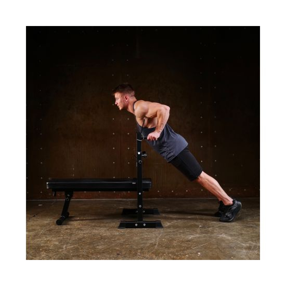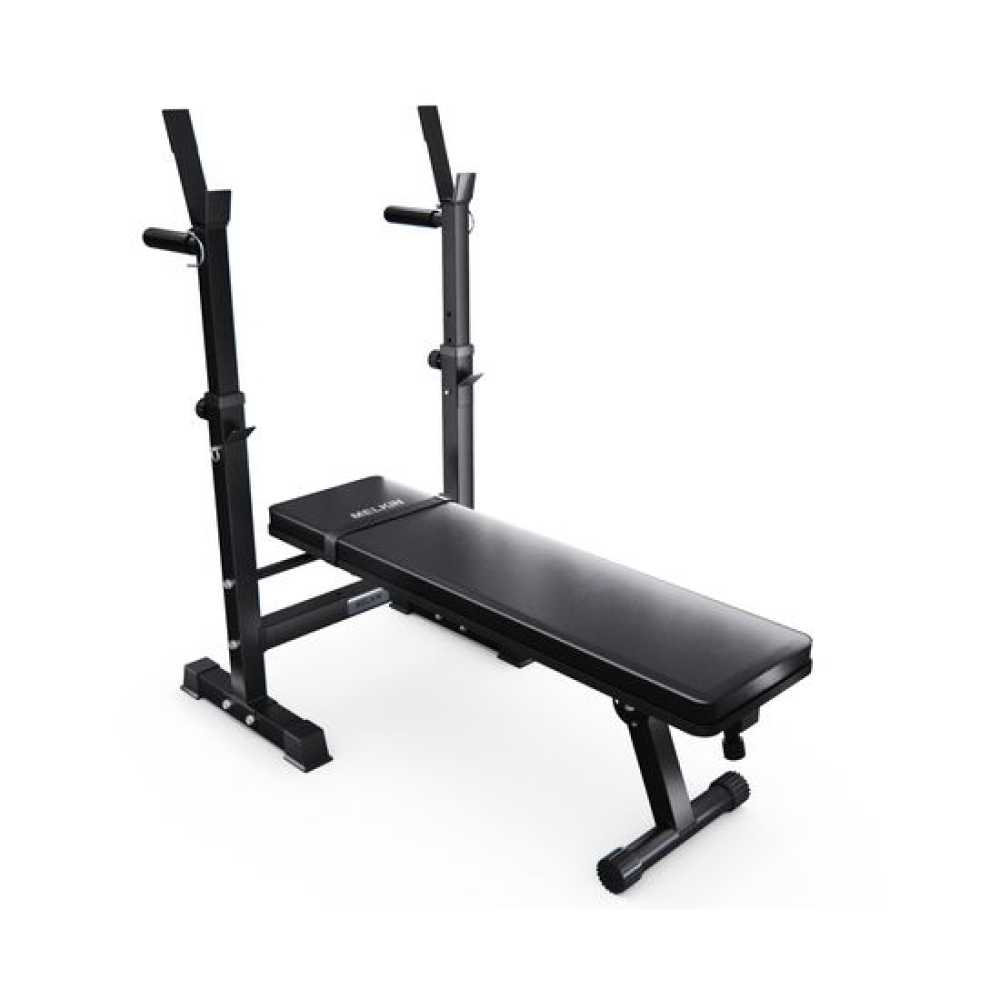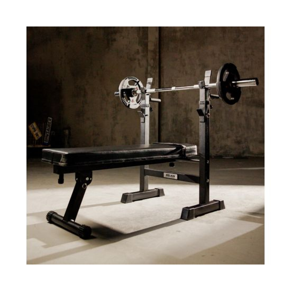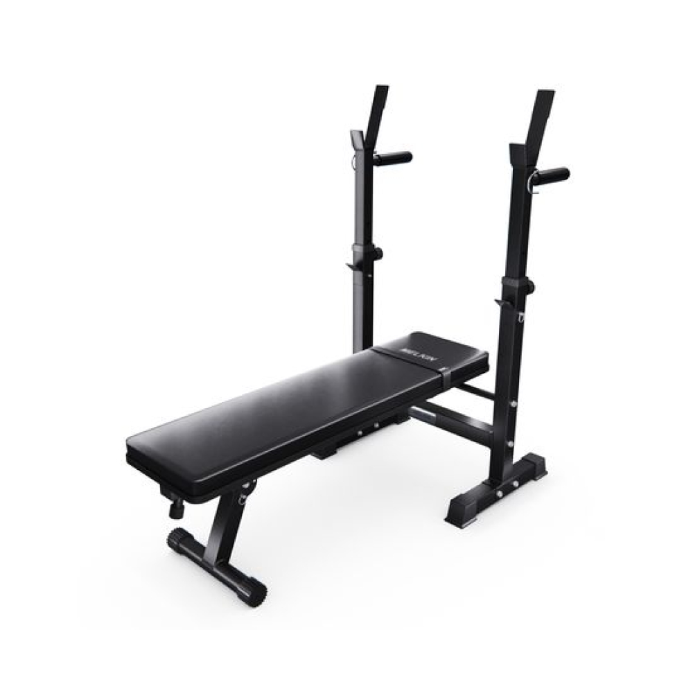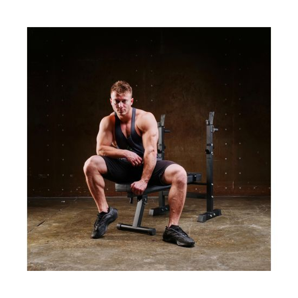 Скамья со стойками под штангу DFC MELKIN — идеальное решение для домашних тренировок! Благодаря складной конструкции и максимальной нагрузке до 200 кг, вы сможете выполнять разнообразные упражнения: на пресс, отжимания на брусьях и подъём штанги. Нагрузка на брусья — 100 кг, а на стойки — 150 кг. Профиль рамы выполнен из высококачественного металла размером 50 x 50 x 1,5 мм.Угол наклона скамьи регулируется на 3 уровня, а в комплекте идёт ремень для фиксации стоп. Благодаря этому ремешку вам будет гораздо комфортнее делать упражнения на пресс такие, как: скручивания и подъём корпуса – ноги будут надёжно зафиксированы ремнём.Регулировка стоек по высоте возможна на 5 уровней с диапазоном от 98 до 118 см от пола до верха стоек. Внутреннее расстояние между стойками составляет 52,5 см, а внешнее – 62,5 см, между брусьями — 54 см, а с внешней стороны – 59,5 см.В конце тренировки скамья компактно складывается, занимая по длине менее 50 см – её можно убрать к стене, либо в шкаф.
