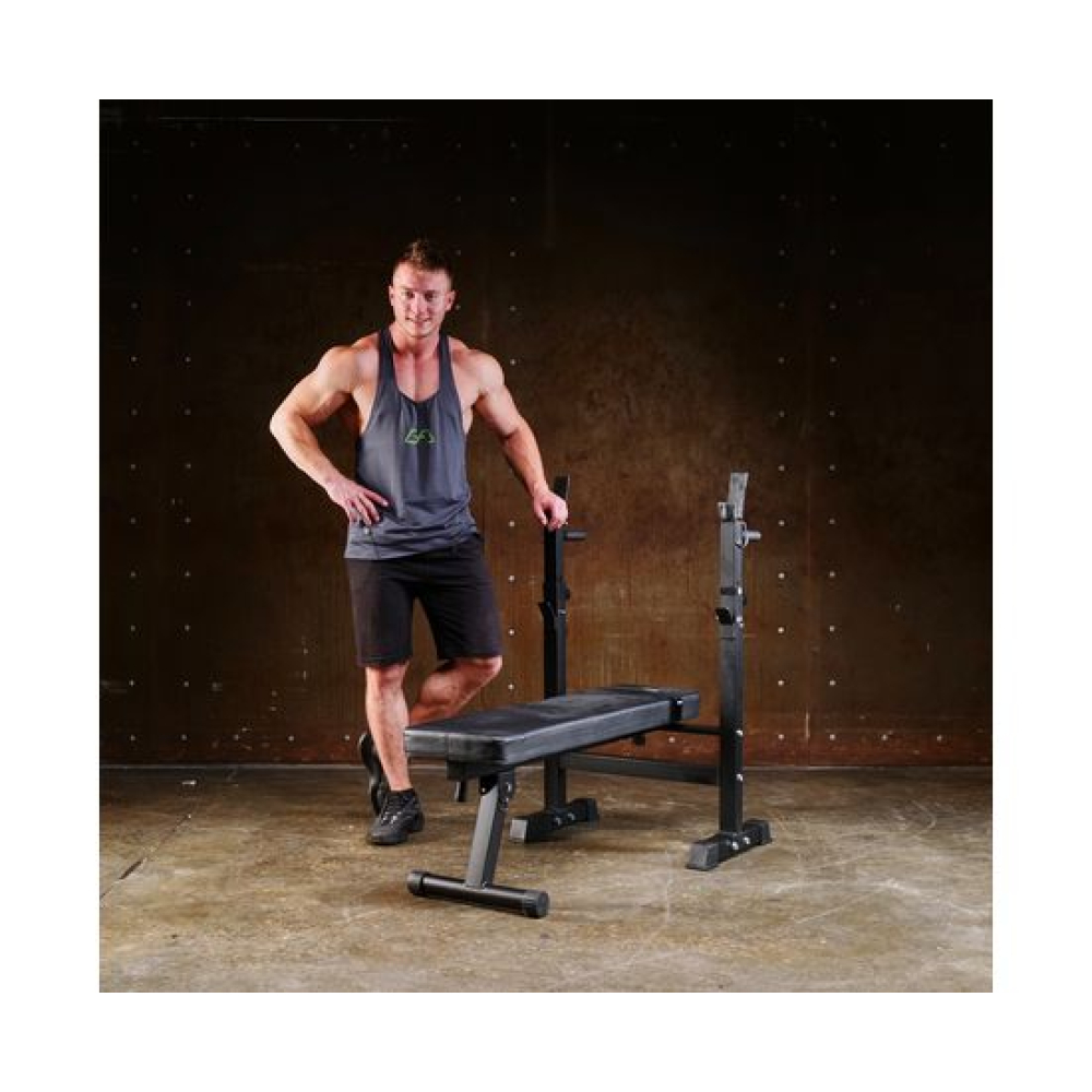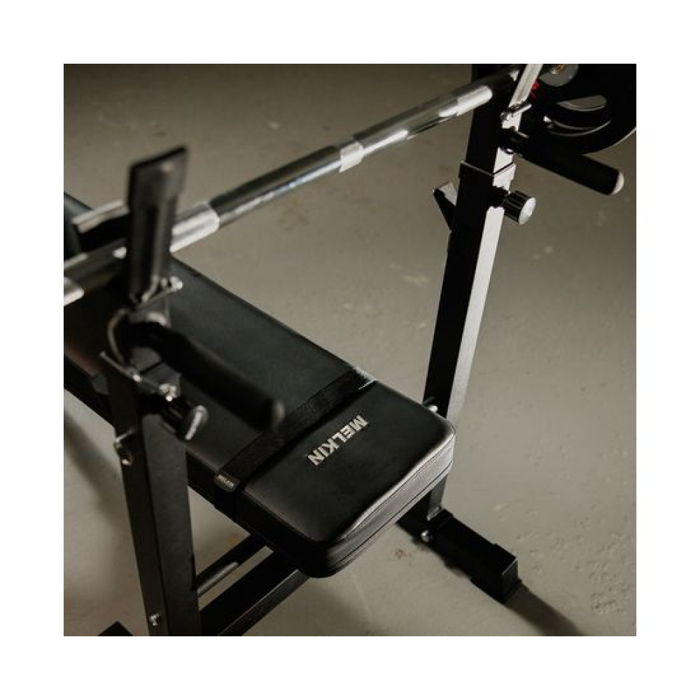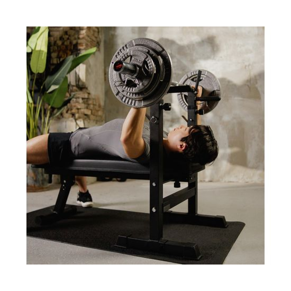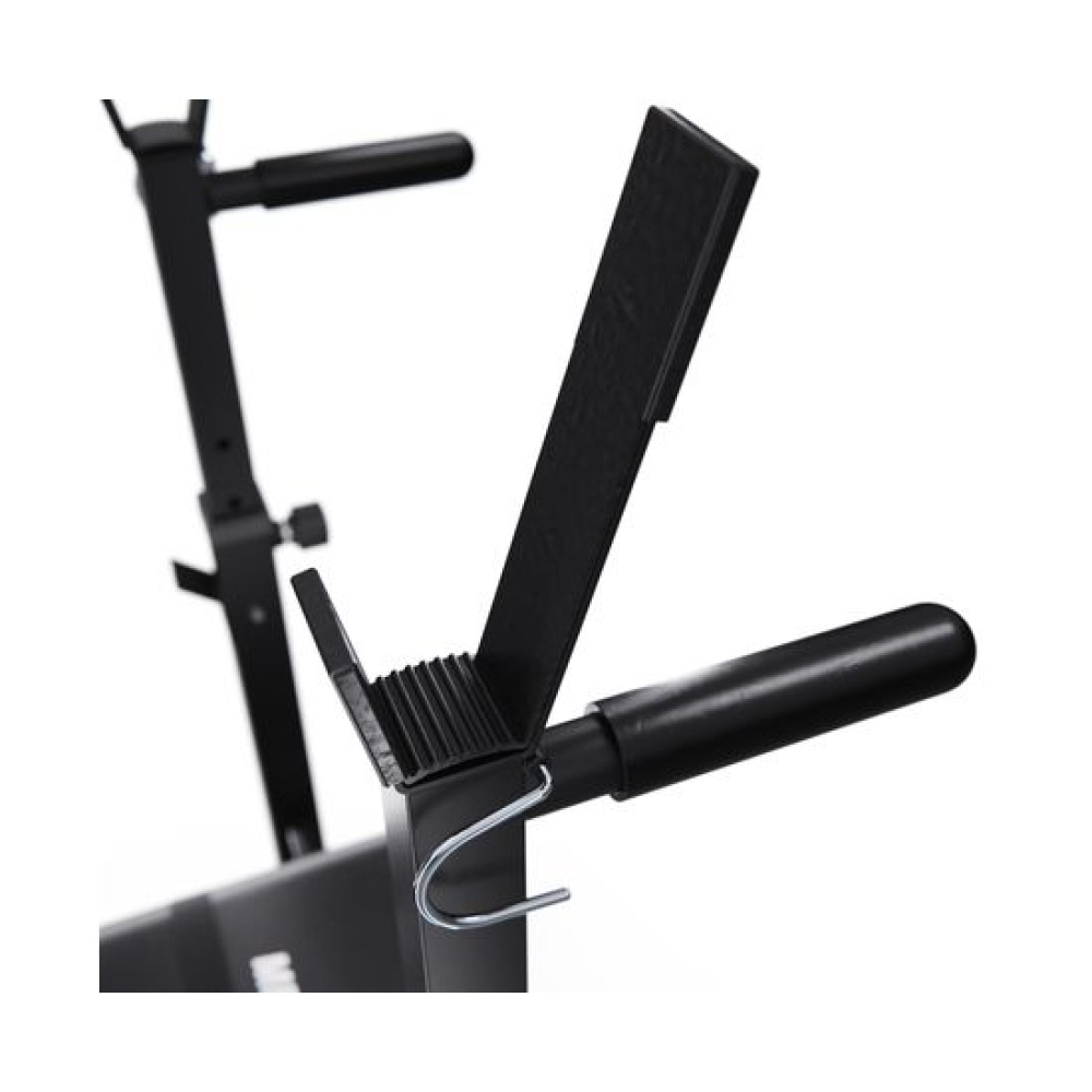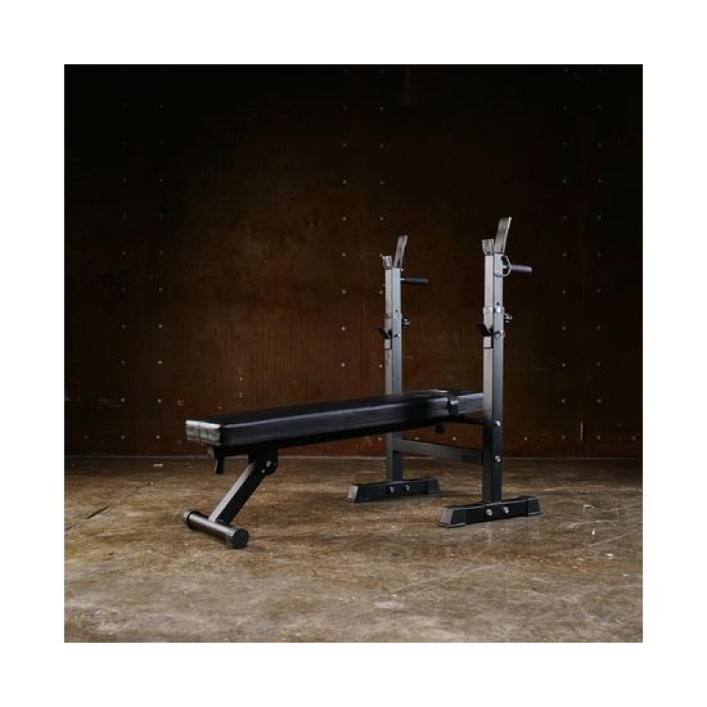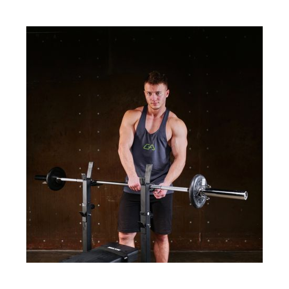 Скамья со стойками под штангу DFC MELKIN — идеальное решение для домашних тренировок! Благодаря складной конструкции и максимальной нагрузке до 200 кг, вы сможете выполнять разнообразные упражнения: на пресс, отжимания на брусьях и подъём штанги. Нагрузка на брусья — 100 кг, а на стойки — 150 кг. Профиль рамы выполнен из высококачественного металла размером 50 x 50 x 1,5 мм.Угол наклона скамьи регулируется на 3 уровня, а в комплекте идёт ремень для фиксации стоп. Благодаря этому ремешку вам будет гораздо комфортнее делать упражнения на пресс такие, как: скручивания и подъём корпуса – ноги будут надёжно зафиксированы ремнём.Регулировка стоек по высоте возможна на 5 уровней с диапазоном от 98 до 118 см от пола до верха стоек. Внутреннее расстояние между стойками составляет 52,5 см, а внешнее – 62,5 см, между брусьями — 54 см, а с внешней стороны – 59,5 см.В конце тренировки скамья компактно складывается, занимая по длине менее 50 см – её можно убрать к стене, либо в шкаф.