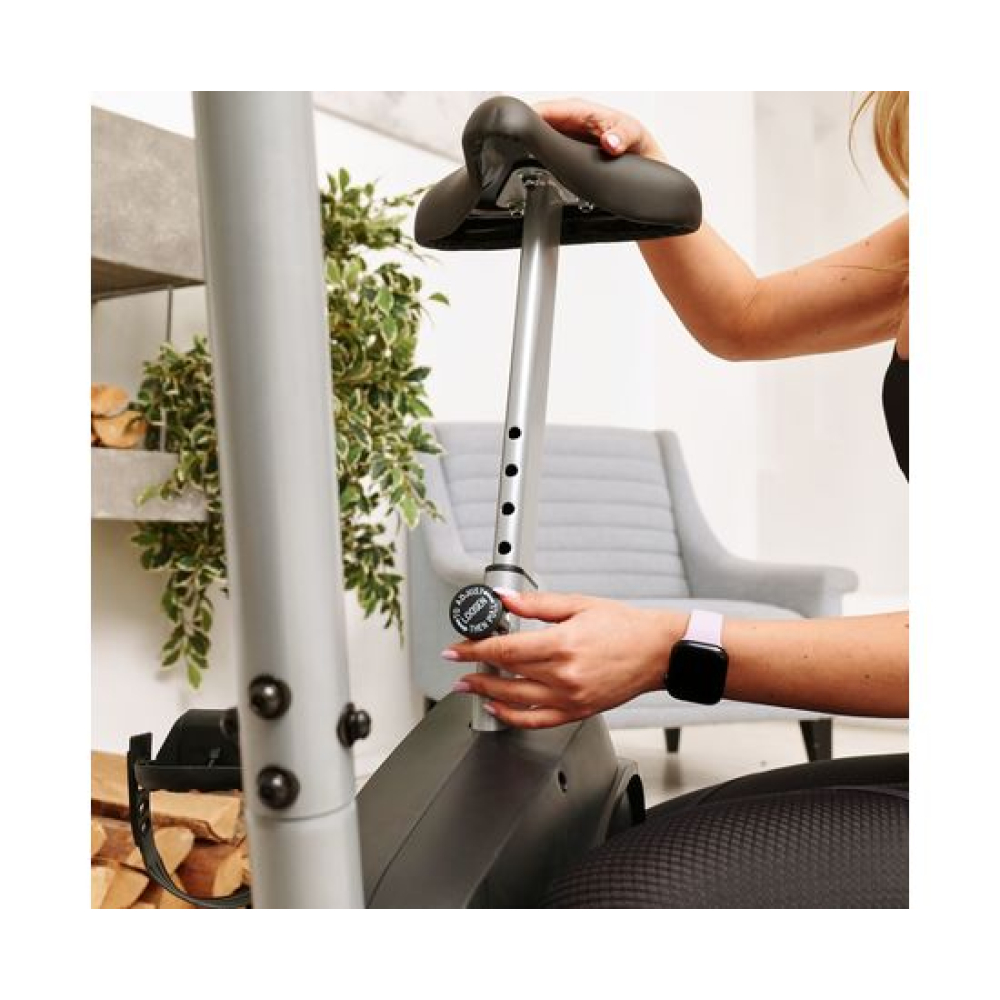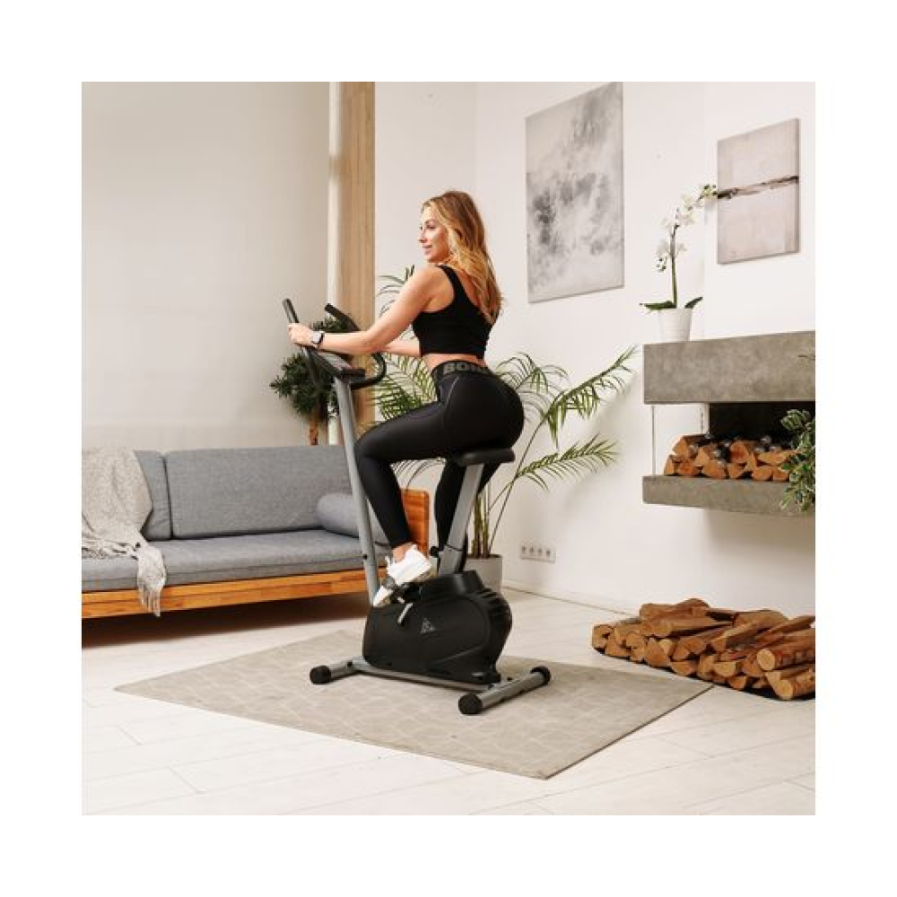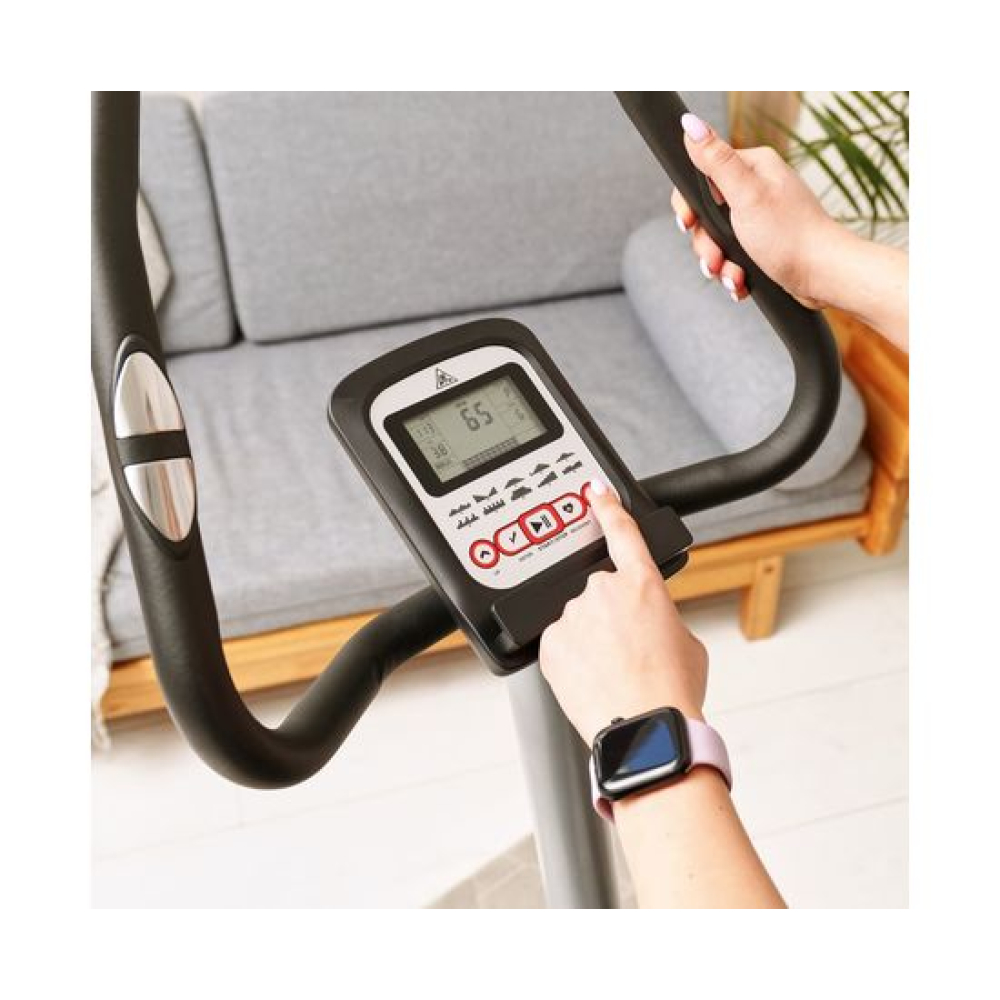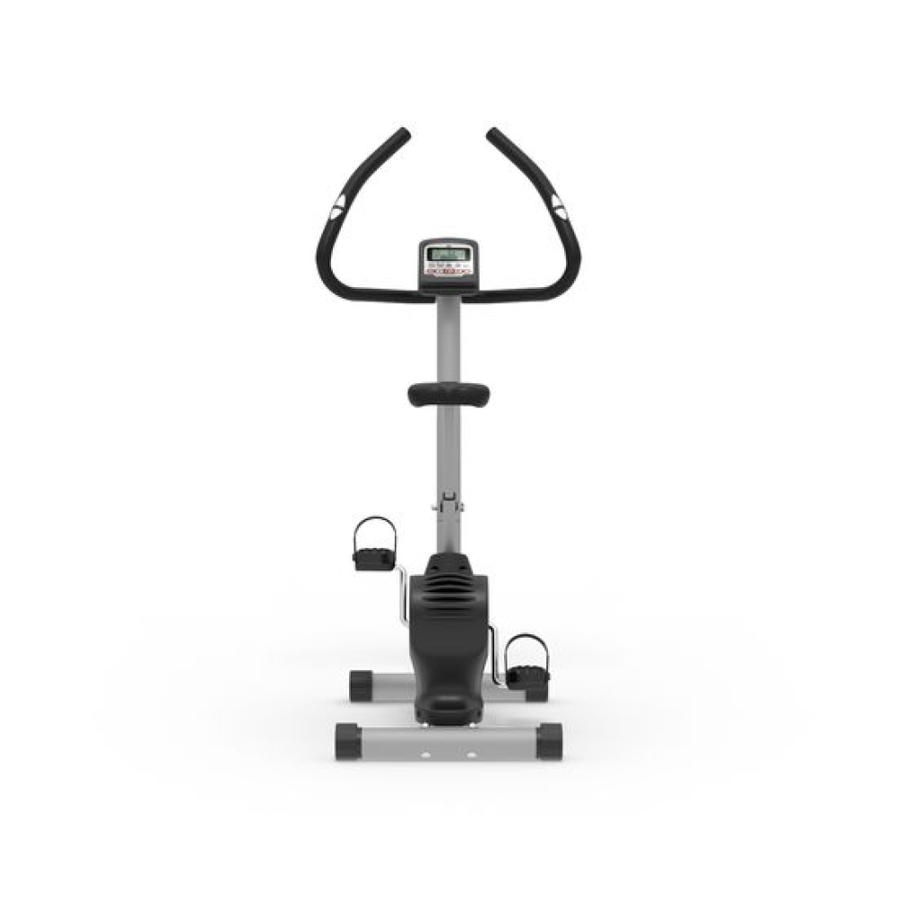 Велотренажер DFC B5901P вертикальной конструкции прекрасно подходит для домашнего применения.Особенности тренажёраСистема нагрузкиЭлектромагнитная система нагрузки регулируется электронным способом с консоли.МаховикВес маховика — 5 кг(инерционный вес 7 кг), расположен под сиденьем. Гарантирует плавность хода при занятии.Конструкция тренажёраДля хорошей устойчивости на неровном полу предусмотрены компенсаторы. Предельно допустимый вес — 110 кг.Измерение пульсаПоказатели считываются датчиками на поручнях. Для лучшего контроля рекомендуется дополнительно приобрести набор: нагрудный кардиодатчик + часы-монитор DFC W117.СиденьеКомфортное водонепроницаемое сиденье из мягкого полиуретана регулируется по вертикали в 6 положениях.ПедалиОснащены рифлёным покрытием и ремнями с регулировкой по ширине стопы.Консоль и дисплейМонохромный LCD дисплей, расположенный на передней консоли, выводит основные параметры тренировки. Также есть держатель для телефона или планшета, предусмотрена 21 программа тренировок.