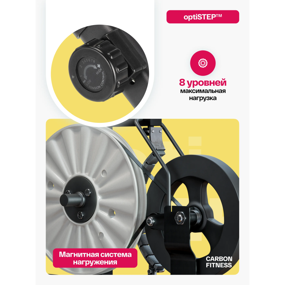 Магнитная система нагружения optiSTEP™ с восемью уровнями нагрузки позволяет настроить интенсивность тренировки под свои потребности. Однокомпонентный литой шатун педального узла и прорезиненные педали с регулируемыми ремешками обеспечивают комфорт и безопасность во время занятий. Эргономичное сиденье с спинкой и поручнями и регулировкой по горизонтали позволяет настроить его под ваше удобство.