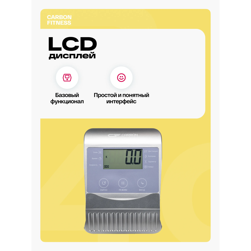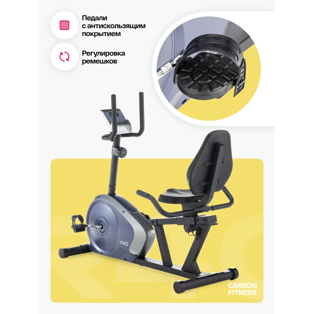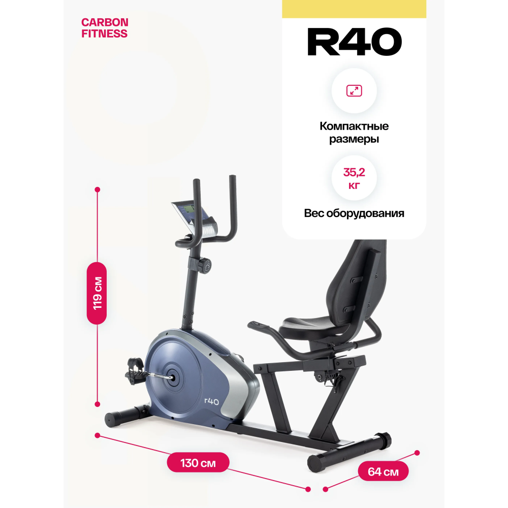 Горизонтальный тренажер Carbon Fitness R40 это не просто инструмент для тренировок, а источник мотивации и заботы о вашем здоровье. С нашей 12-месячной гарантией вы получаете уверенность в надежности и высоком качестве этого тренажера. Не откладывайте заботу о себе на потом - начните прямо сейчас и достигните новых высот в своих тренировках!