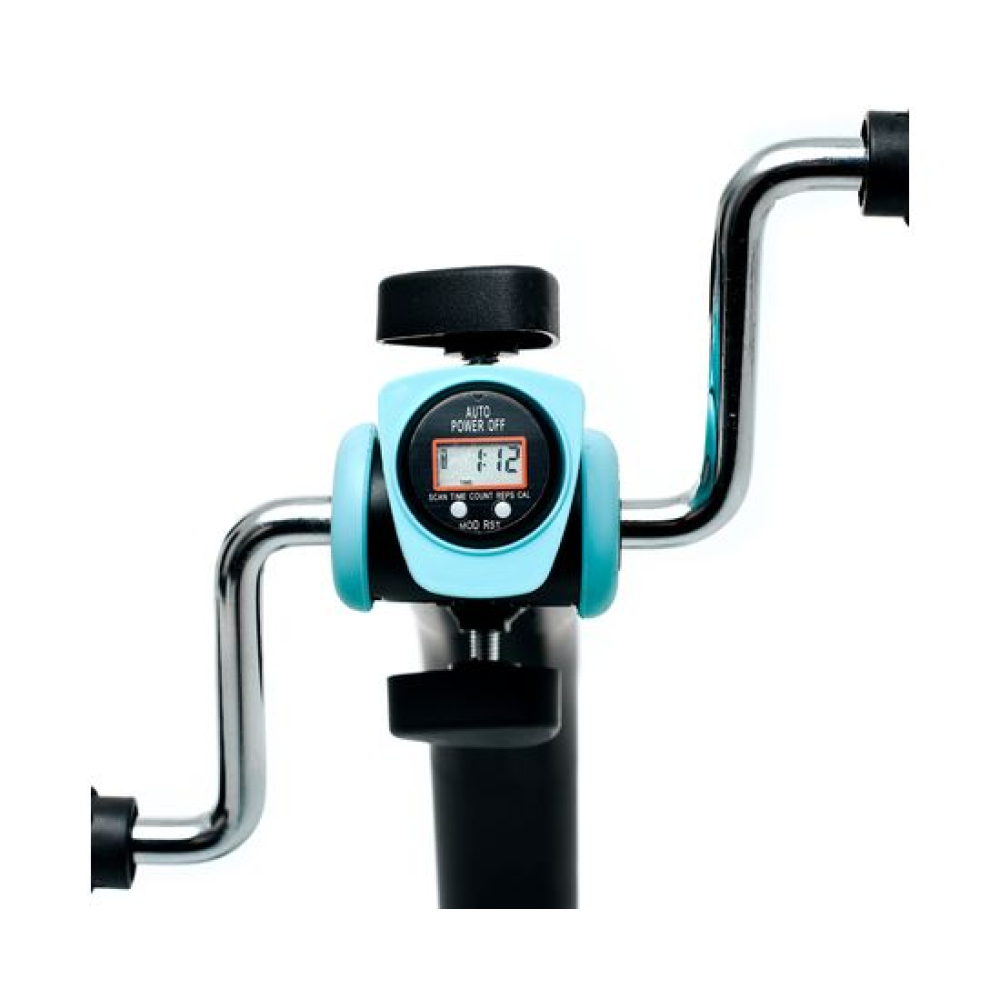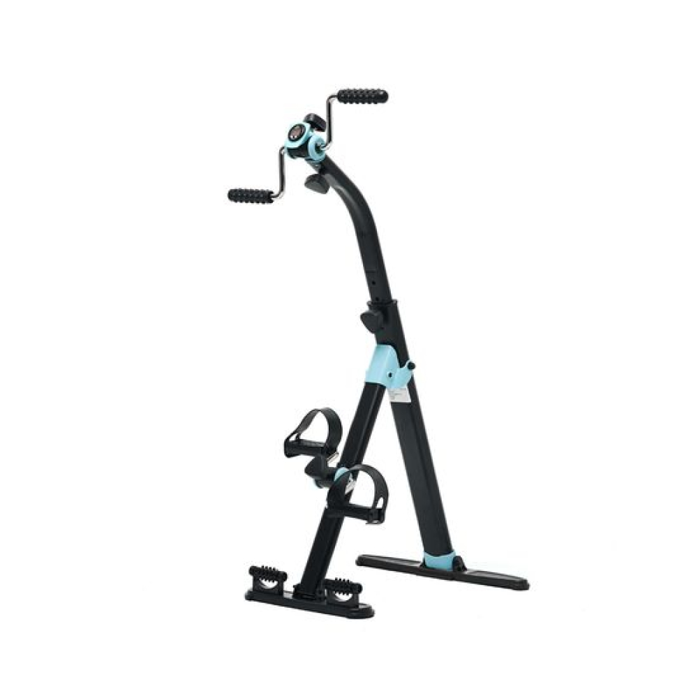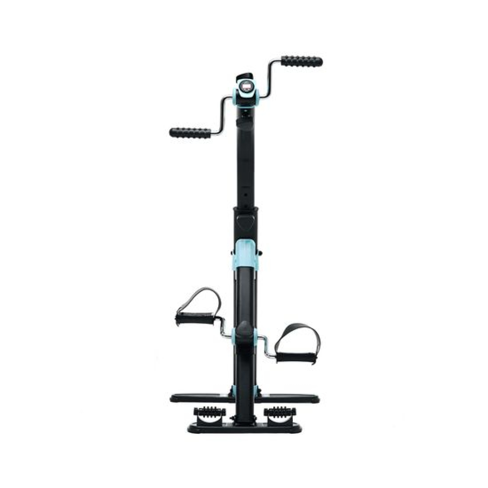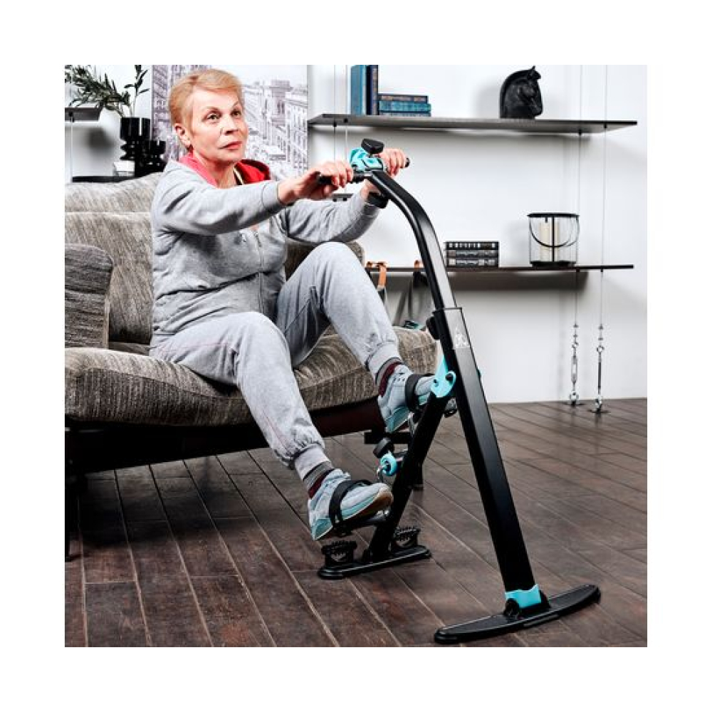 Велотренажер двойной DFC B812 dual bike Велотренажер DFC B812 dual bike предназначен для домашнего использования. Его основное назначение — реабилитация после операций и травм, тренировки для пожилых и людей с ограниченными физическими возможностями.Новая модель велотренажёра поставляется в комплекте с регулируемым ремешком длиной 74 см. Он нужен для предотвращения скольжения тренажёра во время занятий.Особенности тренажёраДизайнКорпус выполнен в классическом чёрном цвете, который дополняют яркие голубые вставки.Система нагрузкиТрубочная система регулируется вручную при помощи рукоятей на педальном блоке и блоке руля. Для увеличения нагрузки необходимо поворачивать рукоятку по часовой стрелке, для снижения нагрузки — против часовой стрелки.ФункциональностьЗаниматься на тренажёре можно стоя или сидя, что оптимально для занятий сидячим людям. Максимально допустимый вес пользователя — 100 кг.МассажВ основании тренажёра предусмотрены ролики с пупырчатой поверхностью для массажа ног. Такими же накладками оснащены рукоятки.ДисплейМонохромный дисплей отображает время занятия, число шагов, скорость, калории. В комплект входит батарейка 1,5 В (необходима для работы дисплея).