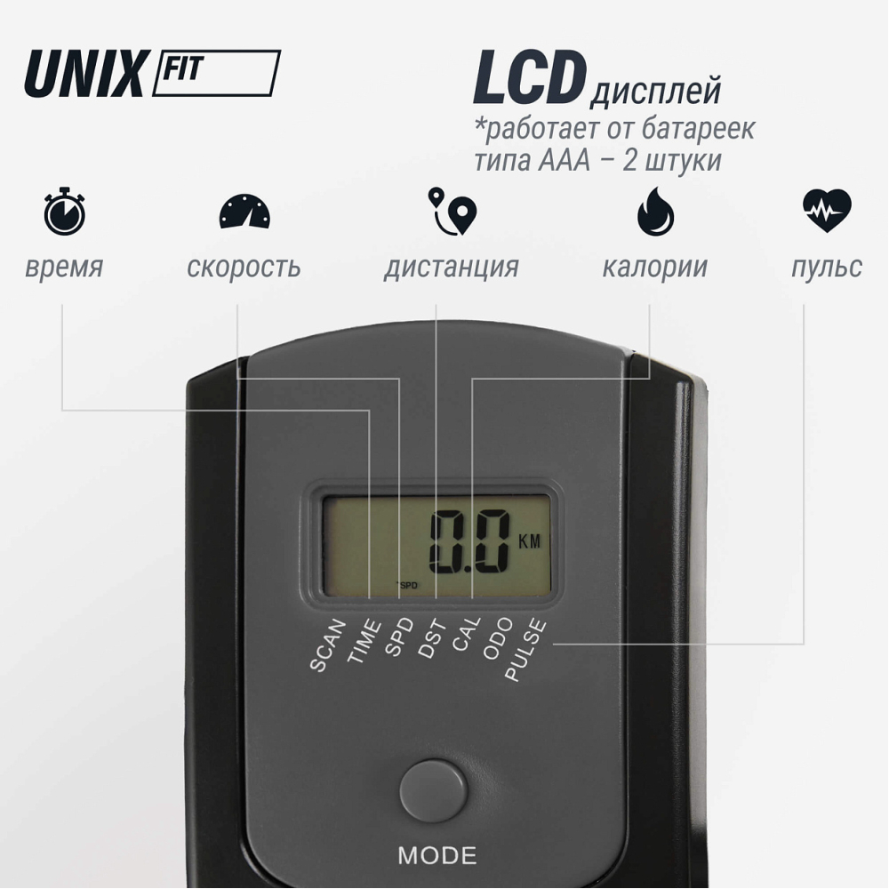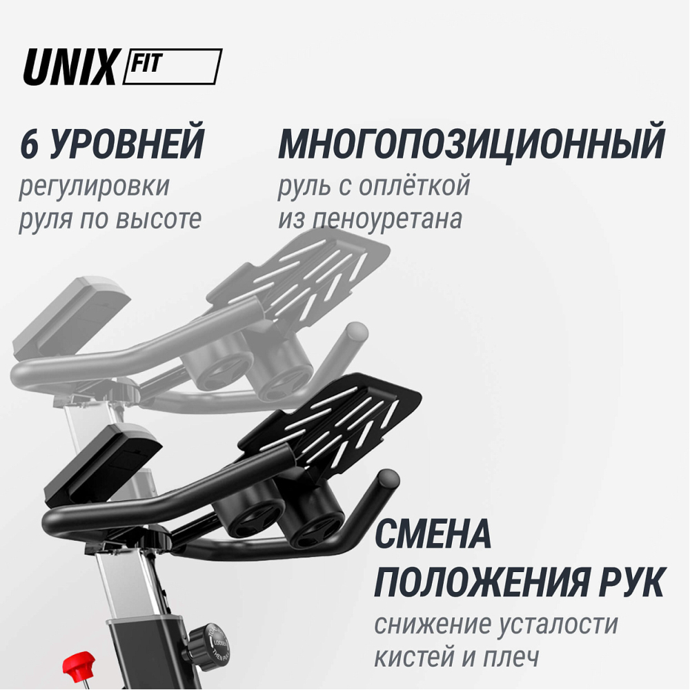 Велотренажер UNIX Fit SB-520 поможет вам достичь своих фитнес-целей, комфортно и эффективно тренируясь прямо у себя дома! Отличие между тренировками на спин-байке и на велотренажере заключается в том, что первый предоставляет больше возможностей для попеременной нагрузки разных групп мышц. Кроме того, занятия на спин-байке максимально приближенно имитируют езду на реальном велосипеде.. . Преимущества.. . - Колодочная система нагружения. В основе системы лежат специальные колодки, которые прижимаются к стальному маховику. Нагрузка меняется при увеличении или уменьшения степени давления колодок на маховик, плавная регулировка происходит вручную. Тренажеры с колодочной системой нагрузки хорошо имитируют езду на обычном велосипеде за счет своей конструкции, можно ездить стоя. Колодочная система нагружения, тяжелый маховик 18 кг и бесступенчатая плавная система регулировки обеспечивают максимально плавный ход спинбайка. Предусмотрен экстренный тормоз. Велотренажер для рук и ног не требует подключения к сети и работает автономно.. . - Удобная регулируемая посадка. Анатомическое мягкое сиденье обеспечивает комфорт во время тренировок, что позволяет заниматься продолжительное время. 6 фиксированных уровней регулировки сиденья, а так же 6 уровней регулировки руля по высоте позволяют настроить его под индивидуальные параметры и обеспечить максимальный комфорт во время тренировки. Подбирайте в зависимости от вашего роста удобное положение для тренировки. Положение можно настроить под любого пользователя. . . - Датчики измерения пульса. На неподвижных поручнях тренажера расположены датчики пульса для измерения частоты сердцебиения. Просто положите ладони на поручни и вы увидите результаты на экране консоли. . . - Регулируемые ремешки на педалях для комфортных тренировок. Педали с регулируемыми ремешками надежно фиксируют ноги и позволяют им не соскальзывать даже во время интенсивных занятий.. . - Оснащение. Спортивная бутылочка с держателем обеспечивают дополнительное удобство при длительных кардио тренировках на тренажере. Встроенные компенсаторы неровности пола гарантируют устойчивость во время интенсивного тренинга. Резиновые ножки не позволят испортить напольное покрытие, даже при длительном интенсивном использовании тренажёра на одном месте. Специальные транспортировочные ролики позволят без труда перемещать спин байк по квартире и дому.. . - LCD-дисплей. Тренажёр оснащен LCD-дисплеем, который отображает информацию об основных показателях тренировки: время, расстояние, пульс, калории, скорость. Это поможет отслеживать свой прогресс и мотивировать себя на дальнейшие достижения. Со специальной подставкой для телефона или планшета вы сможете наслаждаться любимым сериалом во время домашней кардио тренировки или не пропустить важный звонок. . . Тренируйтесь с удовольствием вместе с UNIX Fit .