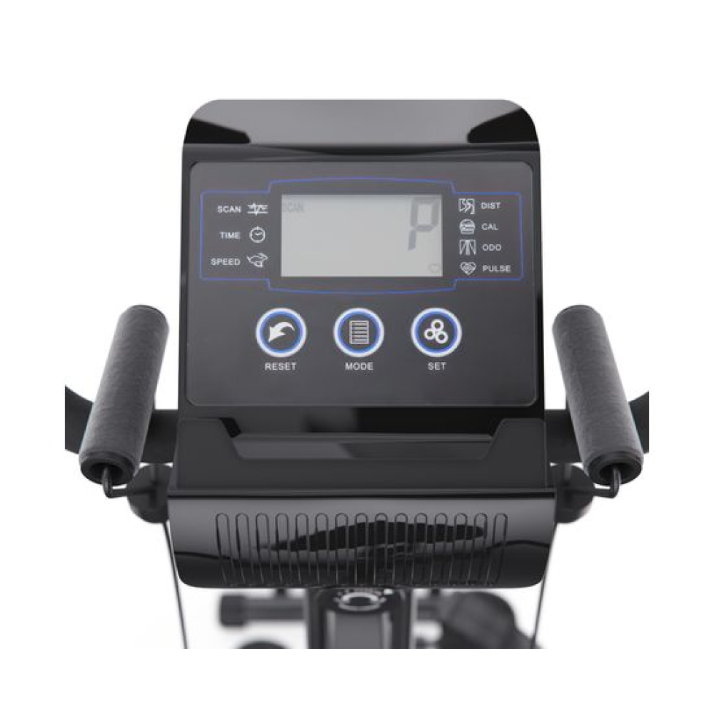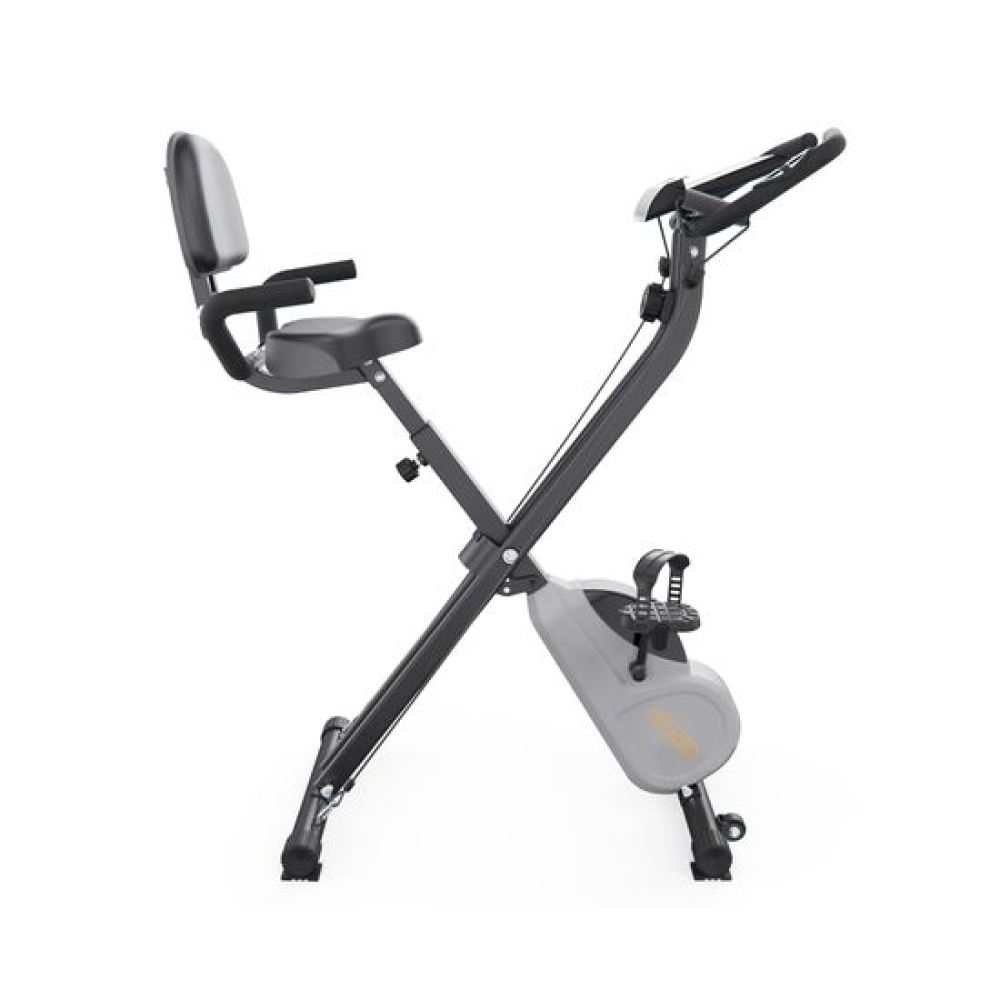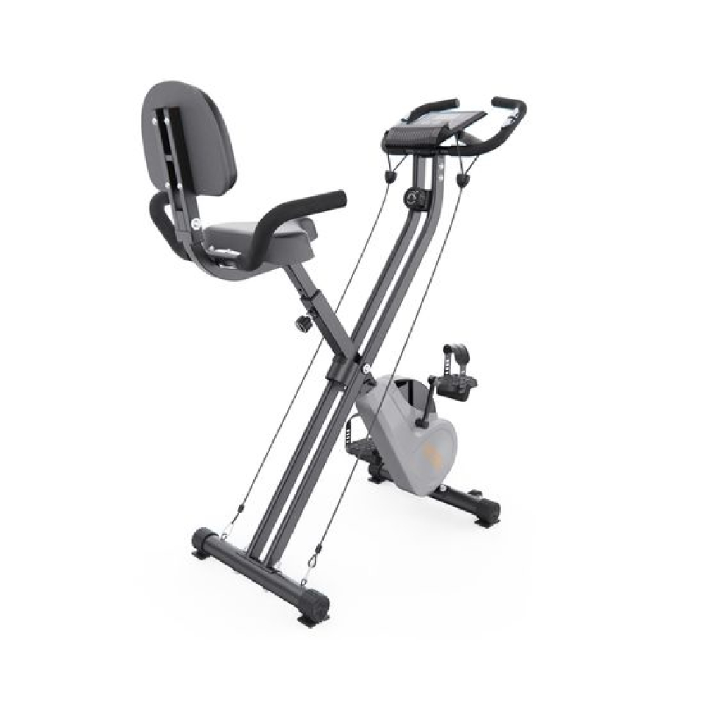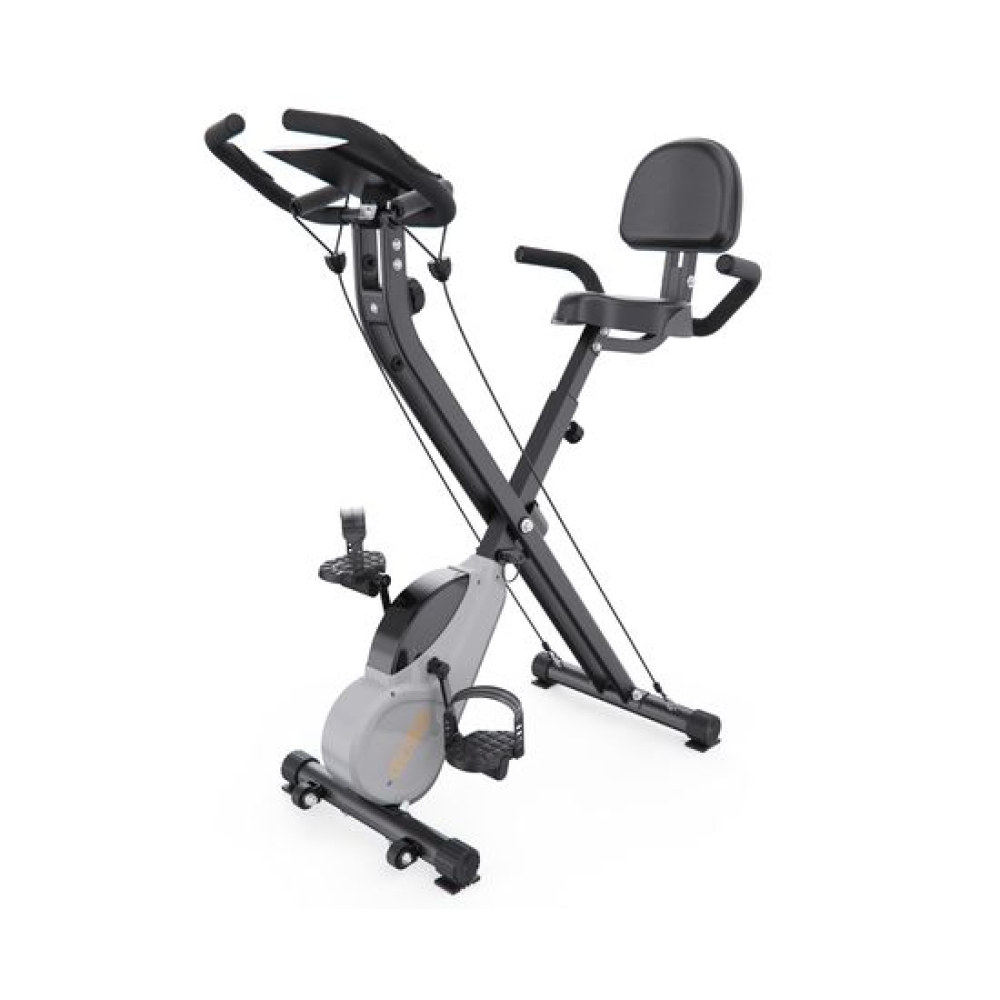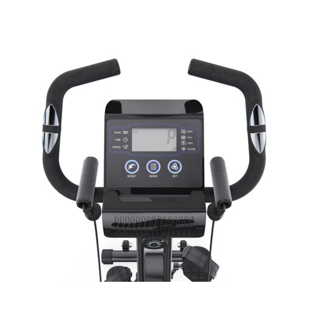 Вертикальный велотренажер с эспандерами DFC X-Bike BIFANUO — идеальный кардиотренажер для домашних тренировок. Этот велотренажёр представляет собой современный кардиотренажер для ног и рук домашний, который сочетает эффективную аэробную нагрузку с возможностью проработки мышц верхней части тела. Как велотренажер для ног, он обеспечивает качественную нагрузку на мышцы бёдер, ягодиц и икр, а встроенные эспандеры превращают его в полноценный тренажер для ног и рук.Максимальный вес пользователя – 110 кг, что делает тренажер кардио доступной для широкого круга людей. Модель подходит для пользователей с разным уровнем подготовки – от новичков до опытных спортсменов.Тренажер для ног оснащен 8 уровнями нагрузки, которые регулируются механически. Инерционный вес маховика 3 кг. Магнитная система сопротивления обеспечивает плавный и бесшумный ход, что делает тренировки комфортными даже вечером или ранним утром.Встроенный монохромный LCD-дисплей отображает ключевые параметры: скорость, время, дистанцию, пульс, количество сожженных калорий и режим сканирования данных. Работает дисплей от 2-х батареек ААА, идущих в комплекте.Эргономичное сиденье с 6 уровнями регулировки по высоте (от 78,5-87,5 см от пола) позволяет настроить тренажер под любой рост. Размер сиденья равен 26,5 х 23,5 х 5 см, а размер спинки 20,5 х 20,5 х 5 см. Педали с противоскользящим покрытием и регулируемым ремешком надежно удерживают стопу во время интенсивной тренировки. Датчики пульса на рукоятках помогают контролировать нагрузку без дополнительных устройств.Благодаря складной конструкции тренажер легко хранить даже в небольших помещениях. В сложенном виде его габариты составляют 33 х 41 х 134 см. Встроенные транспортировочные ролики позволяют без усилий перемещать его по комнате, а компенсаторы неровностей пола обеспечивают устойчивость на любой поверхности.В комплекте идут эспандеры длиной 120 см для проработки мышц рук и плеч. Подставка под планшет или смартфон делает тренировки более увлекательными – можно смотреть фильмы, сериалы или онлайн-уроки.Велотренажер домашний DFC X-Bike BIFANUO – это современный, функциональный и компактный тренажер для домашнего использования. Он поможет поддерживать форму, укреплять мышцы и улучшать общее самочувствие и здоровье!