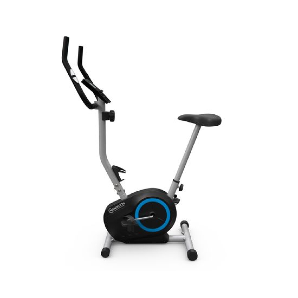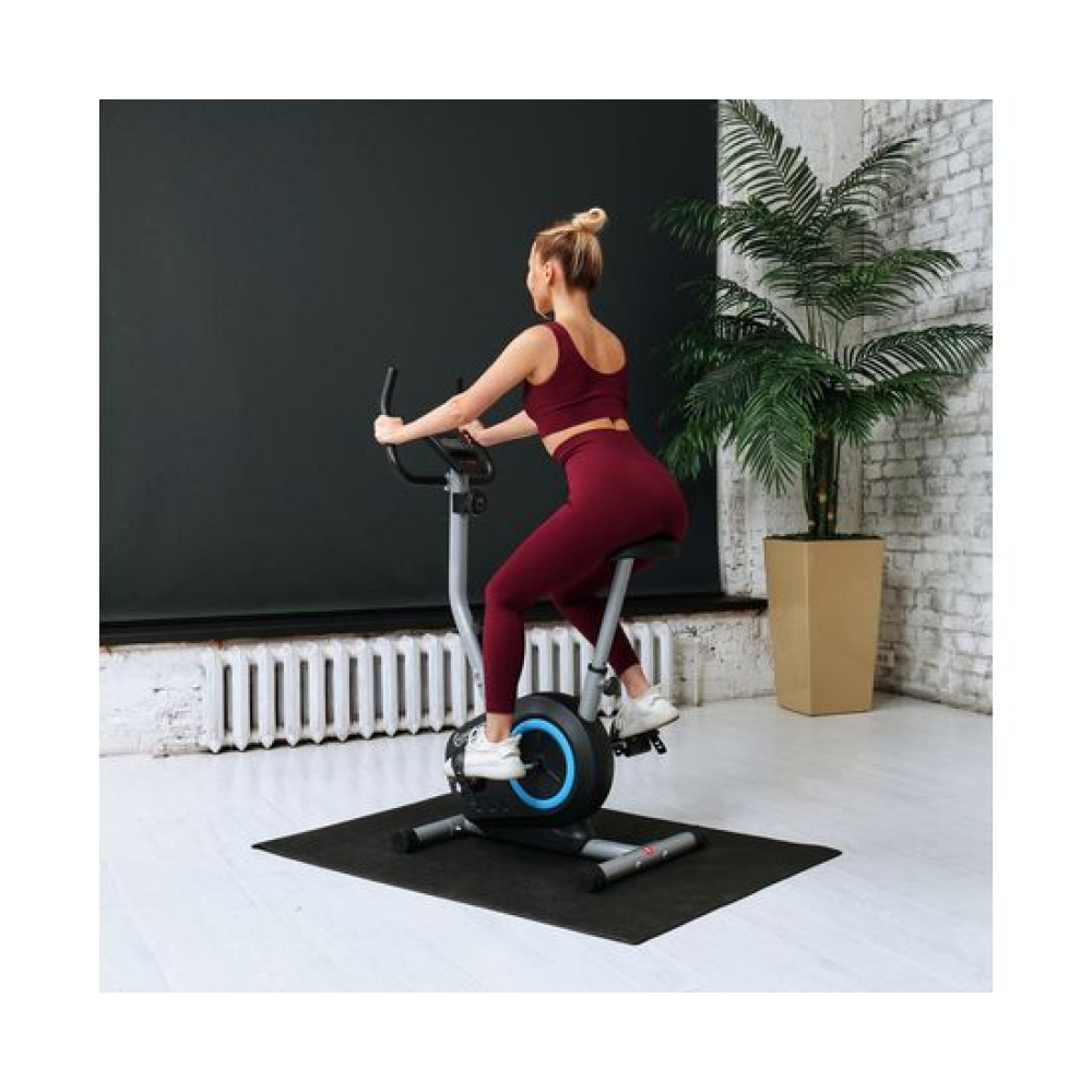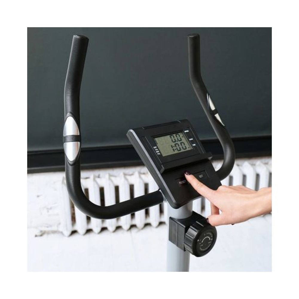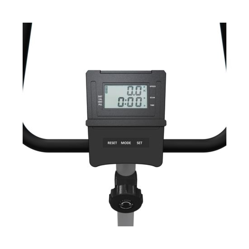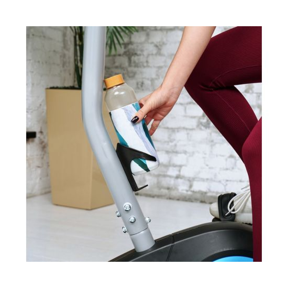 Компактный вертикальный тренажёр DFC Kondition 2309A предназначен для поддержания физической формы и улучшения здоровья. Максимально допустимый вес пользователя до 110 кг.Велотренажер оснащен инерционным маховиком весом 5 кг с возможностью крутить педали в обе стороны. Нагрузка осуществляется с помощью магнитной системы и регулируется механически на 8 уровней.Сиденье велотренажера регулируется по вертикали на 7 уровней от 80 до 94 см от пола, что позволяет настроить его под свой рост. Для отслеживания показаний во время тренировок, на поручнях велотренажера расположены сенсорные датчики пульса. Кроме того, велотренажер оснащен компенсаторами неровности пола, что позволяет стабильно использовать его на любой поверхности. Транспортировочные ролики для быстрого перемещения тренажёра.Помимо выдерживаемого веса спортсмена, данную модель выделяет наличие кармана для бутылки, а также подставки под планшет.Монохромный LCD дисплей велотренажера отображает следующие показатели: скан, скорость, время, калории, пульс и расстояние. Для работы консоли требуются 2 батарейки типа ААА (не входят в комплект).
