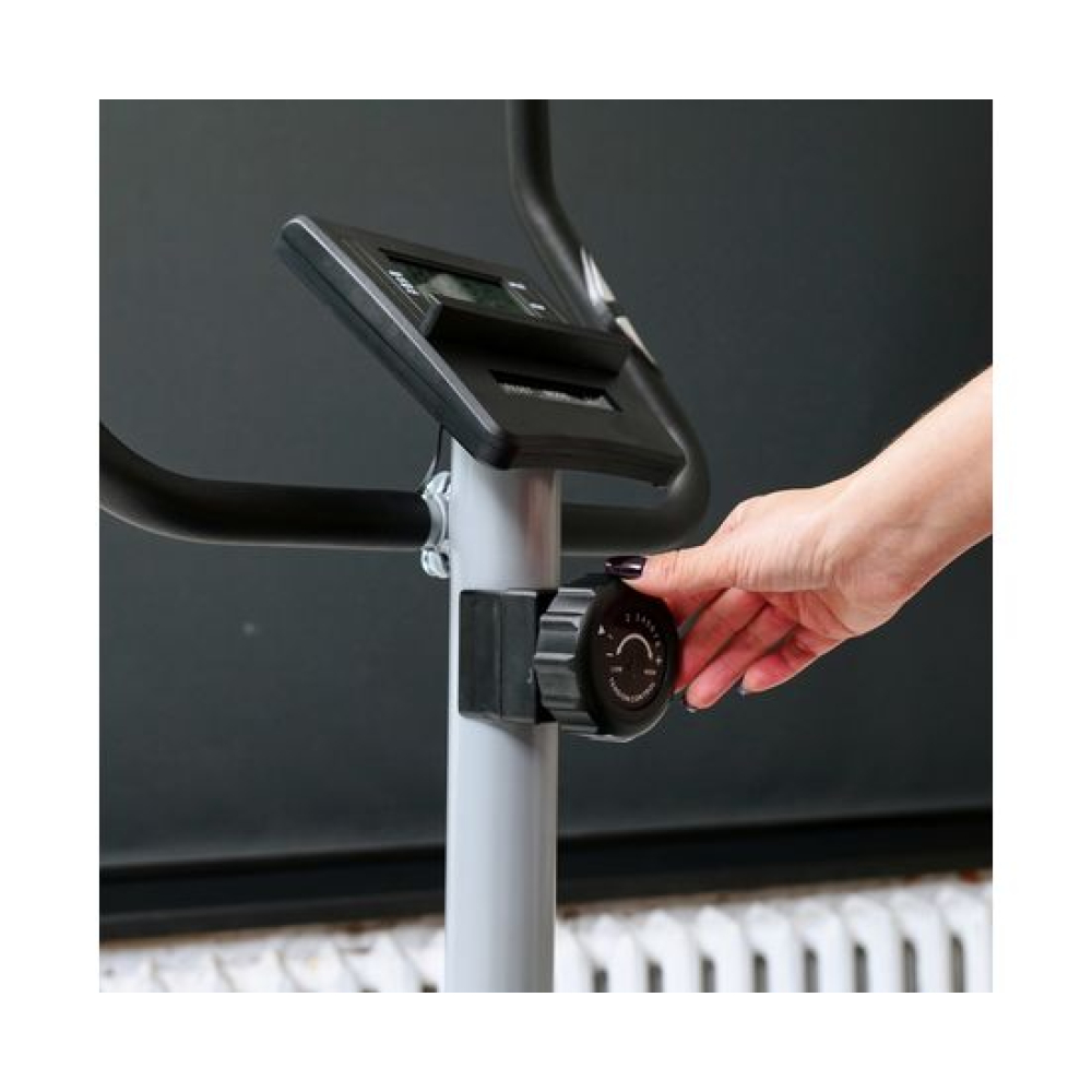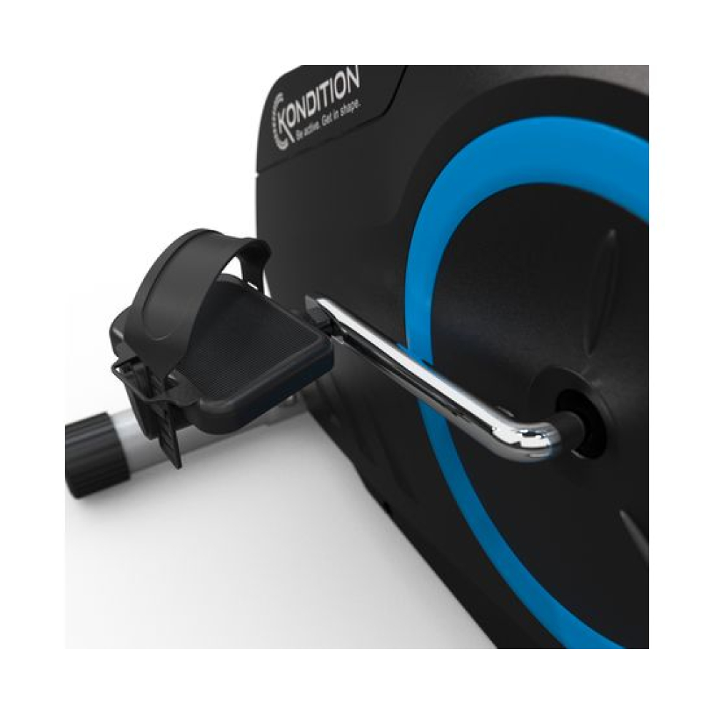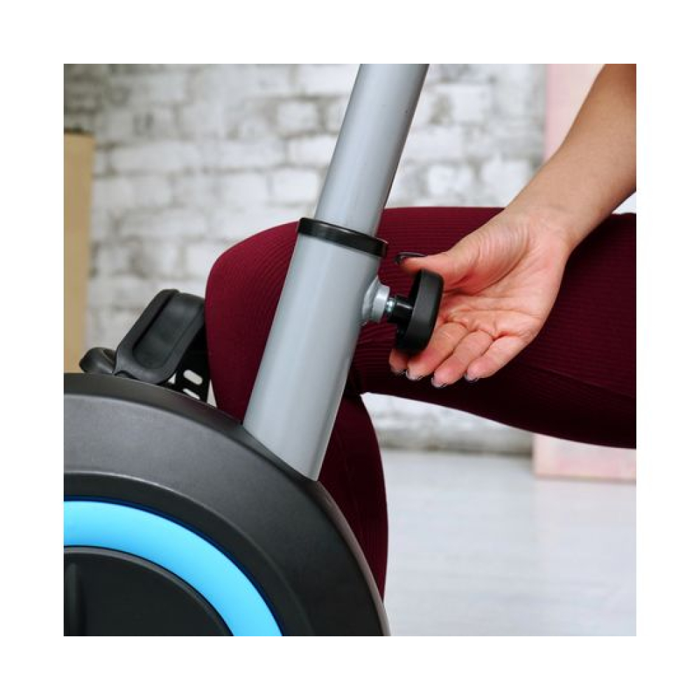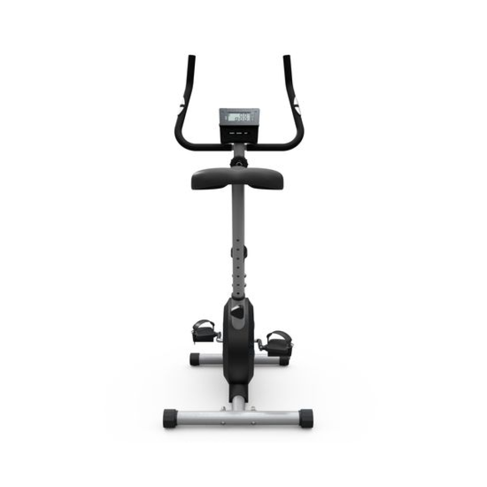 Компактный вертикальный тренажёр DFC Kondition 2309A предназначен для поддержания физической формы и улучшения здоровья. Максимально допустимый вес пользователя до 110 кг.Велотренажер оснащен инерционным маховиком весом 5 кг с возможностью крутить педали в обе стороны. Нагрузка осуществляется с помощью магнитной системы и регулируется механически на 8 уровней.Сиденье велотренажера регулируется по вертикали на 7 уровней от 80 до 94 см от пола, что позволяет настроить его под свой рост. Для отслеживания показаний во время тренировок, на поручнях велотренажера расположены сенсорные датчики пульса. Кроме того, велотренажер оснащен компенсаторами неровности пола, что позволяет стабильно использовать его на любой поверхности. Транспортировочные ролики для быстрого перемещения тренажёра.Помимо выдерживаемого веса спортсмена, данную модель выделяет наличие кармана для бутылки, а также подставки под планшет.Монохромный LCD дисплей велотренажера отображает следующие показатели: скан, скорость, время, калории, пульс и расстояние. Для работы консоли требуются 2 батарейки типа ААА (не входят в комплект).