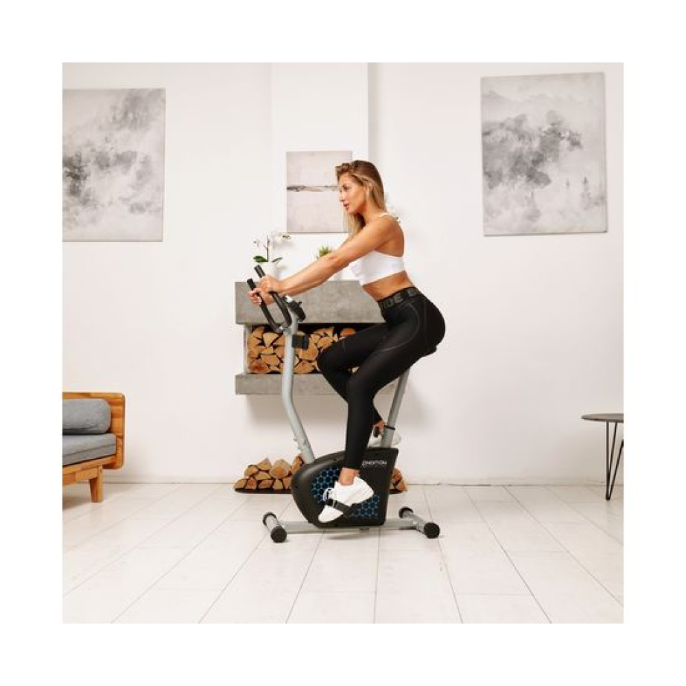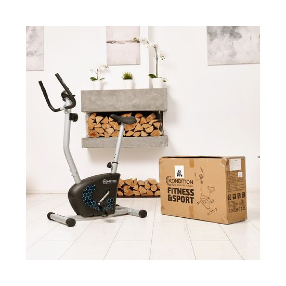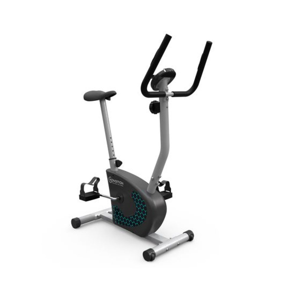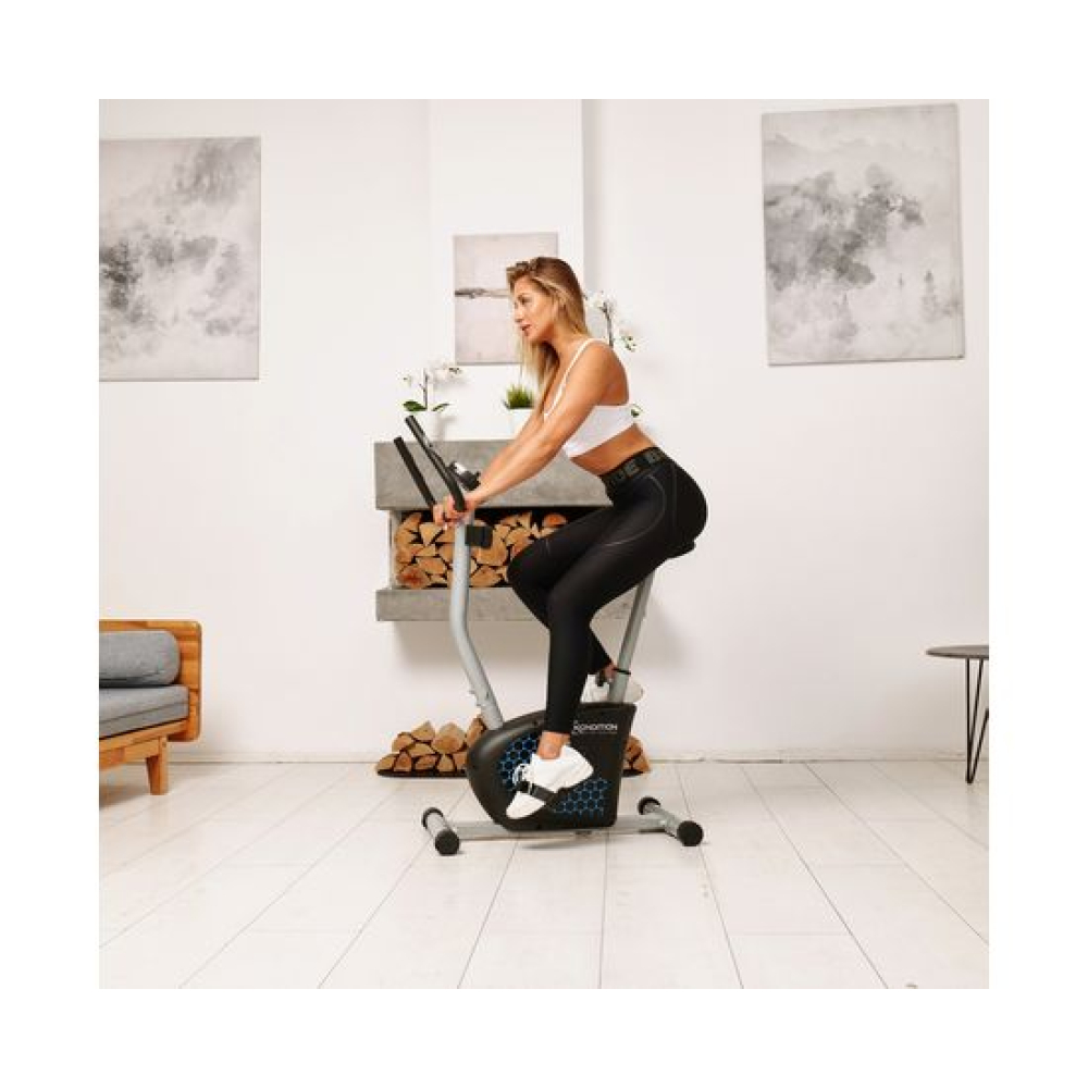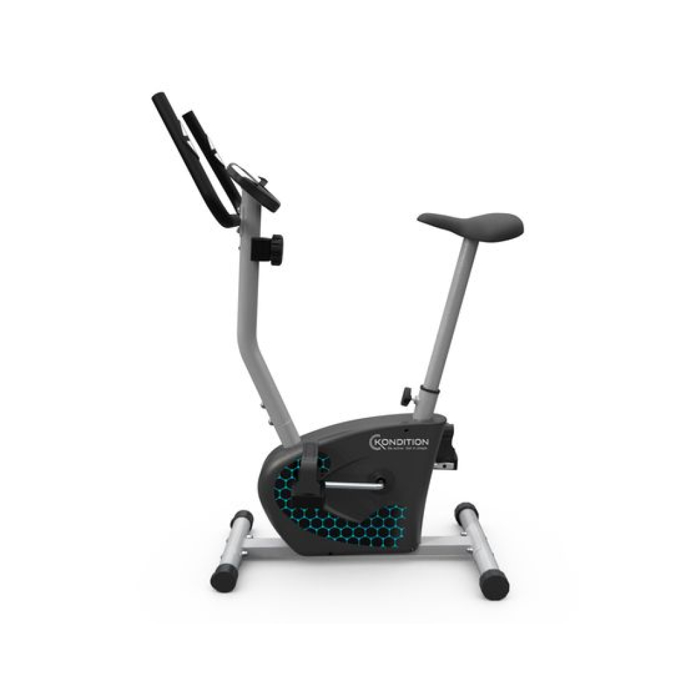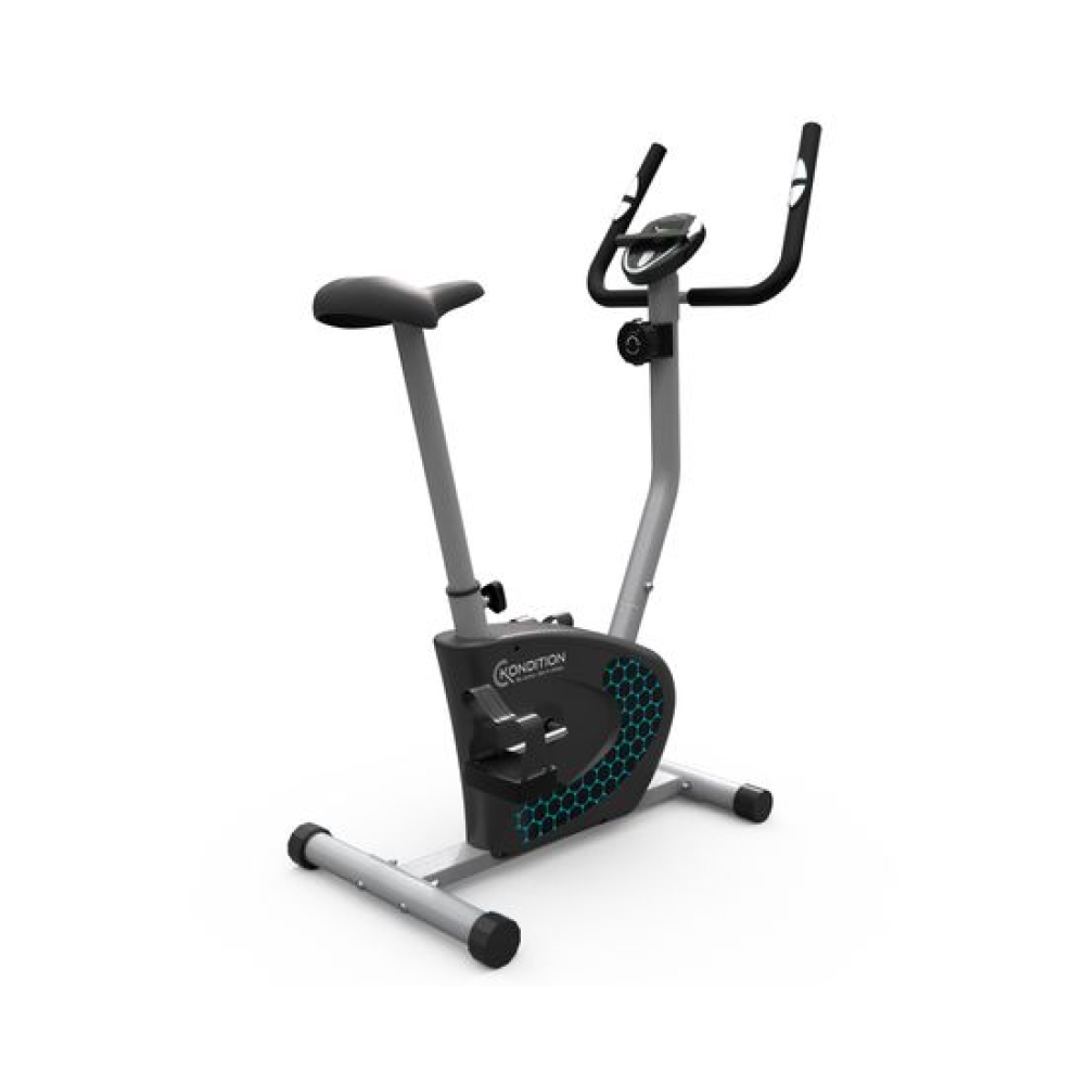 Достаточно компактный вертикальный тренажёр Kondition предназначен для поддержания физической формы и улучшения здоровья. Максимальный вес пользователя 100 кг.Велотренажер оснащен инерционным маховиком весом 5 кг с возможностью крутить педали в обе стороны. Нагрузка осуществляется с помощью магнитной системы и регулируется механически на 8 уровней.Сиденье велотренажера регулируется по вертикали на 7 уровней, что позволяет настроить его под свой рост. Для отслеживания показаний во время тренировок, на поручнях велотренажера расположены сенсорные датчики пульса. Кроме того, велотренажер оснащен компенсаторами неровности пола, что позволяет стабильно использовать его на любой поверхности.Монохромный LCD дисплей Kondition отображает следующие показатели: скан, скорость, время, калории, пульс и расстояние. Для работы консоли требуются 2 батарейки типа ААА (входят в комплект).