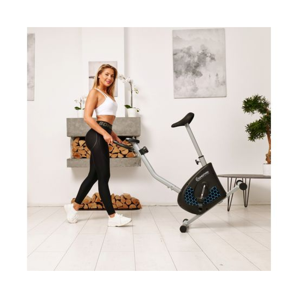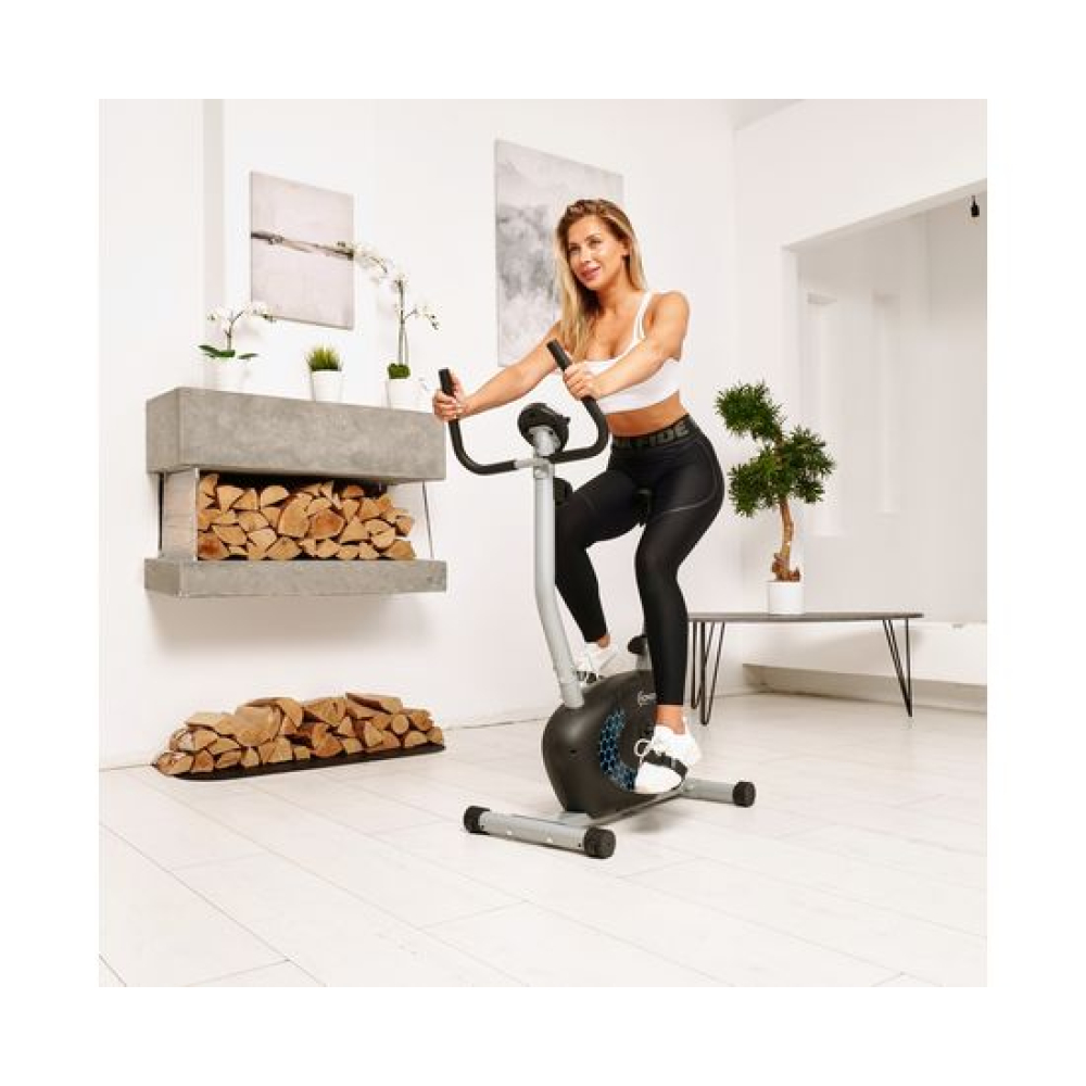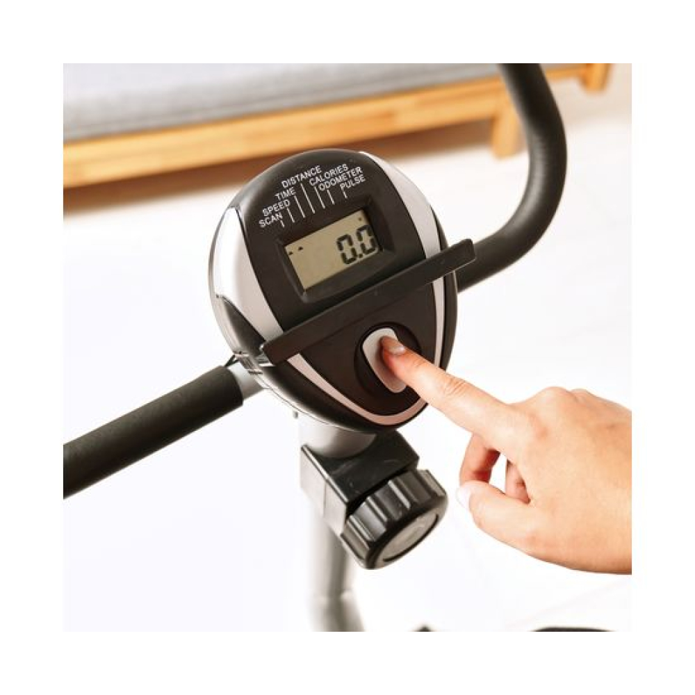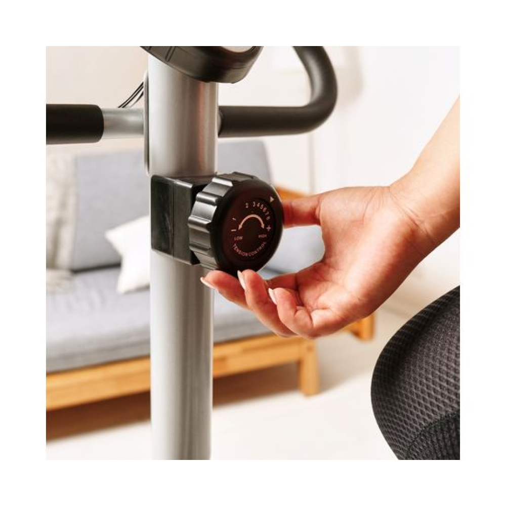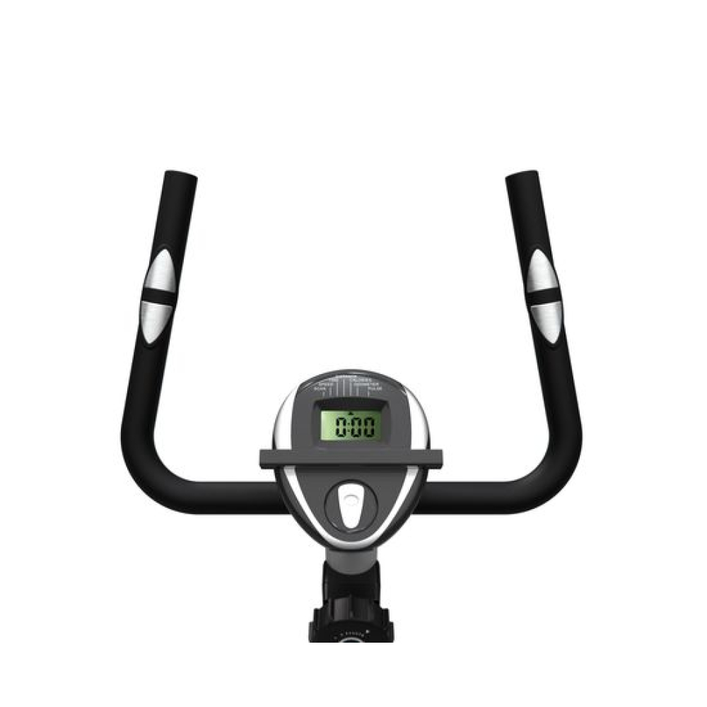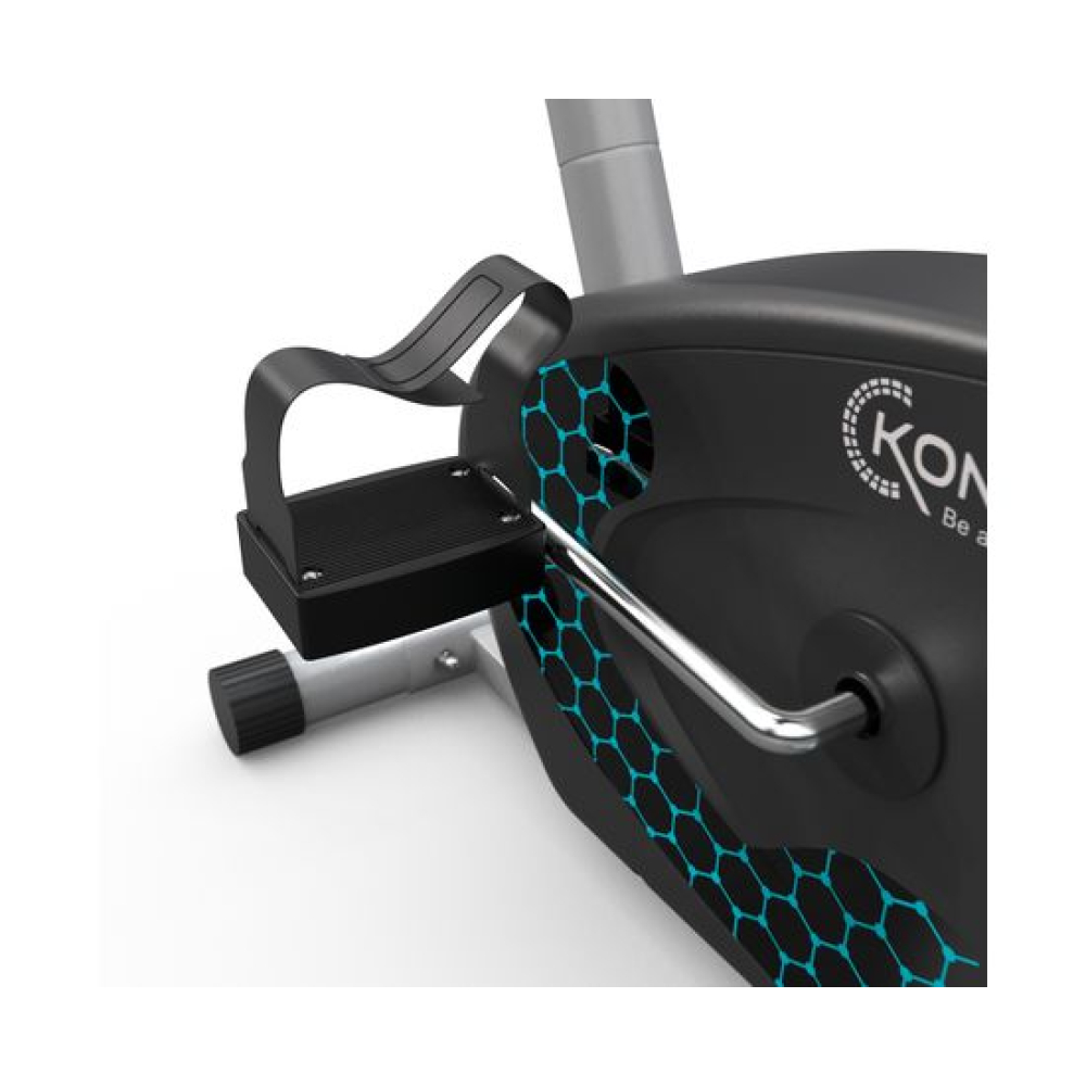 Достаточно компактный вертикальный тренажёр Kondition предназначен для поддержания физической формы и улучшения здоровья. Максимальный вес пользователя 100 кг.Велотренажер оснащен инерционным маховиком весом 5 кг с возможностью крутить педали в обе стороны. Нагрузка осуществляется с помощью магнитной системы и регулируется механически на 8 уровней.Сиденье велотренажера регулируется по вертикали на 7 уровней, что позволяет настроить его под свой рост. Для отслеживания показаний во время тренировок, на поручнях велотренажера расположены сенсорные датчики пульса. Кроме того, велотренажер оснащен компенсаторами неровности пола, что позволяет стабильно использовать его на любой поверхности.Монохромный LCD дисплей Kondition отображает следующие показатели: скан, скорость, время, калории, пульс и расстояние. Для работы консоли требуются 2 батарейки типа ААА (входят в комплект).