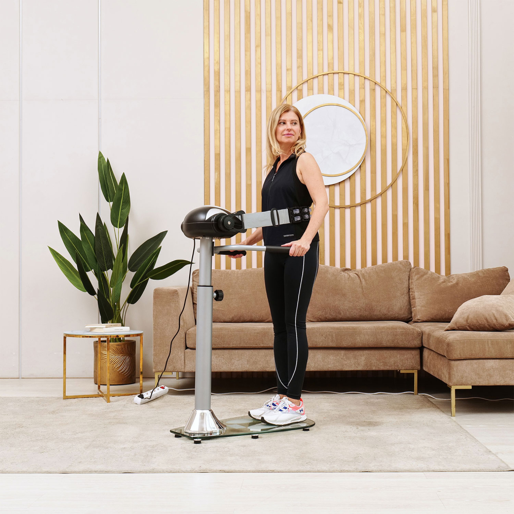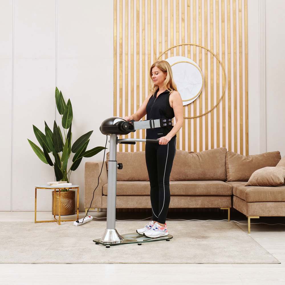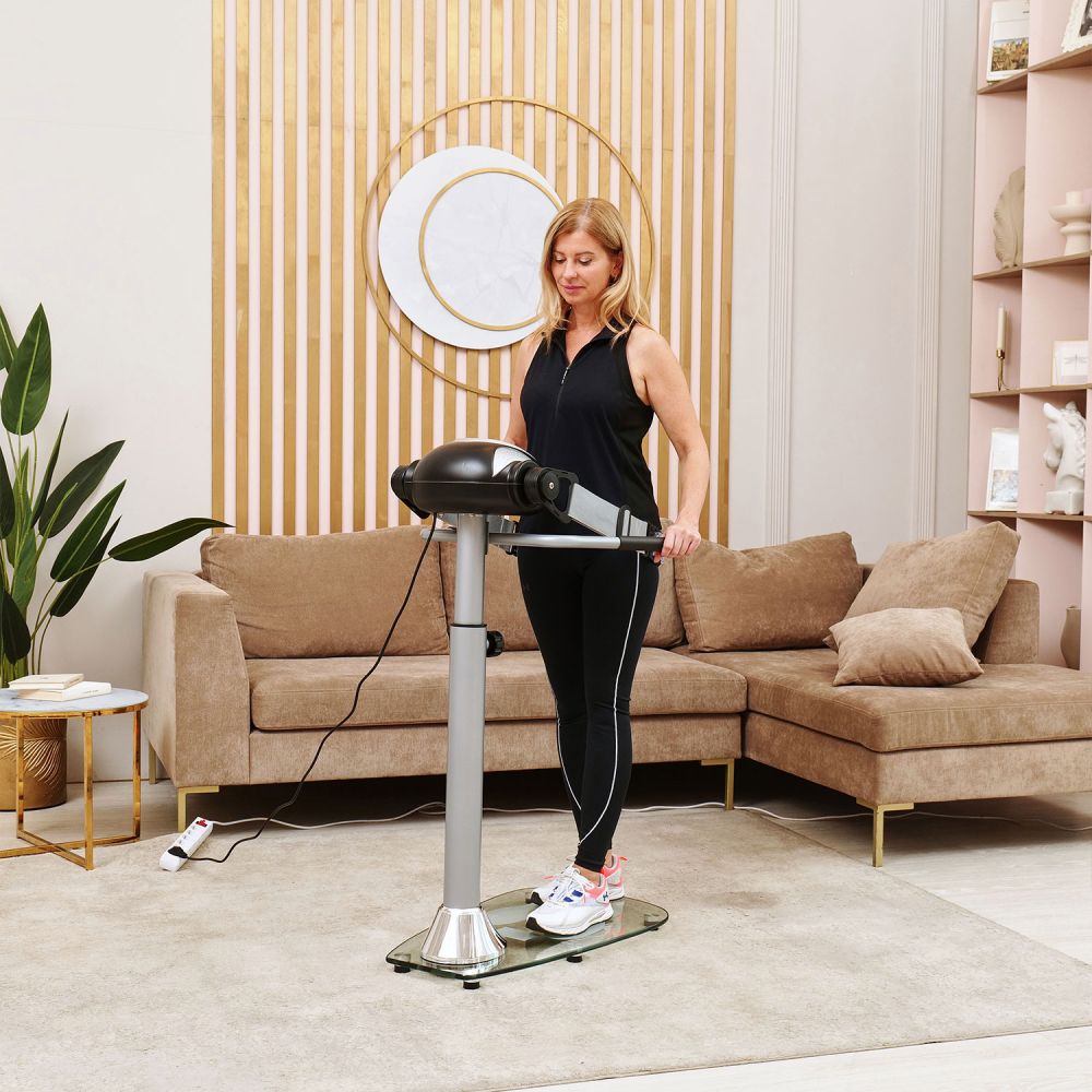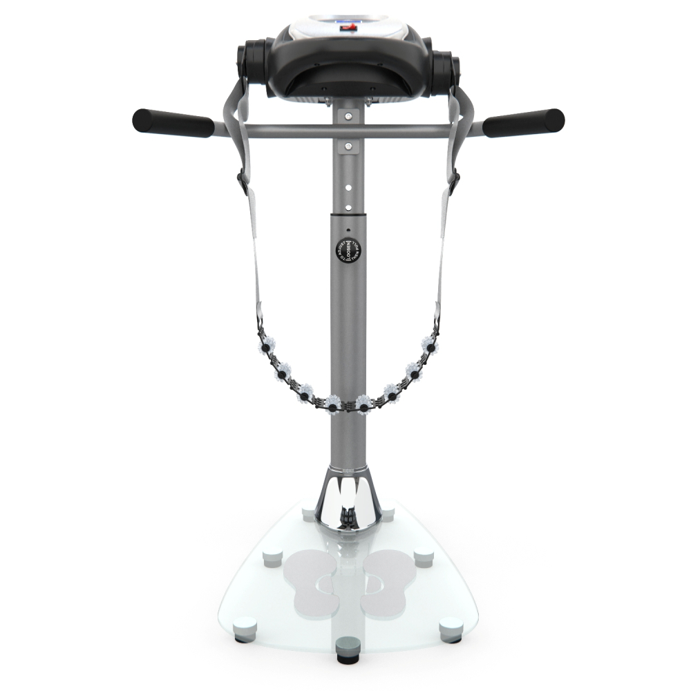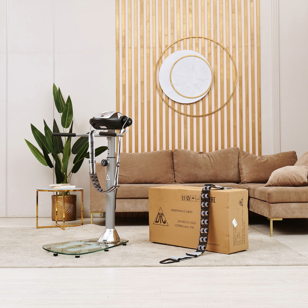 Ленточный вибромассажёр VM20 — лучший помощник для ваших мышц. Он помогает поддерживать в тонусе различные группы мышц, расслаблять их и снимать боль после тренировок, а также способствует быстрому расщеплению жировых клеток. При использовании на проблемных зонах помогает убрать «апельсиновую корку». Два пояса в комплекте. Регулировка тренажёра Тренажёр позволяет регулировать высоту консоли в 5-ти положениях по вертикали. Массажёр VM20 работает на 20-ти разных скоростных режимах, которые вы сможете подобрать в зависимости от задач и области воздействия. Мотор постоянного тока мощностью 100 Ватт. Есть 6 встроенных режимов тренировки, а также ручной, обратный отсчёт времени и калорий. Удобство конструкции Массажёр имеет компактную и надёжную конструкцию. В качестве основания использована гальваническая труба диаметром 76 мм и толщиной 1,5 мм. Платформа выполнена из закалённого стекла. Максимально допустимый вес пользователя — 110 кг. В комплектацию входят 2 массажных пояса, которые крепятся к передней консоли. Для удобства и безопасности предусмотрены два поручня по бокам. Мультимедиа Консоль с панелью управления оснащена монохромным дисплеем с подсветкой яркого синего цвета. На нём отображаются данные тренировки: время, скорость работы ремня, выбранная программа, затраченные калории. Поручень консоли с массажными выпуклостями.