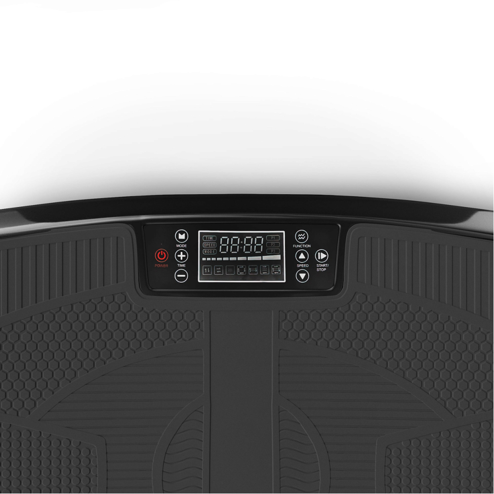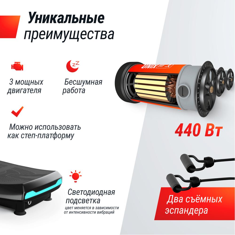 Ищете способ без мучений улучшить физическую форму, сжечь калории и укрепить мышцы? Виброплатформа UNIX Fit Boost 4D Black— это универсальный тренажер для вас! . . Преимущества виброплатформы:. . 1. Эффективные тренировки: Вибрации активируют до 90% мышц, что позволяет достигать результатов быстрее, чем при классических упражнениях.. . 2. Удобство использования: Компактный и стильный дизайн позволяет легко разместить вибро тренажер в любом уголке вашего дома. Подходит для использования как новичками, так и опытными спортсменами.. . 3. Многофункциональность: Платформа предлагает различные режимы вибрации и интенсивности, а также 7 ручных и 3 автоматические программы, что позволяет адаптировать тренировки под ваши цели — от похудения до укрепления мышц.. . 4. Улучшение кровообращения: Регулярные занятия на вибротренажере способствуют улучшению циркуляции крови, что положительно сказывается на общем состоянии здоровья, а также помогает прокачать мышцы ног, бедер и пресса. Эспандеры позволяют задействовать мышцы рук во время занятий на виброплатформе для фитнеса. . . 5. Снижение нагрузки на суставы: Вибрации уменьшают ударную нагрузку на суставы, что делает тренировки безопасными даже для людей с проблемами опорно-двигательного аппарата. Максимальный вес пользователя 150 кг. . . 6. Легкость в использовании: Пульт управления в виде наручных часов делает использование платформы простым и удобным. Вы можете менять режимы прямо во время тренировки. Тренажером также можно управлять с встроенной панели управления. Цвет LED индикатора указывает на выбранный режим.. . 7. Компактность и мобильность: Легкая конструкция позволяет легко перемещать домашний тренажер и хранить его даже в небольших помещениях.. . С помощью виброплатформы вы сможете эффективно тренироваться в любое время и в любом месте. Это отличный способ разнообразить тренировки и сделать их более интересными!. . Рекомендованные упражнения. 1. Положите плечи на пол и лягте, поставив обе стопы на тренажер. Держите колени вместе и поднимите бедра. Медленно поднимая корпус, отрывайте от пола пятки, чтобы напрячь бедра и таз. Это позволит тренировать мышцы бедер. . 2. Встаньте на тренажер, держите ноги и плечи на одной линии, руки положите на талию. Вращайте корпусом по часовой стрелке в течение нескольких секунд, затем вернитесь в исходное положение и повторите движение в противоположном направлении. Во время выполнения этого упражнения вы можете использовать эластичные тросы. Держите их перед собой на уровне плеч и поворачивайте руки влево и вправо. Это позволит тренировать мышцы живота, в том числе косые мышцы.. 3. Стоя на тренажере, возьмитесь за тросы и вытяните руки по бокам до уровня пояса. Направляя ладони вниз и слегка согнув руки в локтях, поднимите обе руки до уровня плеч, а затем опустите их. Повторите несколько раз.. 4. Встаньте на тренажер. Держите тросы перед грудью, чтобы ладони были обращены друг к другу. Медленно опустите руки назад, к спине и позвольте им разогнуться и выпрямиться. Затем верните их в исходное положение. Вы можете чередовать руки или выполнять движения обеими руками одновременно. Чтобы повысить эффективность упражнений, выполняйте их стоя на коленях или делая выпады.. .