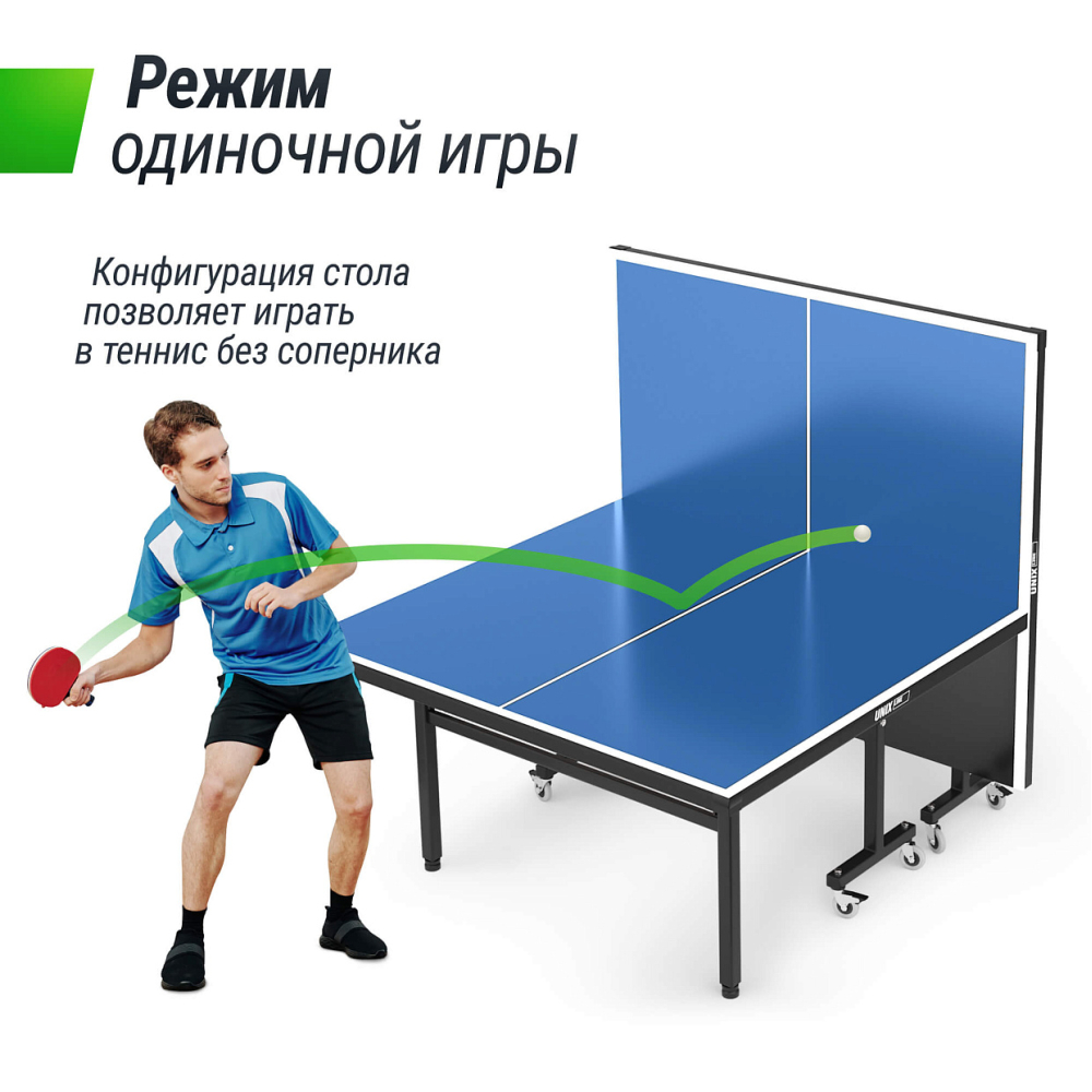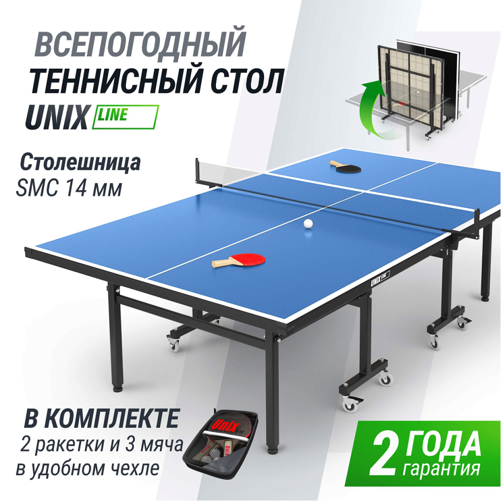 Всепогодный стол для настольного тенниса UNIX Line Outdoor 14mm разработан специально для использования на площадках под открытым небом. Теннисный стол состоит из двух независимых половинок с технологией складывания Compact. Удобное складывание и жесткая фиксация столешницы позволяют играть одному. Столешница всепогодного стола UNIX Line изготовлена из SMС - панели с антибликовым покрытием и выдерживает многочисленные нагрузки, мм обладает хорошей устойчивостью к ударам, воздействию окружающей среды, влаге и температурным перепадам. Она не является горючим материалом, и за счет высокой плотности и толщины столешницы (14 мм) обеспечивает великолепный отскок мяча во время игры. Металлическая рама теннисного стола UNIX Line имеет толщину стали 1,4 мм, размеры профилей составляют 20х40 и 40х40 мм. Благодаря таким характеристикам конструкции, теннисный стол сохраняет жесткость и устойчивость на любых покрытиях. Опоры теннисного стола оборудованы компенсаторами неровности. Для комфортного перемещения теннисный стол имеет 8 прорезиненных колес Ø75 мм с подшипниками. Все колеса маневровые и обладают высокой износостойкостью, 4 из них оборудованы фиксаторами. Сетка из нейлона с надежными фиксаторами, а также набор для игры в настольный теннис: 2 ракетки, 3 шарика в сумке, поставляются в комплекте со столом. Укрывной универсальный чехол для стола не входит в комплект и приобретается отдельно. Защищает от мелкого мусора и листвы. .